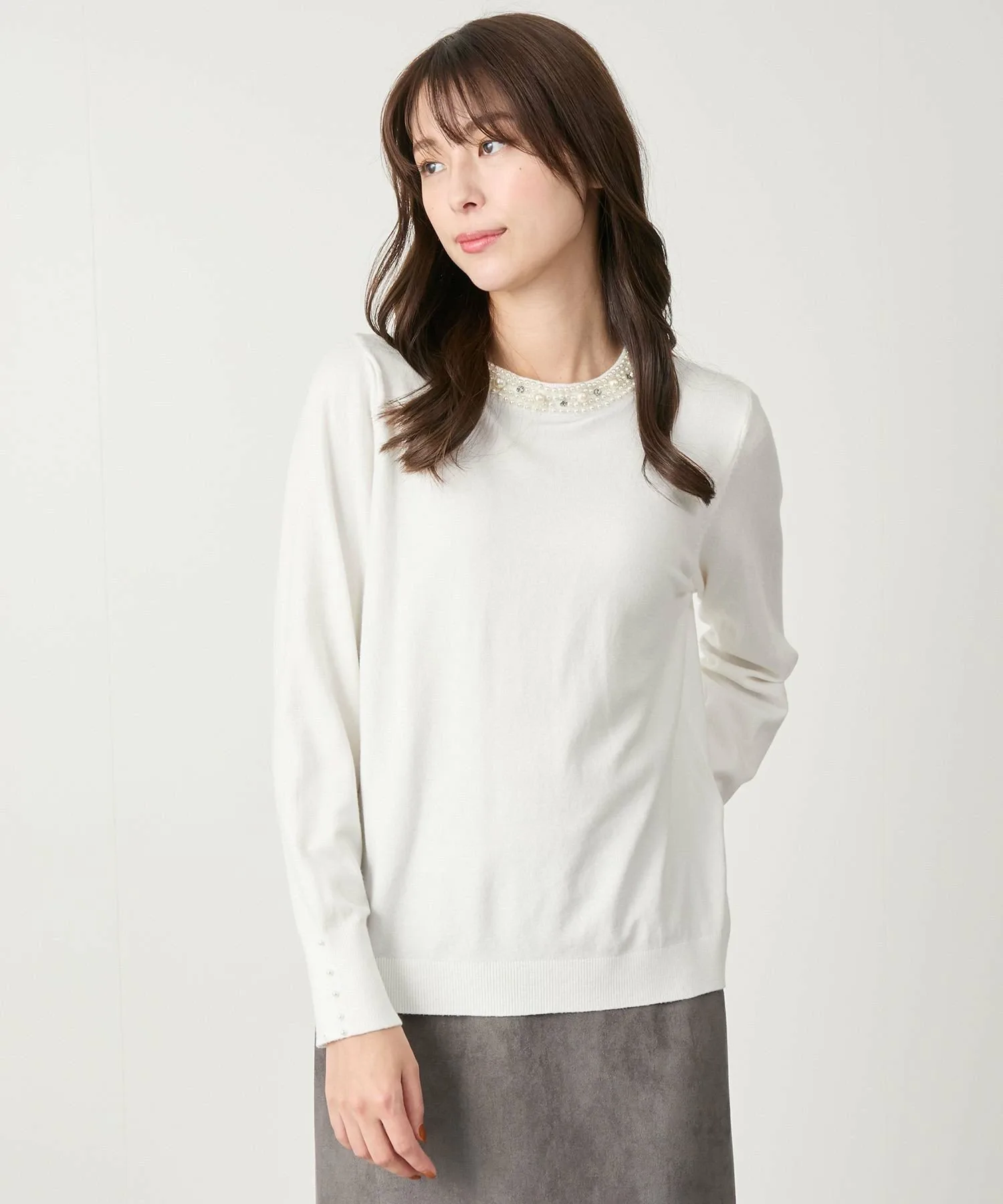 Этот вязаный пуловер украшен жемчужинами и стразами на воротнике.