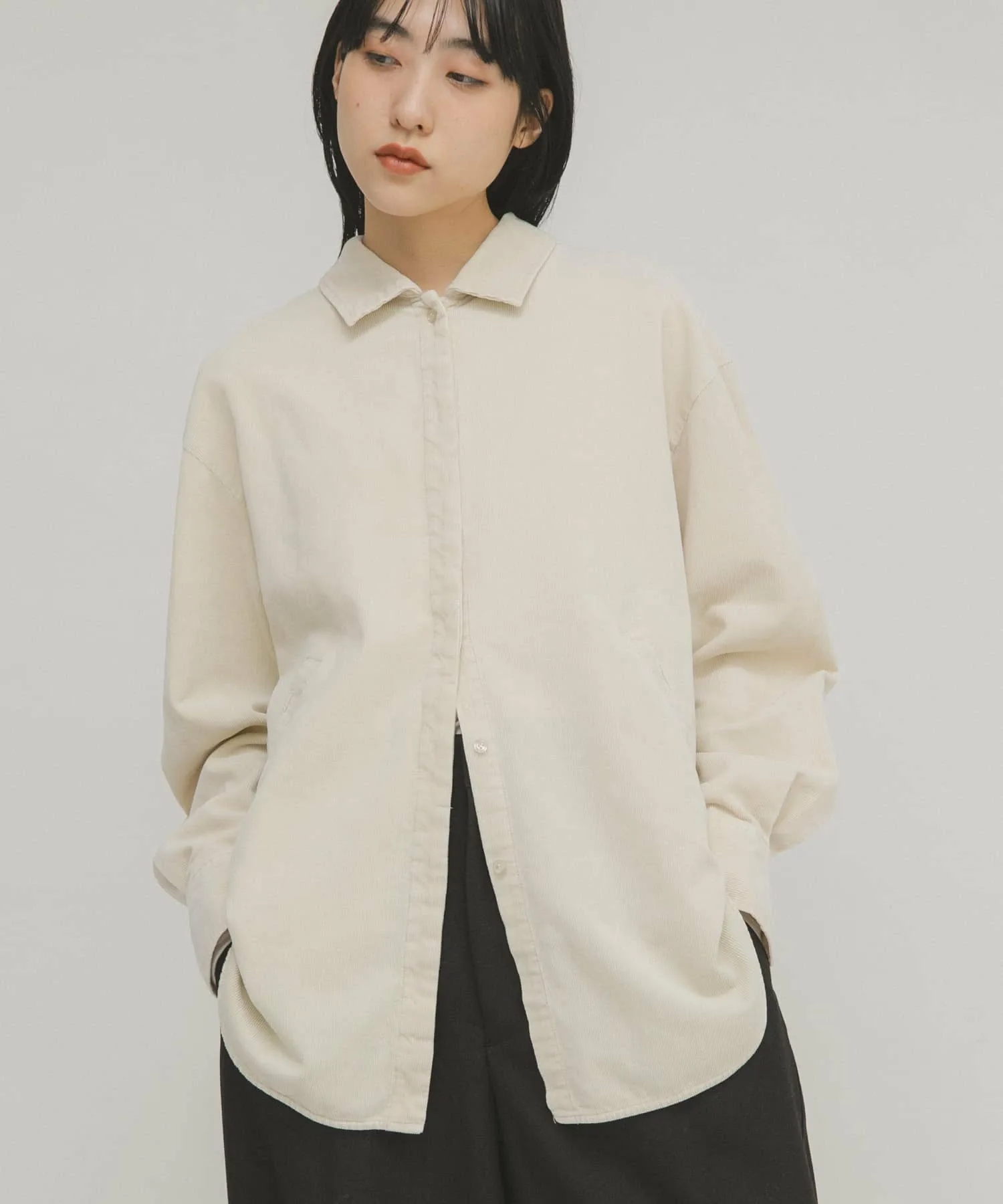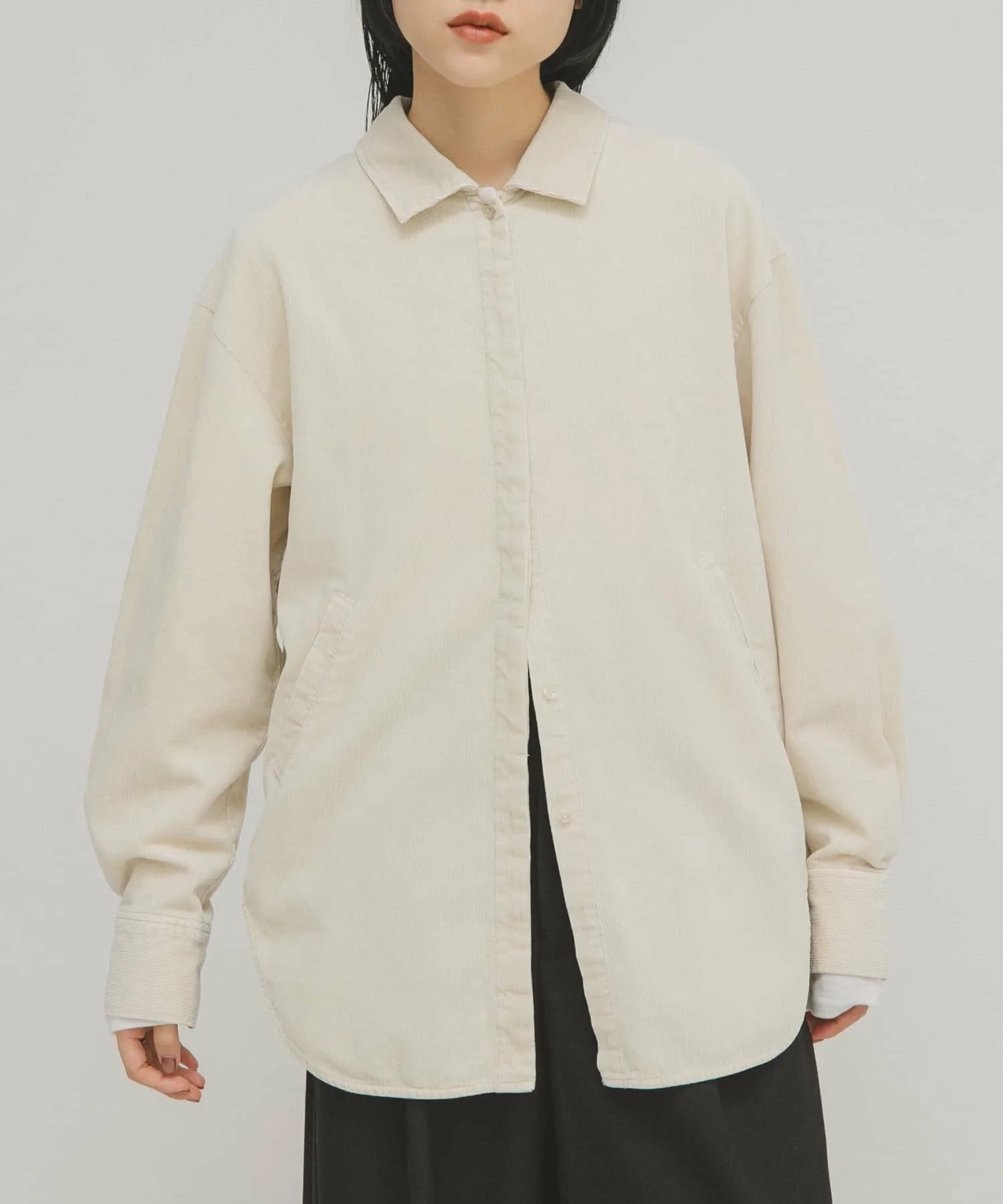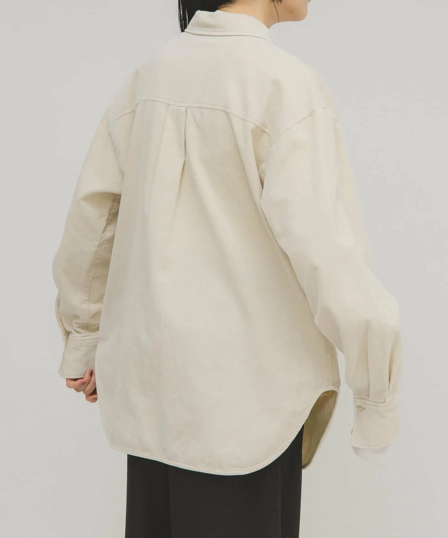 Эта вельветовая рубашка имеет винтажную текстуру, что делает ее стильной в носке. Она оснащена накладными карманами, как у верхней одежды, что придает ей вид блузона. Мы рекомендуем сочетать ее с прямыми вельветовыми брюками (KBA7-24R200), изготовленными из того же материала.
