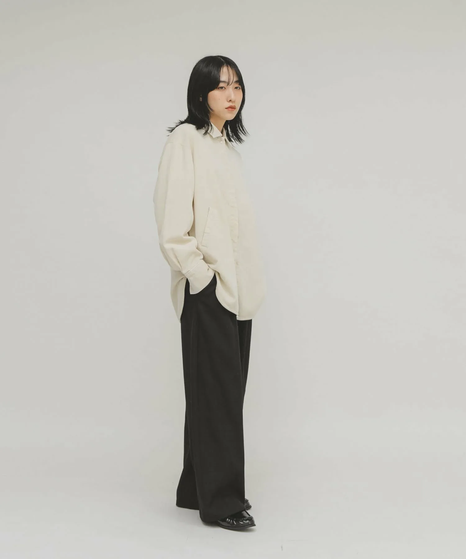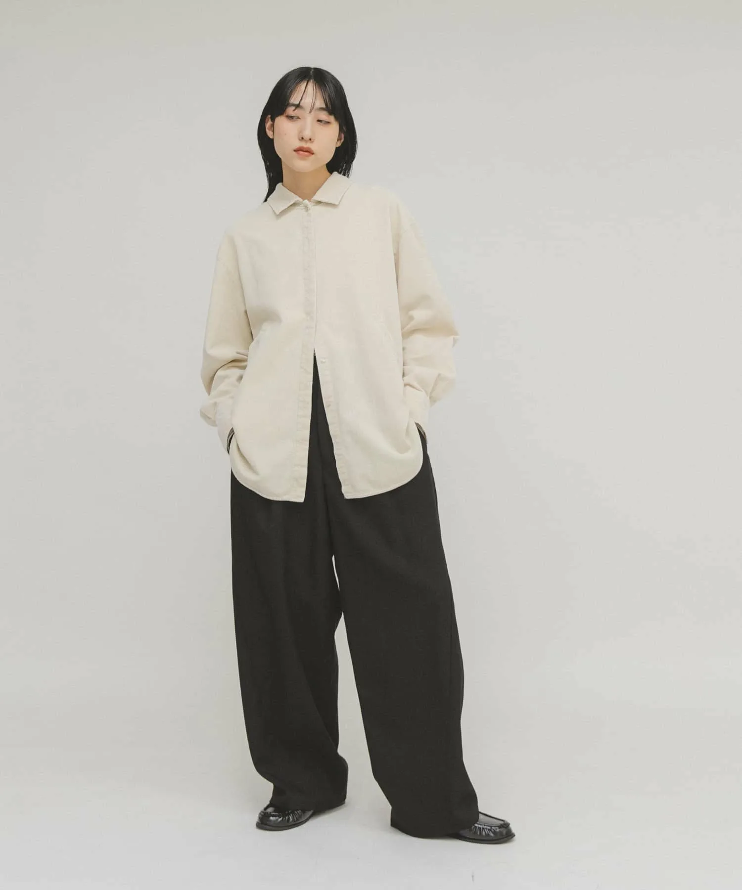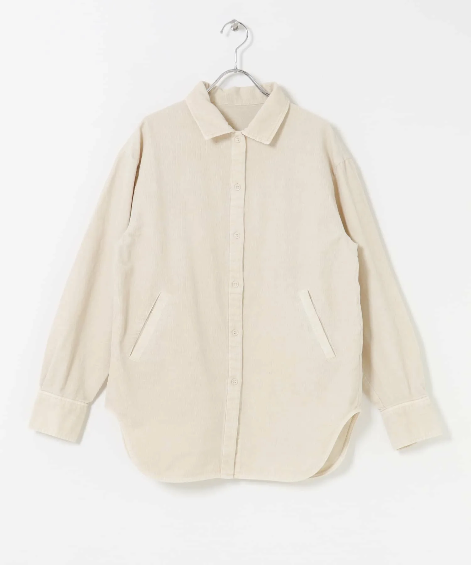 Эта вельветовая рубашка имеет винтажную текстуру, что делает ее стильной в носке. Она оснащена накладными карманами, как у верхней одежды, что придает ей вид блузона. Мы рекомендуем сочетать ее с прямыми вельветовыми брюками (KBA7-24R200), изготовленными из того же материала.
