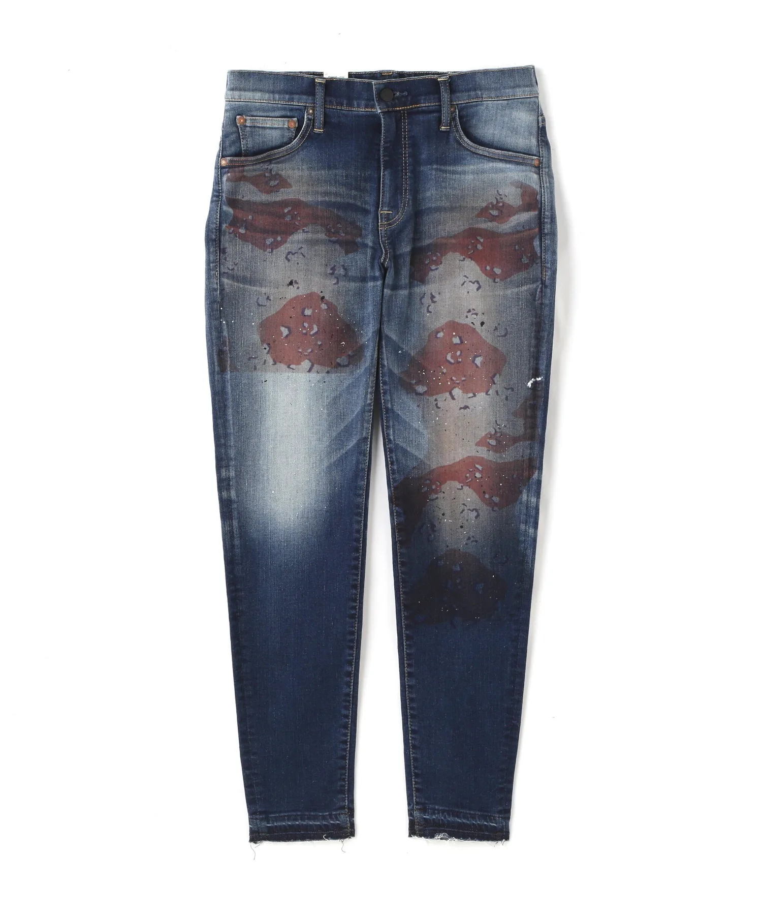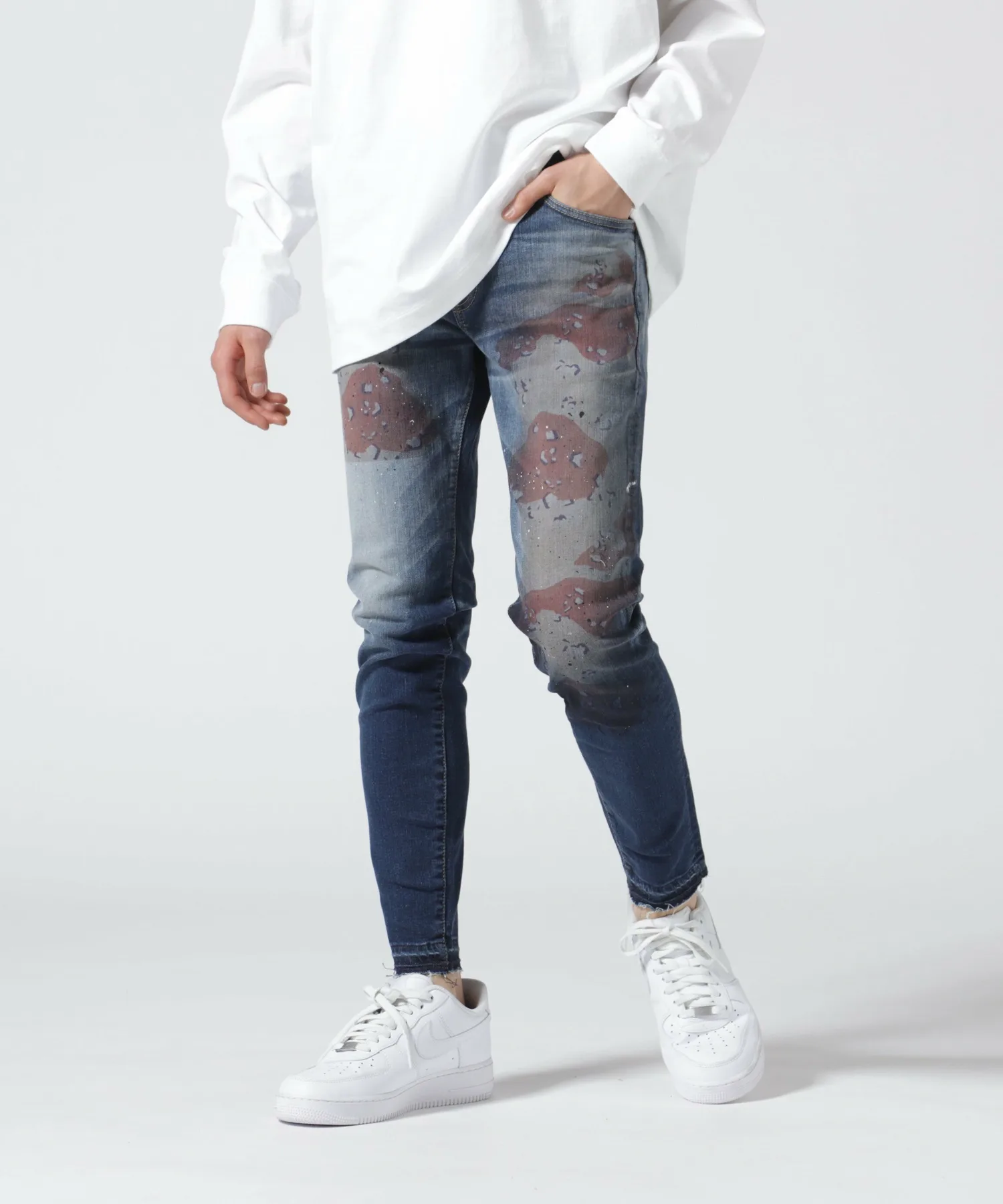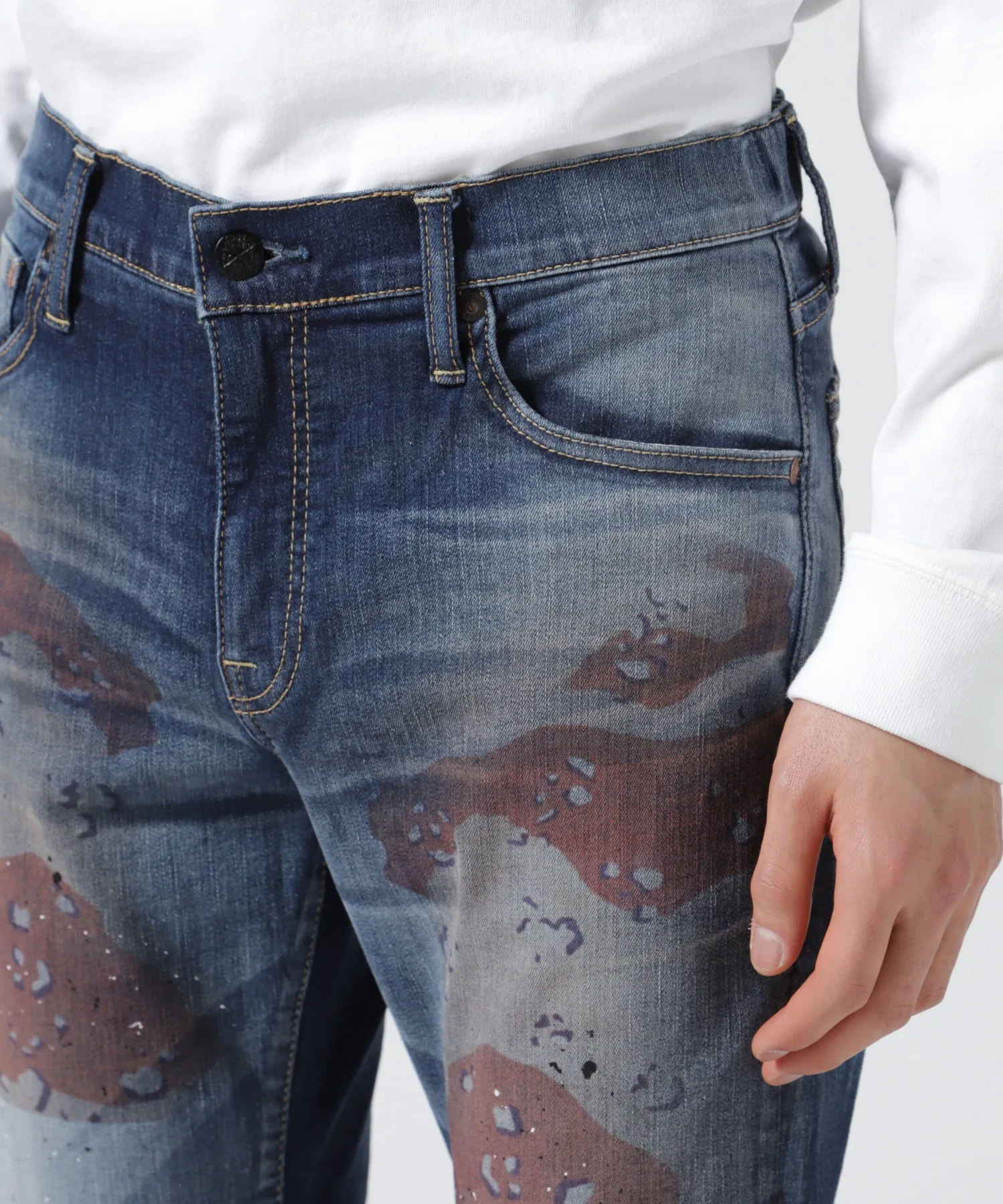 Эти джинсы украшены камуфляжным принтом и брызгами краски для смелого образа.