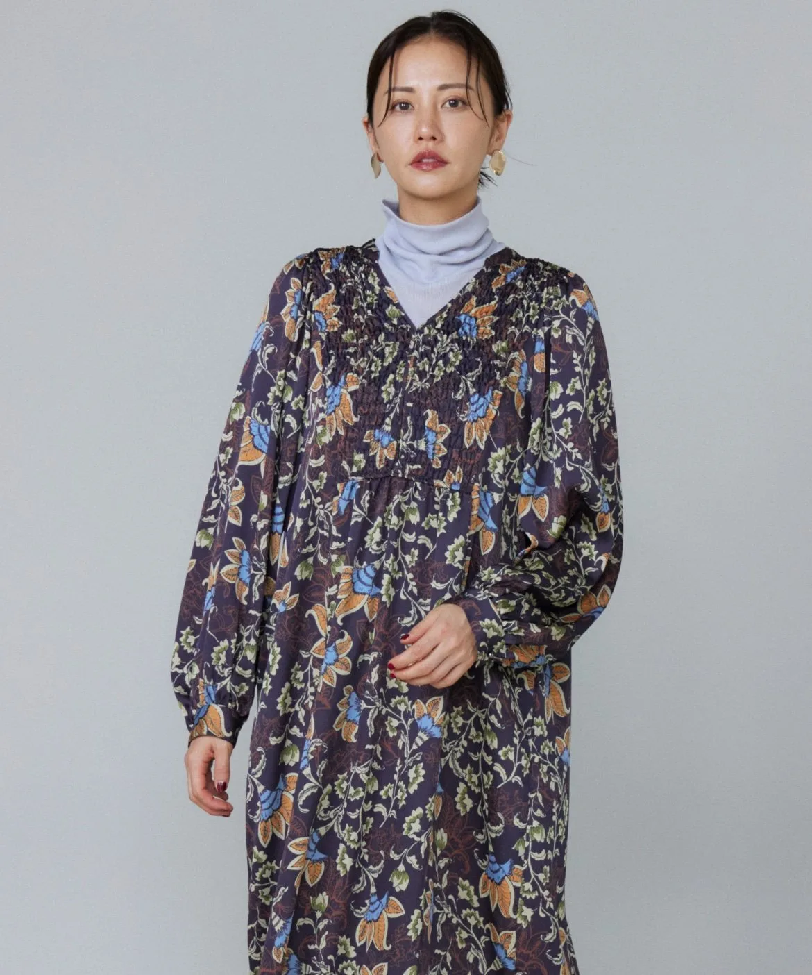 Богемный цветочный принт в винтажном стиле. Ткань креп-атлас добавляет элегантности. Легкий, гладкий и комфортный материал обеспечивает удобную драпировку. Этот оригинальный принт выполнен из материала Viscotex от Seiren Co., Ltd., обладающего насыщенной цветовой гаммой.