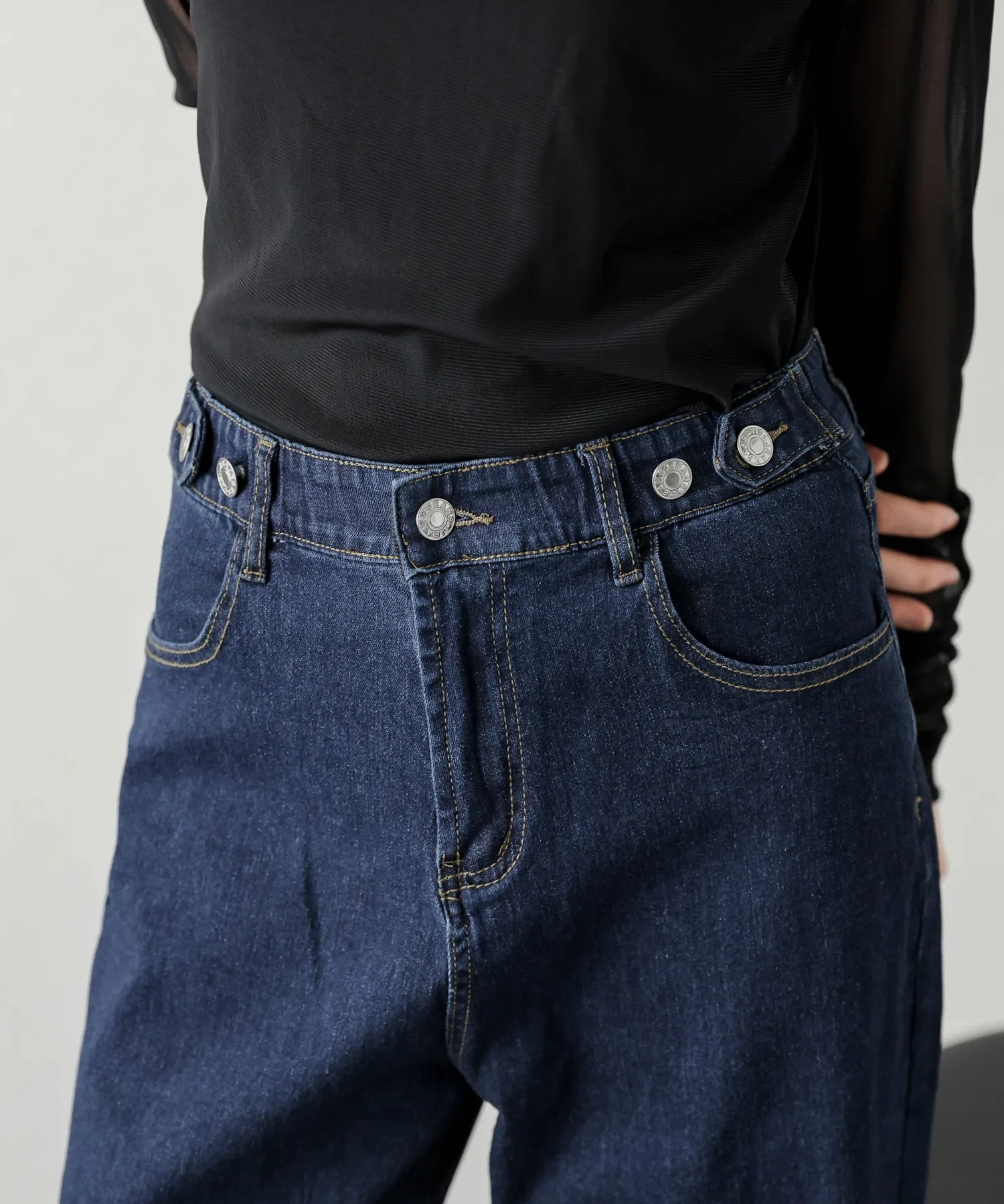 Застежка на талии регулируется в два этапа, что позволяет легко надевать брюки даже на узкую фигуру.