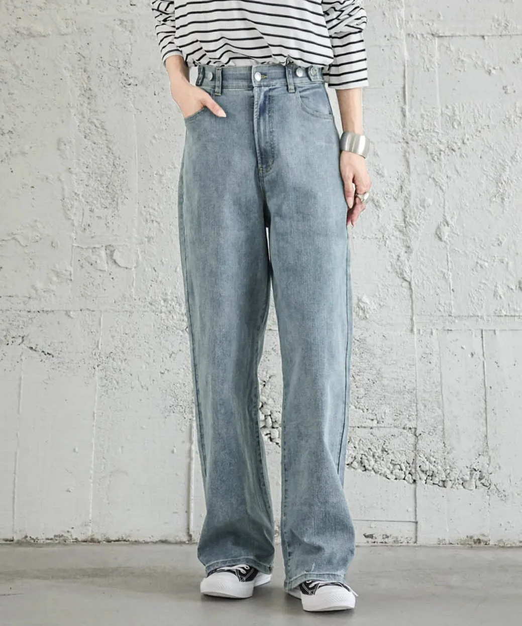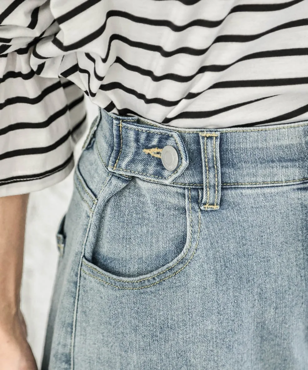 Застежка на талии регулируется в два этапа, что позволяет легко надевать брюки даже на узкую фигуру.