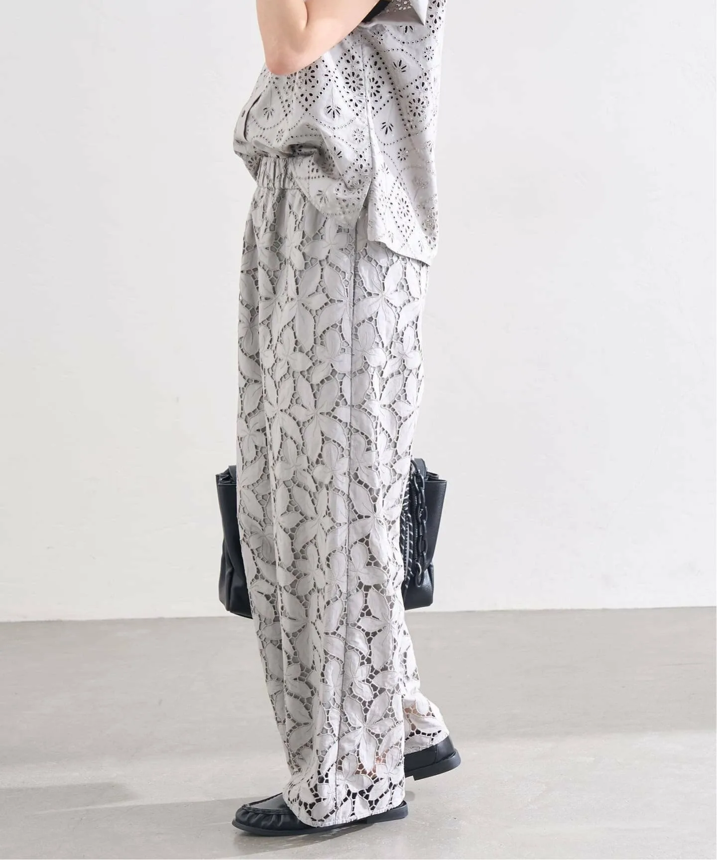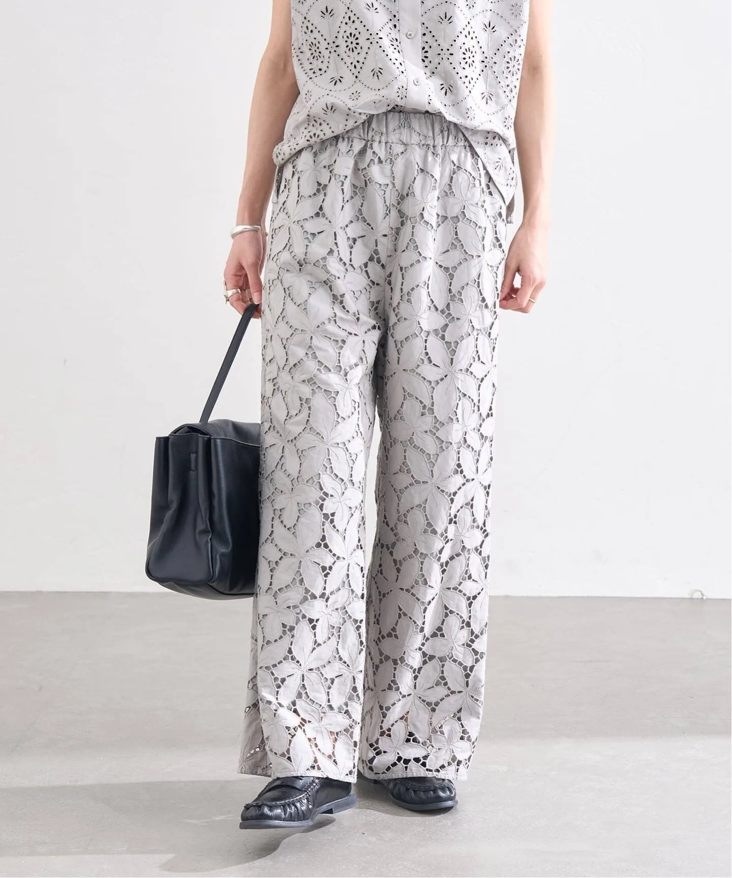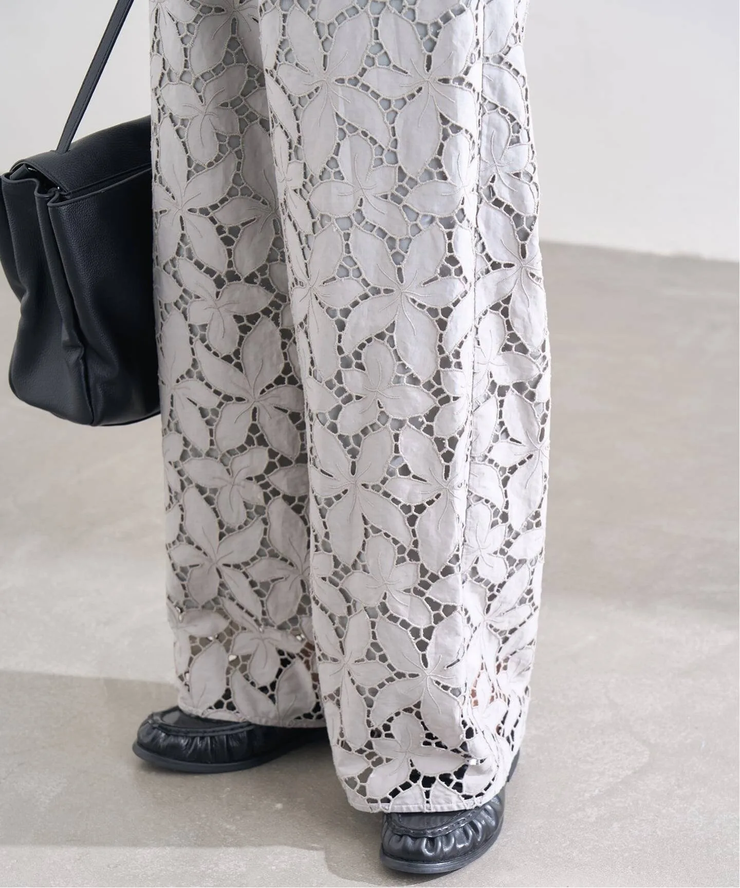 Эти брюки, полностью отделанные кружевом, изготовлены с использованием роскошного количества кружева. Лаконичный, минималистичный дизайн подчеркивает кружево, делая эти широкие брюки смелыми, элегантными и изящными, подходящими как для повседневной носки, так и для торжественных случаев. Оригинальное кружево вышивается и вырезается непосредственно на ткани в отечественном производственном центре и тщательно изготавливается с использованием навыков гордых японских мастеров.