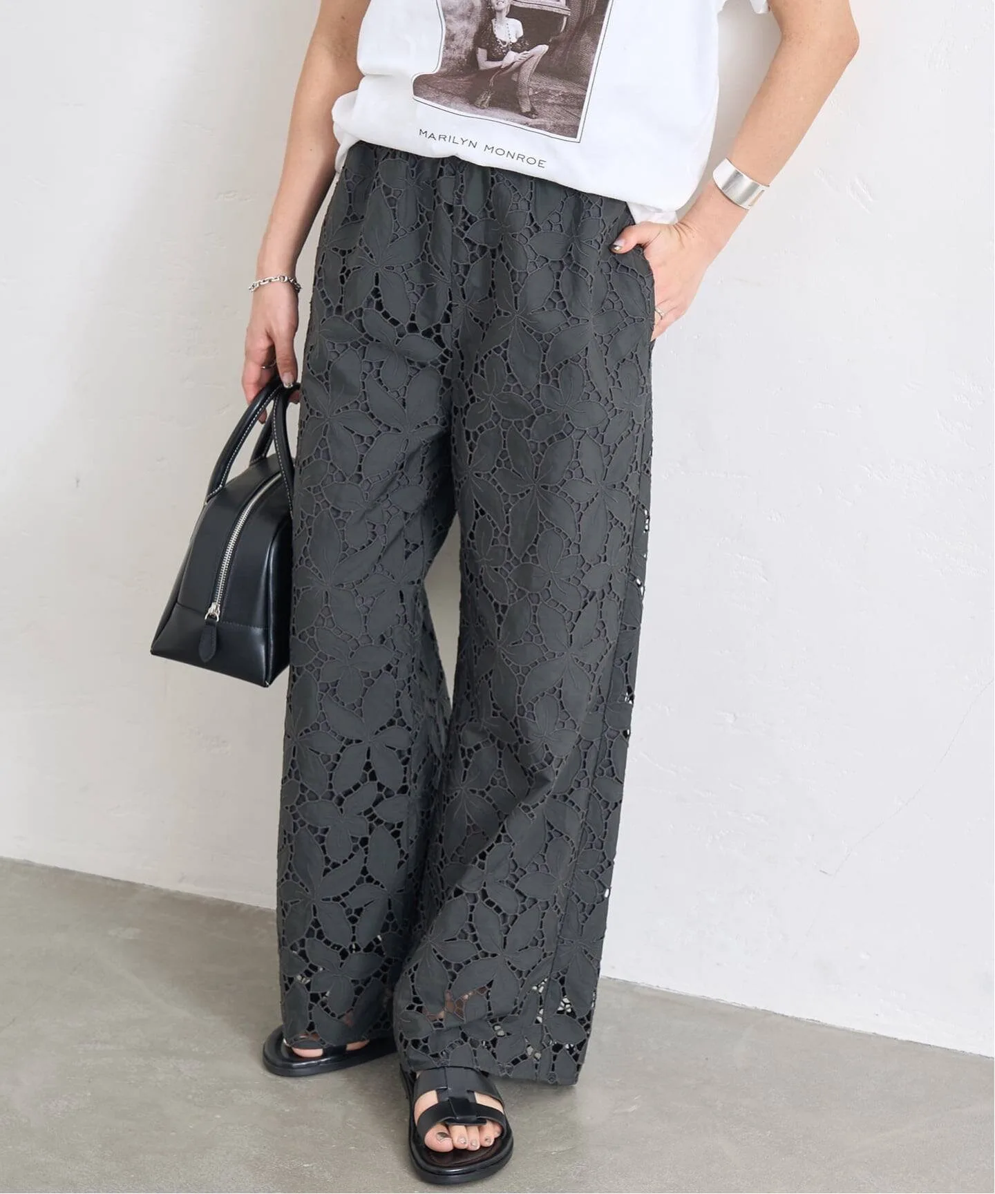 Эти брюки, полностью отделанные кружевом, изготовлены с использованием роскошного количества кружева. Лаконичный, минималистичный дизайн подчеркивает кружево, делая эти широкие брюки смелыми, элегантными и изящными, подходящими как для повседневной носки, так и для торжественных случаев. Оригинальное кружево вышивается и вырезается непосредственно на ткани в отечественном производственном центре и тщательно изготавливается с использованием навыков гордых японских мастеров.