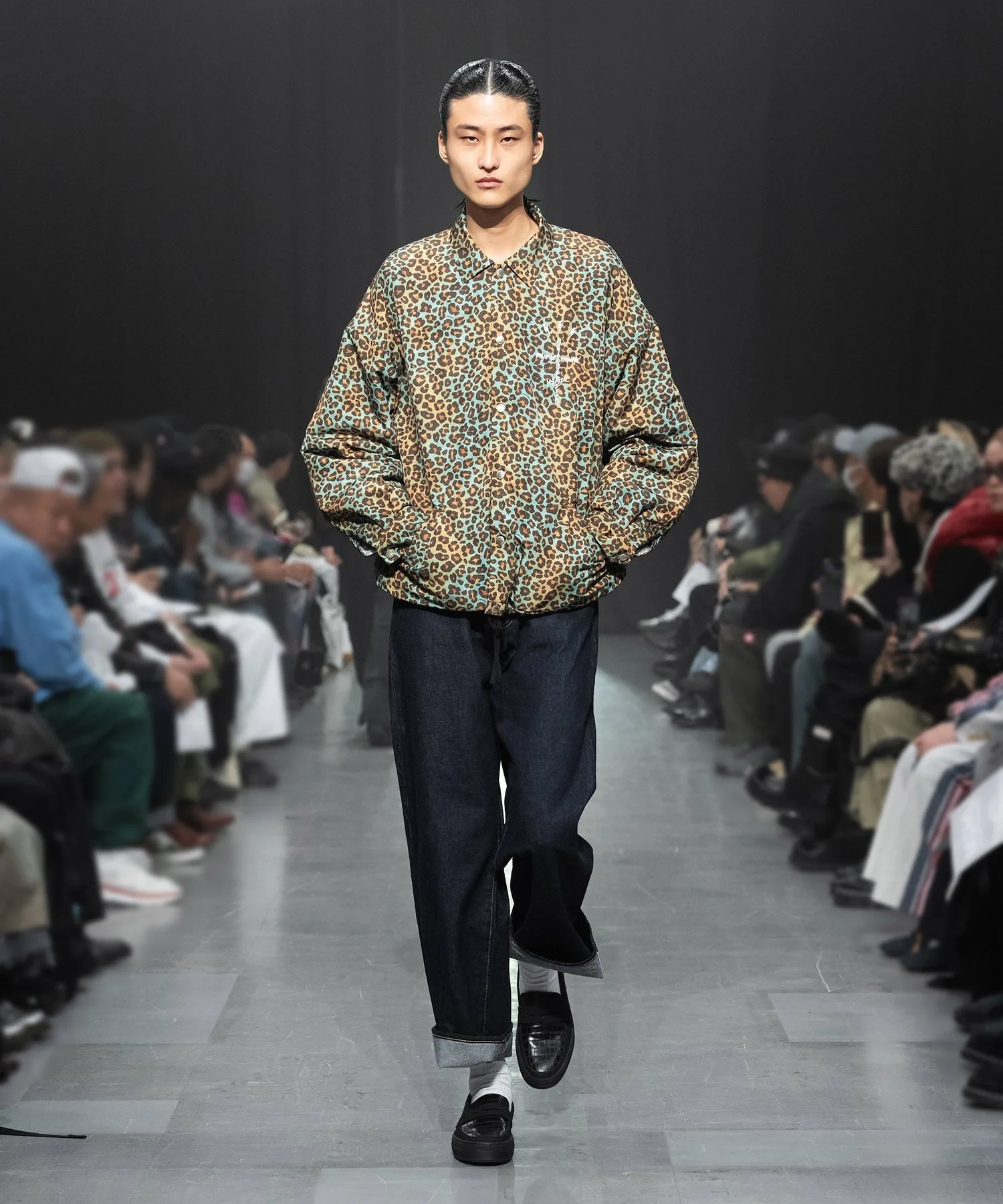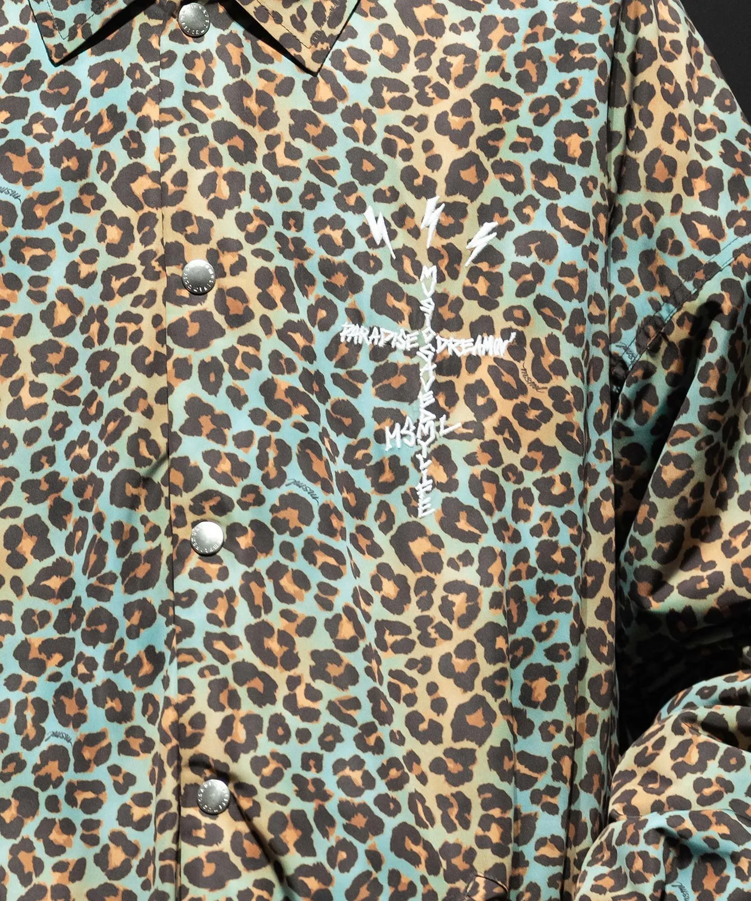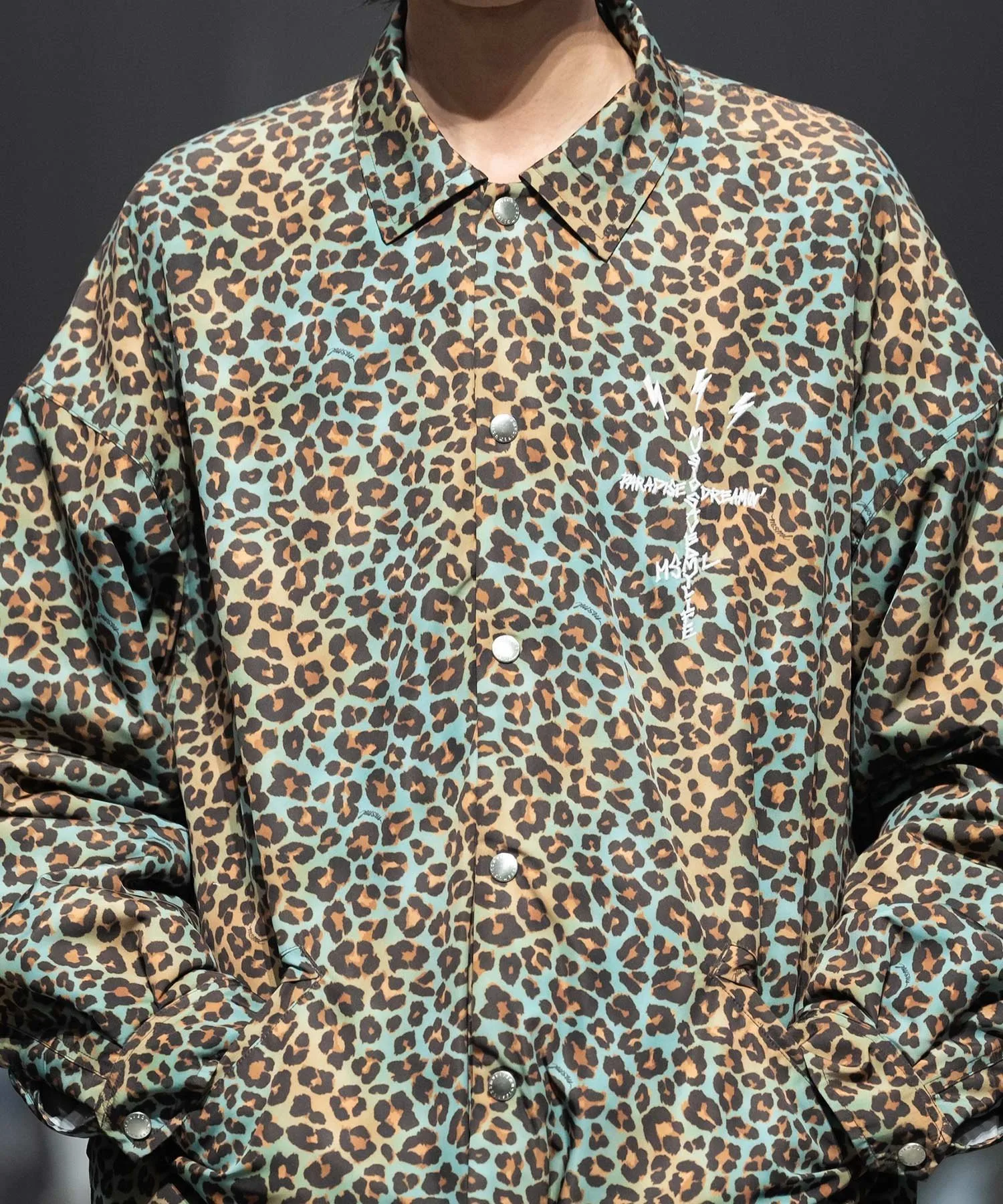 Куртка на кнопках с ярким леопардовым принтом по всей поверхности, выполненным в оригинальном стиле.