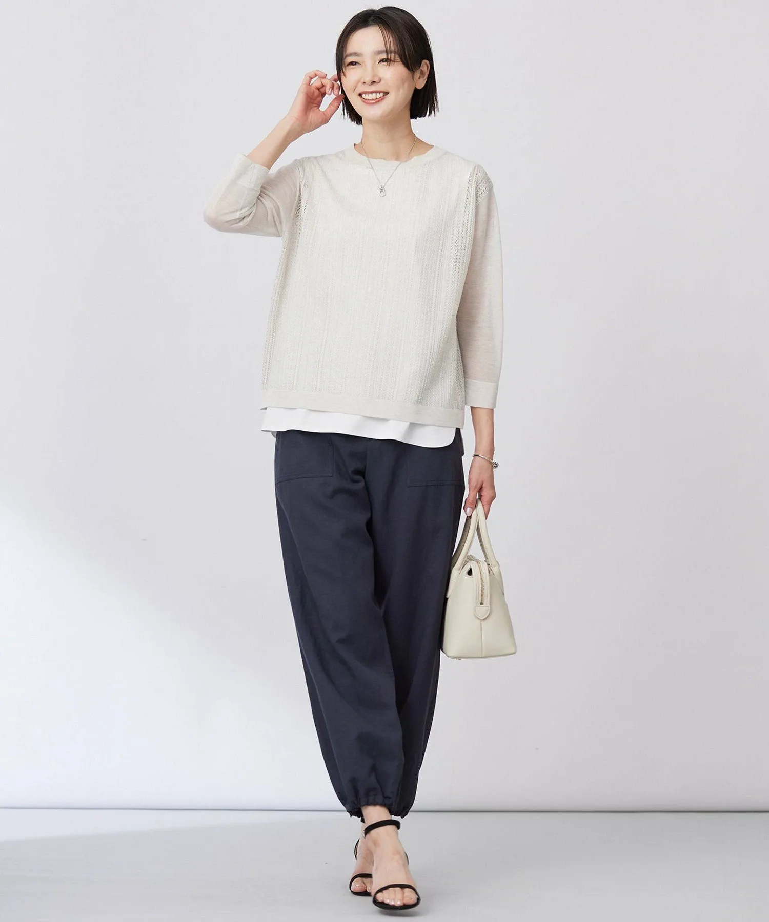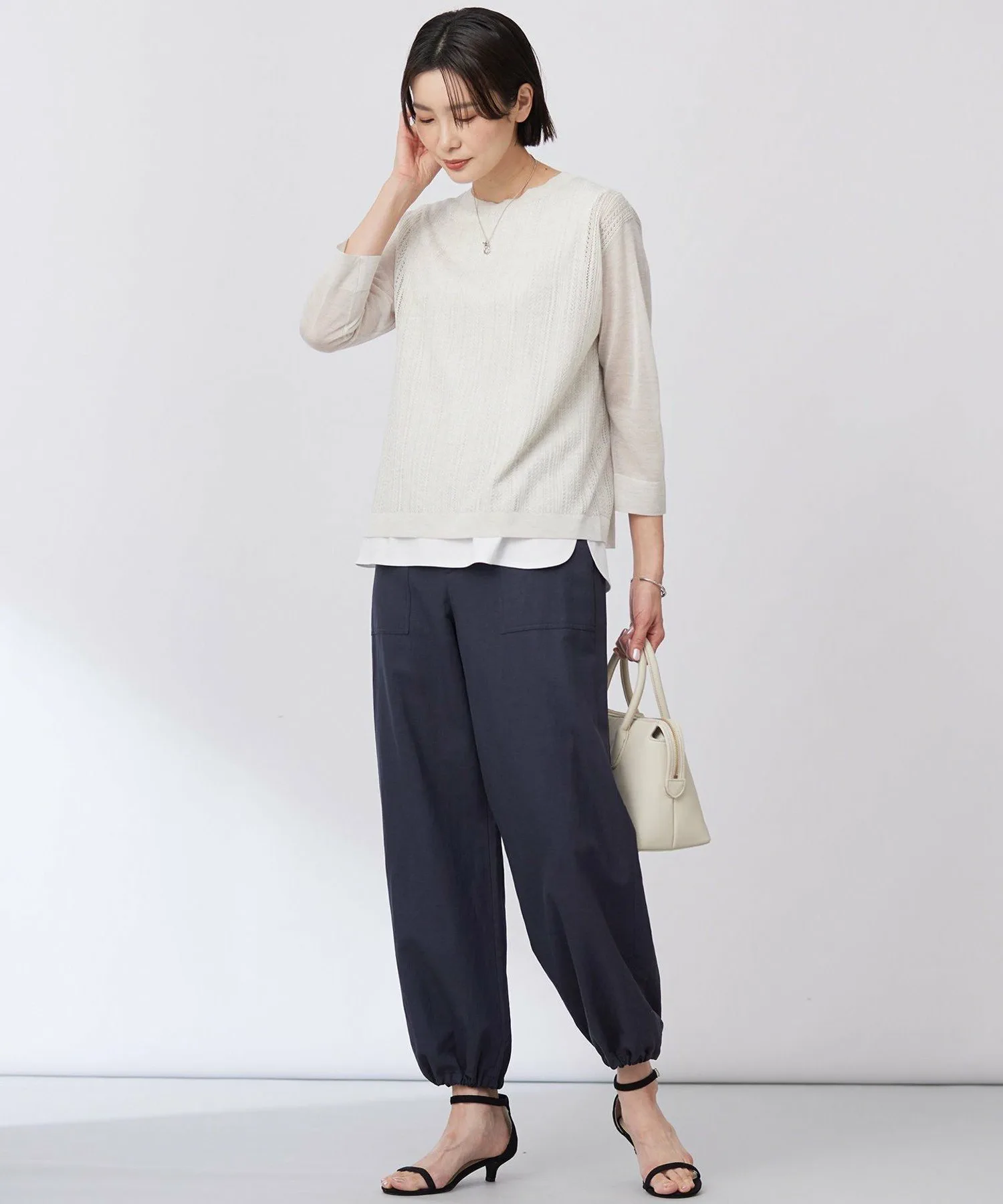 Подчеркните свои весенние образы с помощью идеального сочетания прозрачности! Пуловер длиной 3/4 с приятной на ощупь текстурой. Дизайн: Пуловер с нежной кружевной вязкой по всей поверхности и умеренной прозрачностью рукавов. Кружевная вязка только на основной части создает изысканный и элегантный образ, не будучи при этом слишком броским. Его можно носить как самостоятельно, так и в качестве нижнего слоя под жакет, а рукава длиной 3/4 делают его подходящим для длительного ношения. Это полезная вещь для добавления цвета в ваши весенние образы, благодаря своей универсальности его можно носить с любыми брюками или юбками. Материал: Изготовлен из тонкой вискозно-полиэстерной пряжи. Обладает гладкой драпировкой и приятной на ощупь текстурой. Его нежная, блестящая текстура делает его универсальным как для работы, так и для отдыха. Изделия из того же материала: Вязаный кардиган (KRGJGM0430) Большой размер (KRGTGM0430) Маленький размер (KRG0GM0430) Полосатый вязаный пуловер (KRGJGM0431) Большой размер (KRGTGM0431) Маленький размер (KRG0GM0431) Жилет (KRGJGM0432) Большой размер (KRGTGM0432) Маленький размер (KRG0GM0432) *Обратите внимание, что изображения товаров являются образцами и могут быть изменены по цвету, размеру и другим характеристикам. Модель: H170 C81 W59 H85