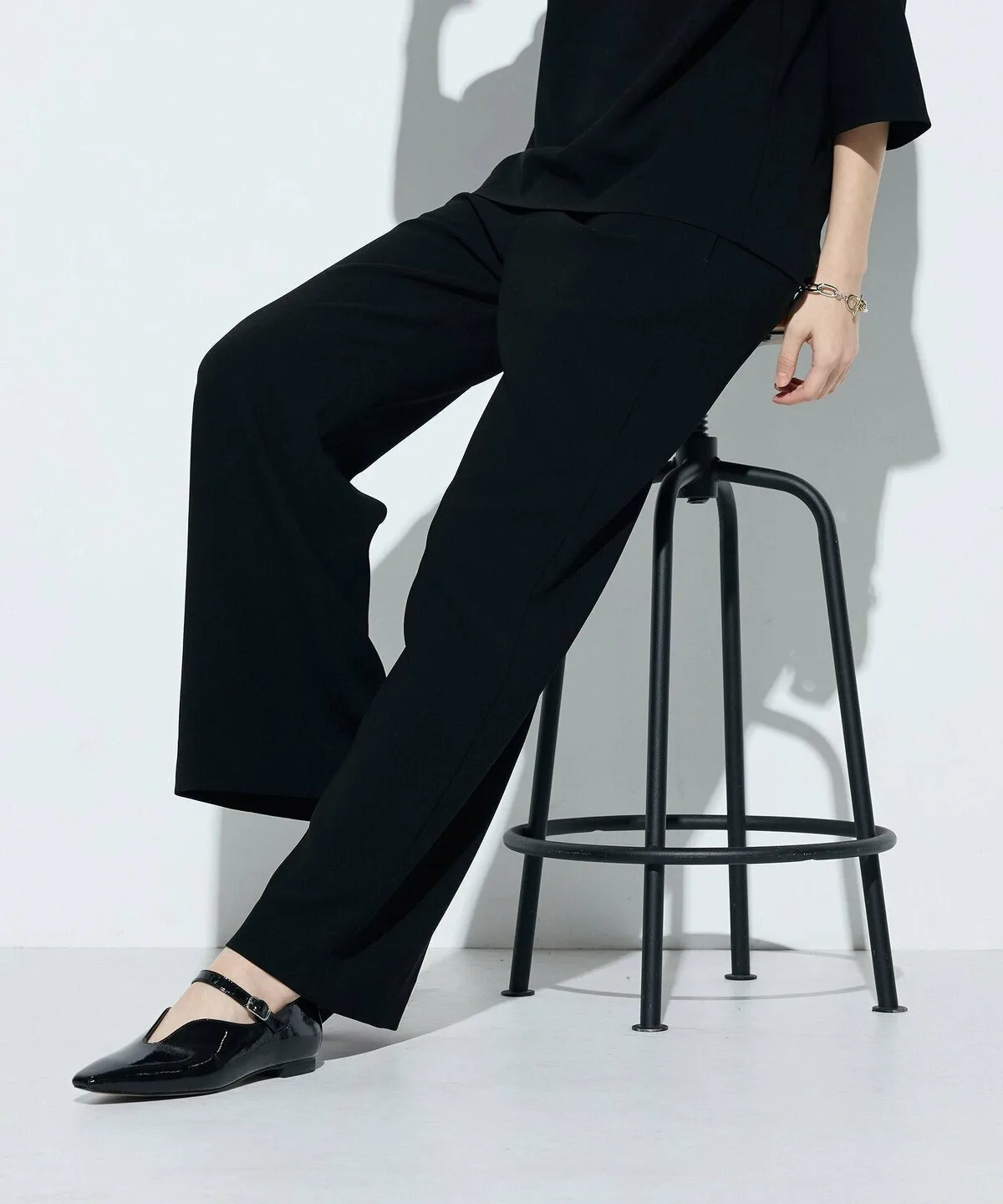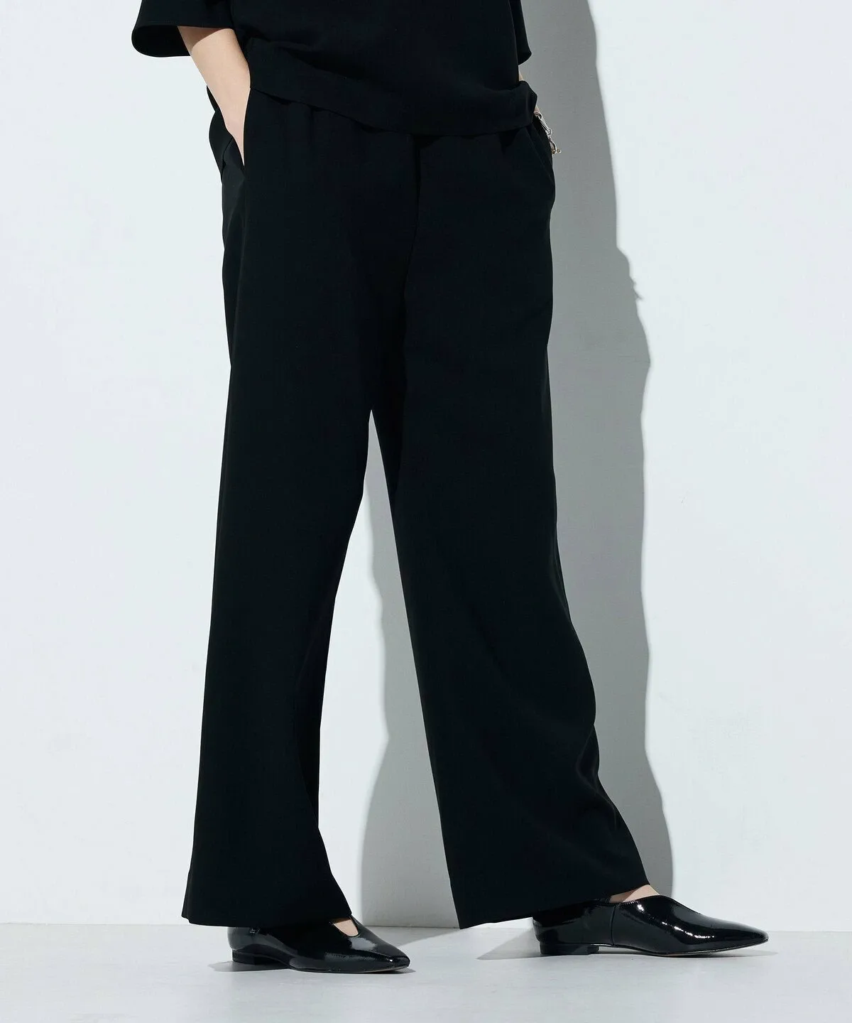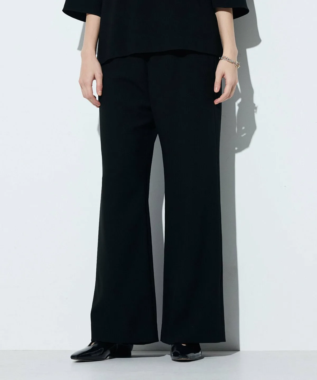 Ткань двойного плетения придает брюкам умеренно плотную текстуру, благодаря чему они меньше подчеркивают фигуру.