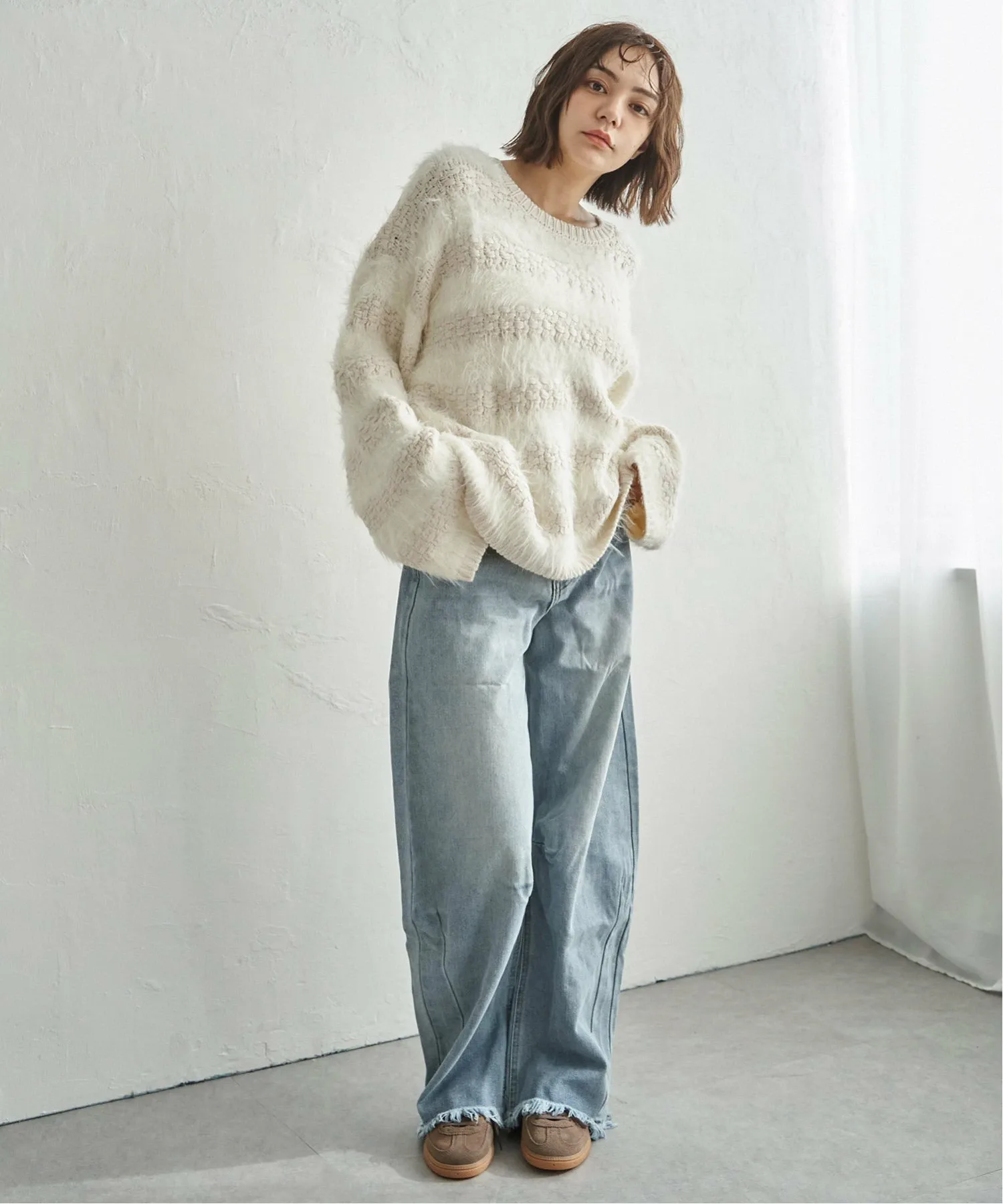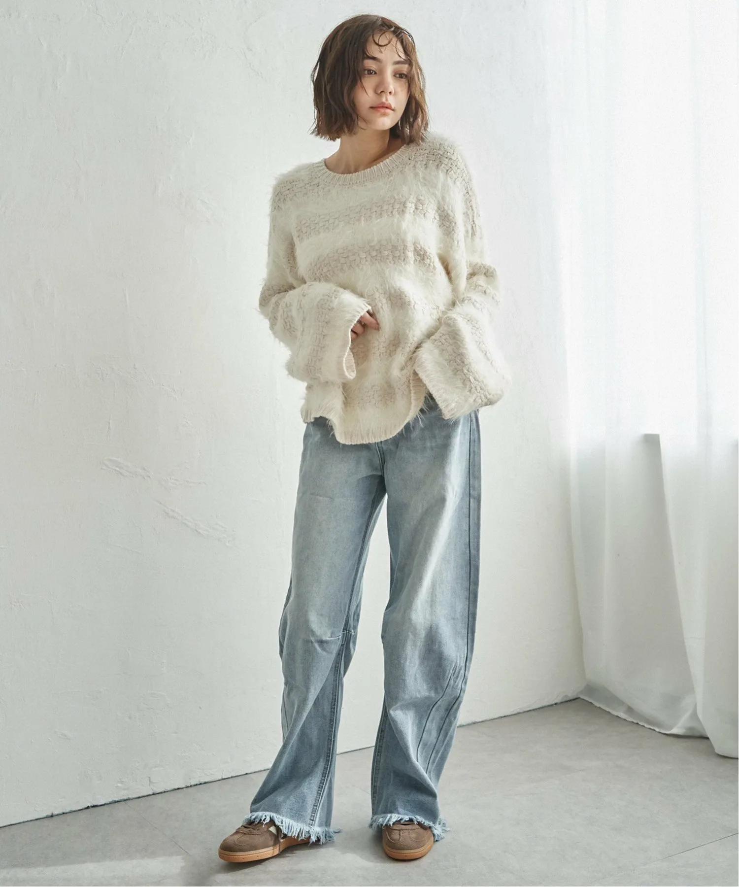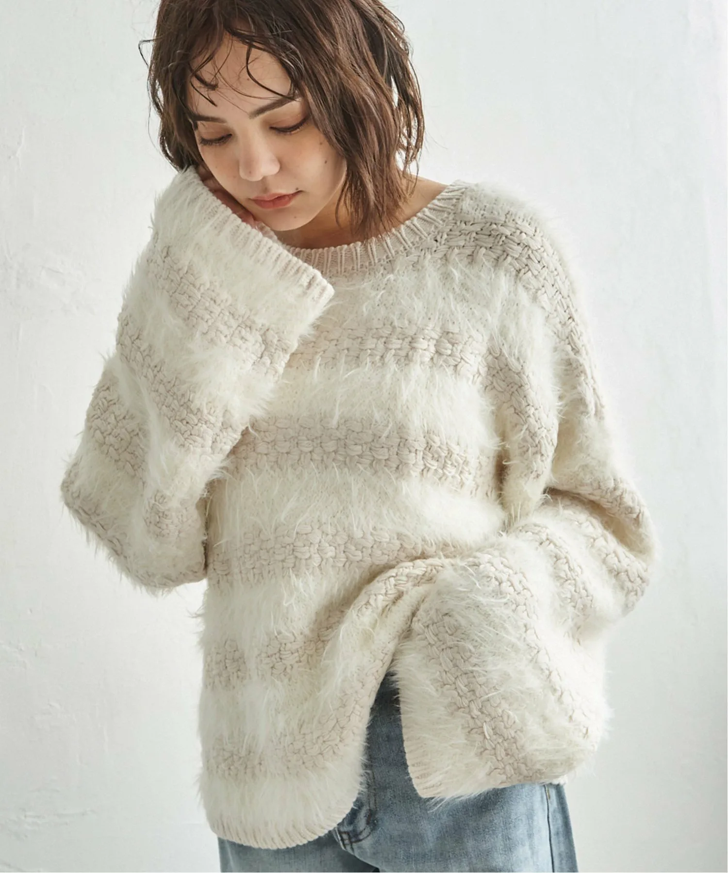 Сочетание различных материалов, объединяющее свободную вязку с мягкой текстурой пряжи.