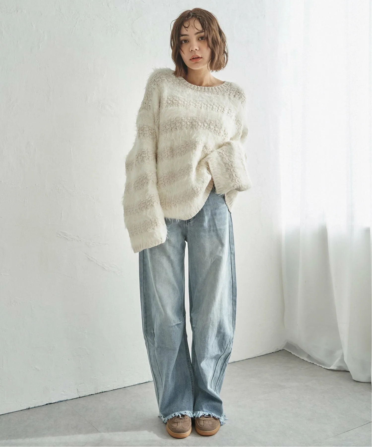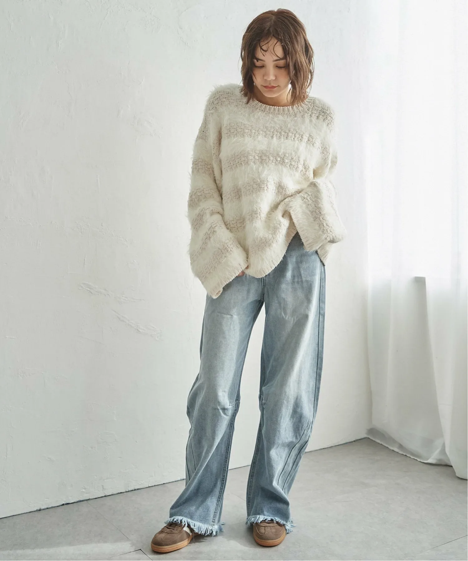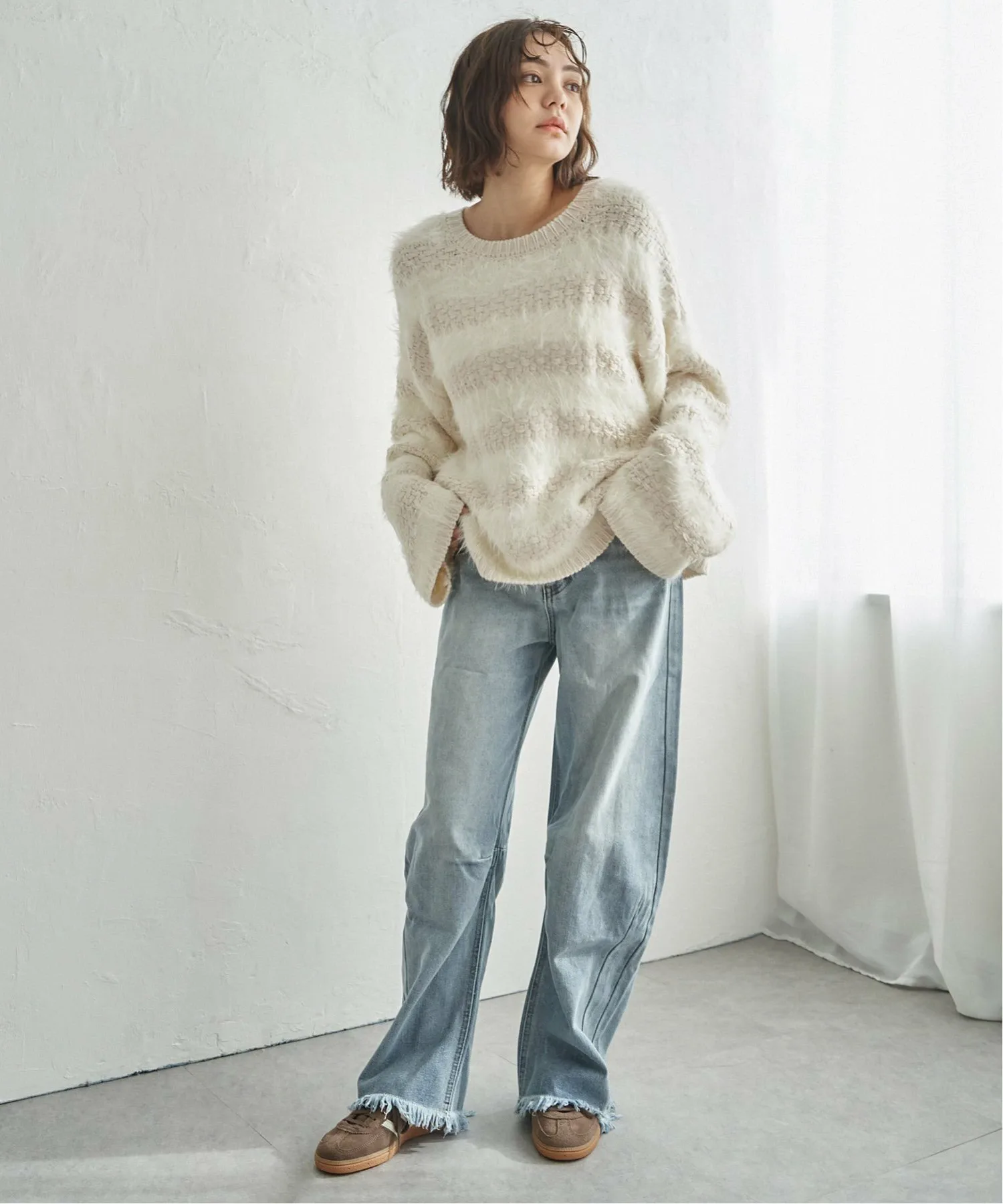 Сочетание различных материалов, объединяющее свободную вязку с мягкой текстурой пряжи.