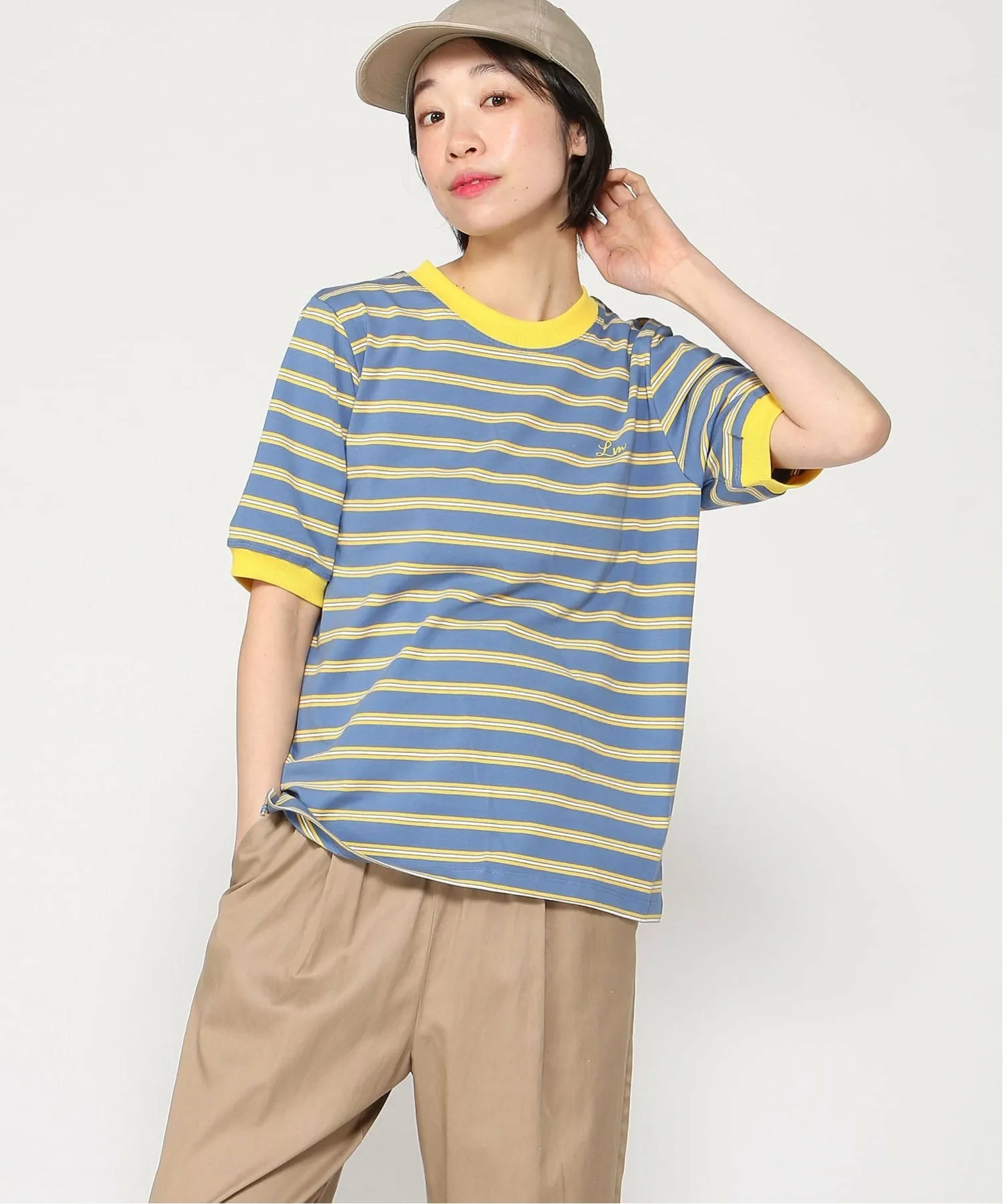 Эта футболка с короткими рукавами имеет круглый вырез, который придает воротнику аккуратный вид, и свободный силуэт с достаточным запасом места, что позволяет легко сочетать ее с любым стилем. Материал из смесовой хлопковой ткани обеспечивает комфортную посадку, а контрастная ребристая отделка на манжетах и воротнике добавляет изысканный акцент. Ее можно носить как самостоятельно, так и в качестве нижнего слоя в многослойных образах. Рост модели: 169 см. Размер: Off, black, blue/FREE