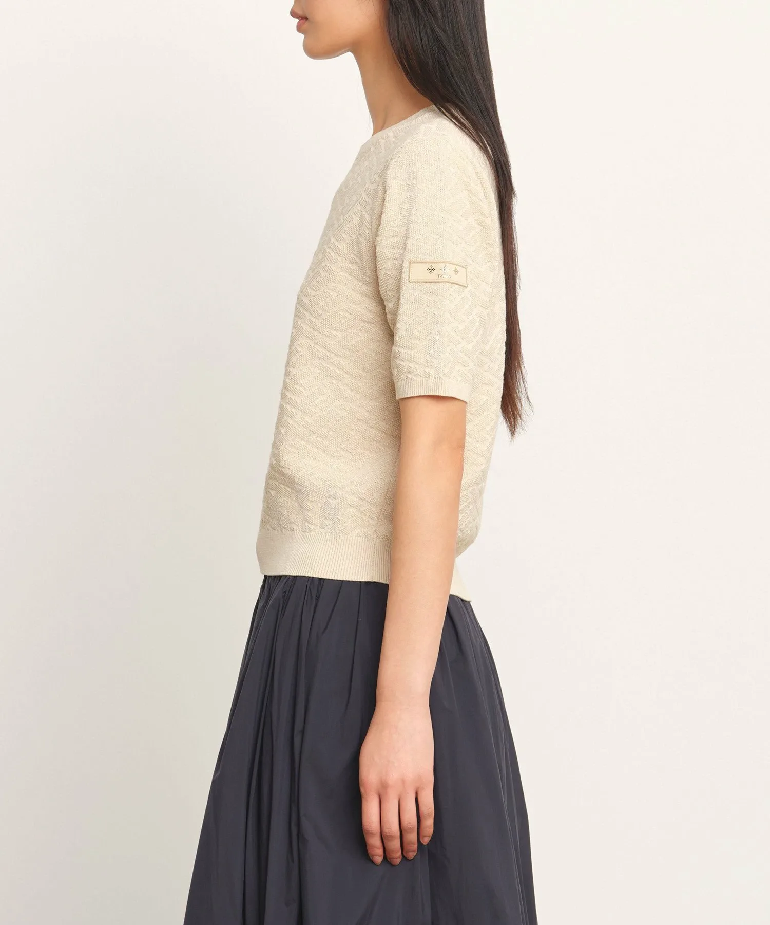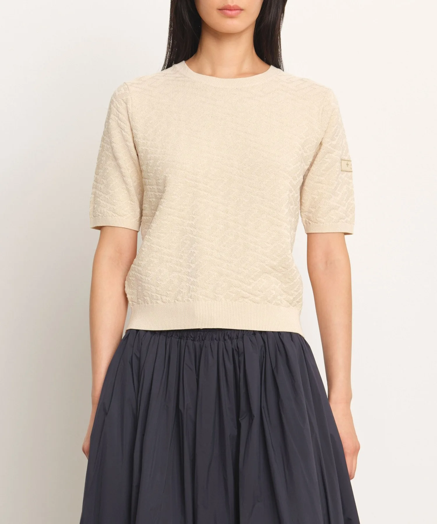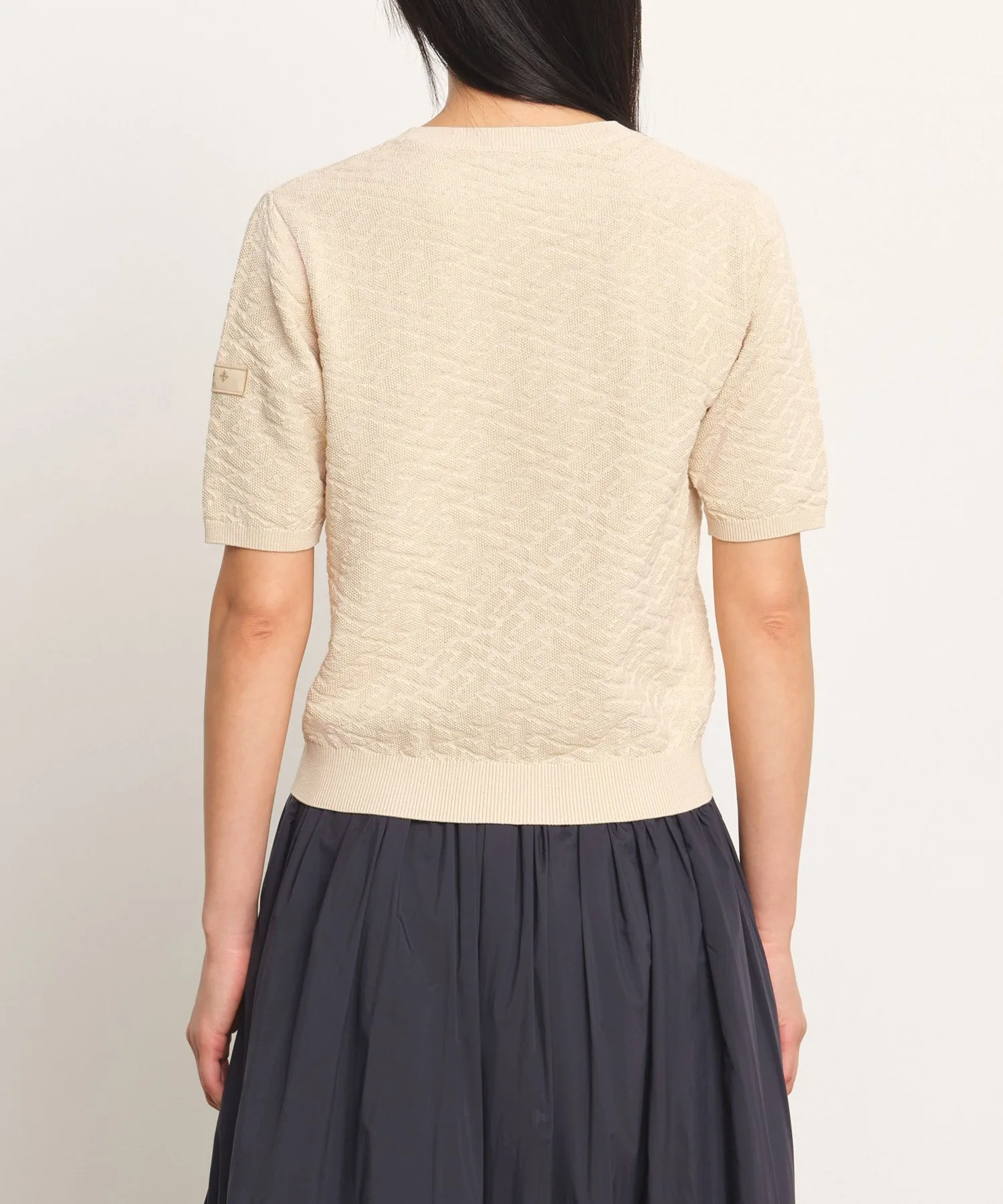 Этот пуловер с короткими рукавами украшен эффектным трехмерным монограммным узором. Угол наклона и текстура монограммы тщательно продуманы для создания впечатляющего образа. Ткань – хлопок-шелк, который можно стирать вручную, он отличается умеренной плотностью и приятной на ощупь текстурой. Ребристые вставки на воротнике, манжетах и подоле придают силуэту выразительность. Еще одна изюминка – культовая нашивка на левом рукаве. Несмотря на изысканный дизайн, однотонная расцветка позволяет легко сочетать его с другой одеждой. [Примечание]