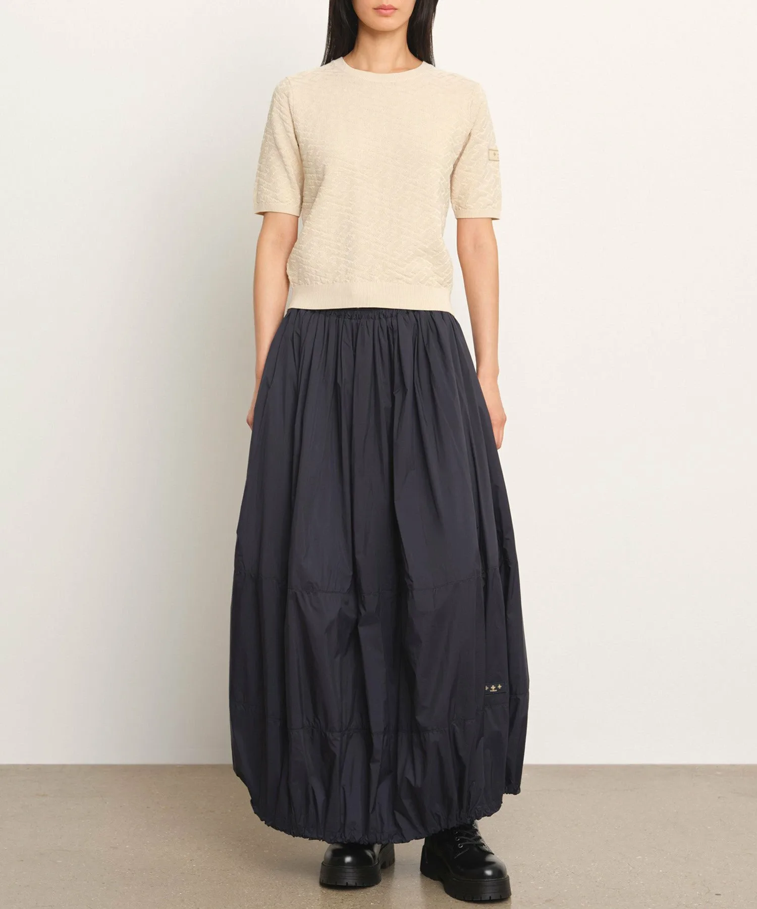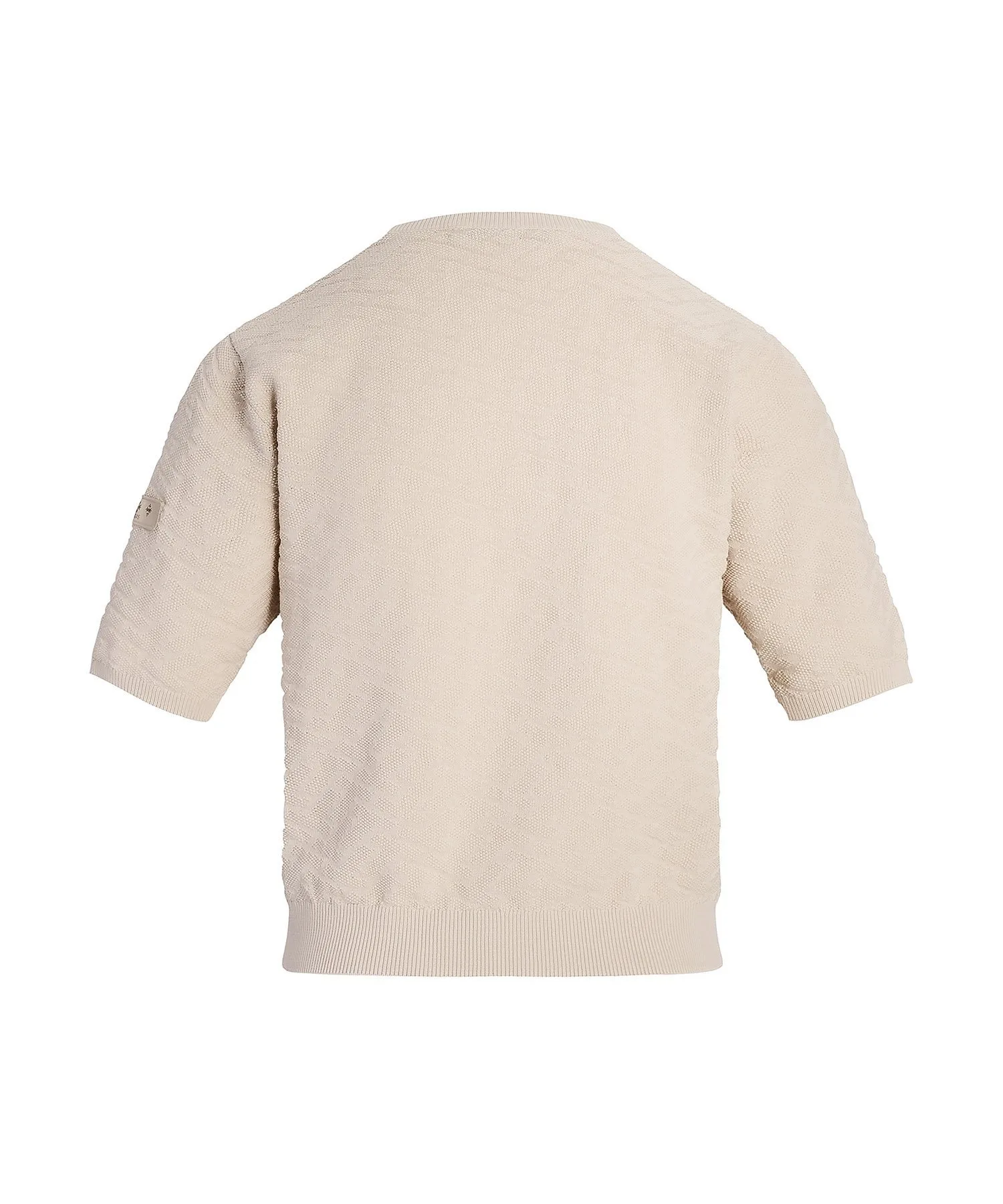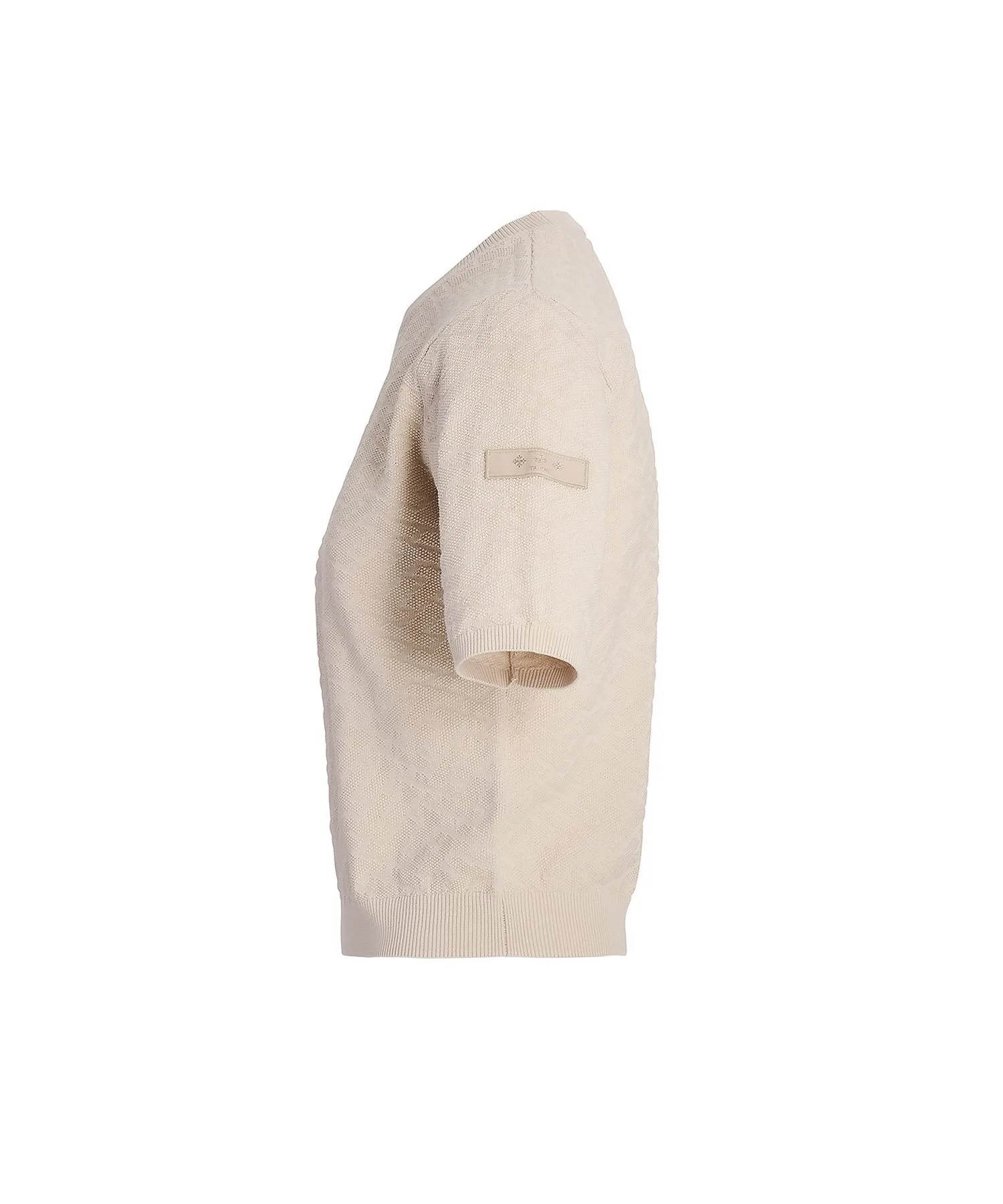 Этот пуловер с короткими рукавами украшен эффектным трехмерным монограммным узором. Угол наклона и текстура монограммы тщательно продуманы для создания впечатляющего образа. Ткань – хлопок-шелк, который можно стирать вручную, он отличается умеренной плотностью и приятной на ощупь текстурой. Ребристые вставки на воротнике, манжетах и подоле придают силуэту выразительность. Еще одна изюминка – культовая нашивка на левом рукаве. Несмотря на изысканный дизайн, однотонная расцветка позволяет легко сочетать его с другой одеждой. [Примечание]