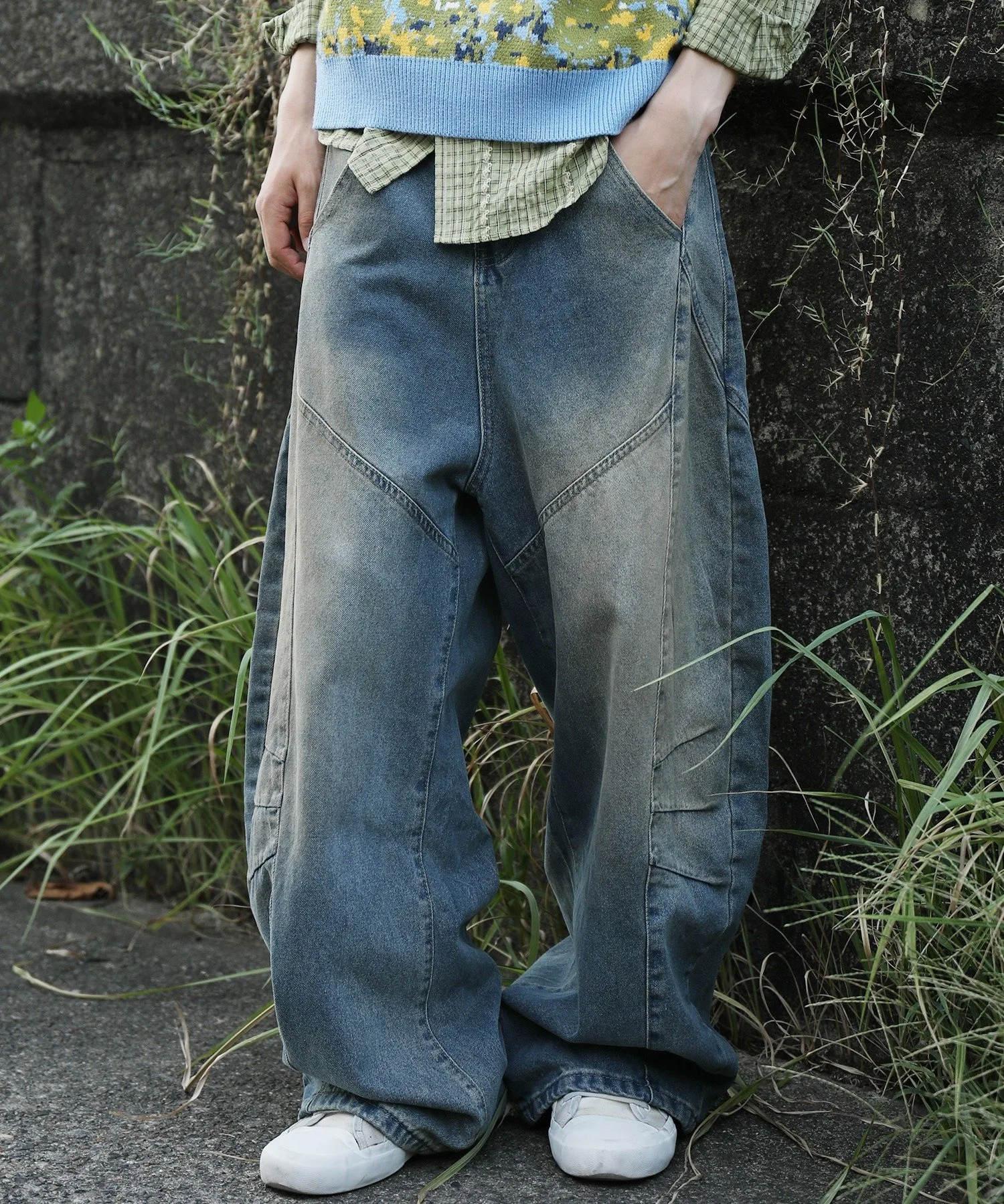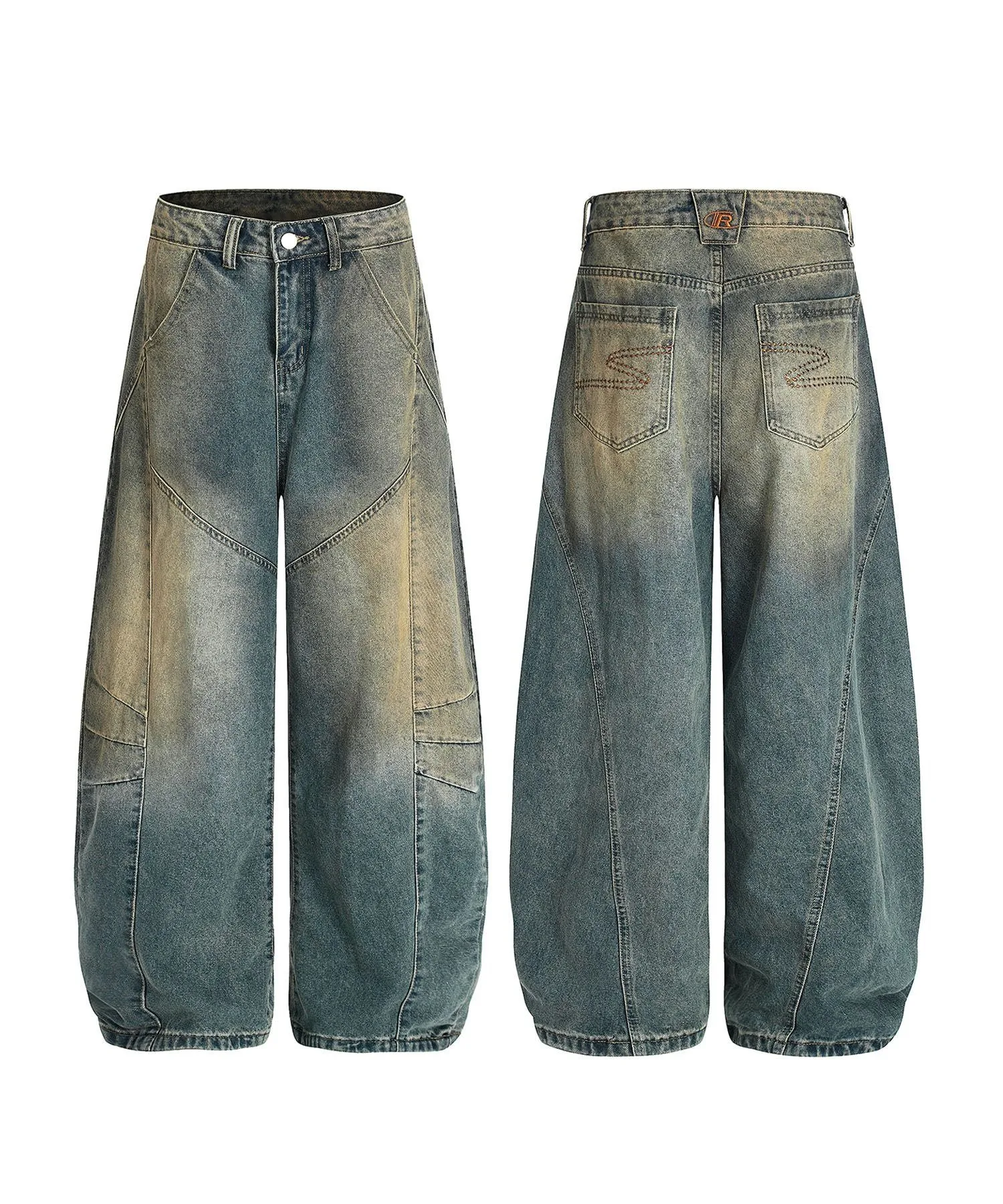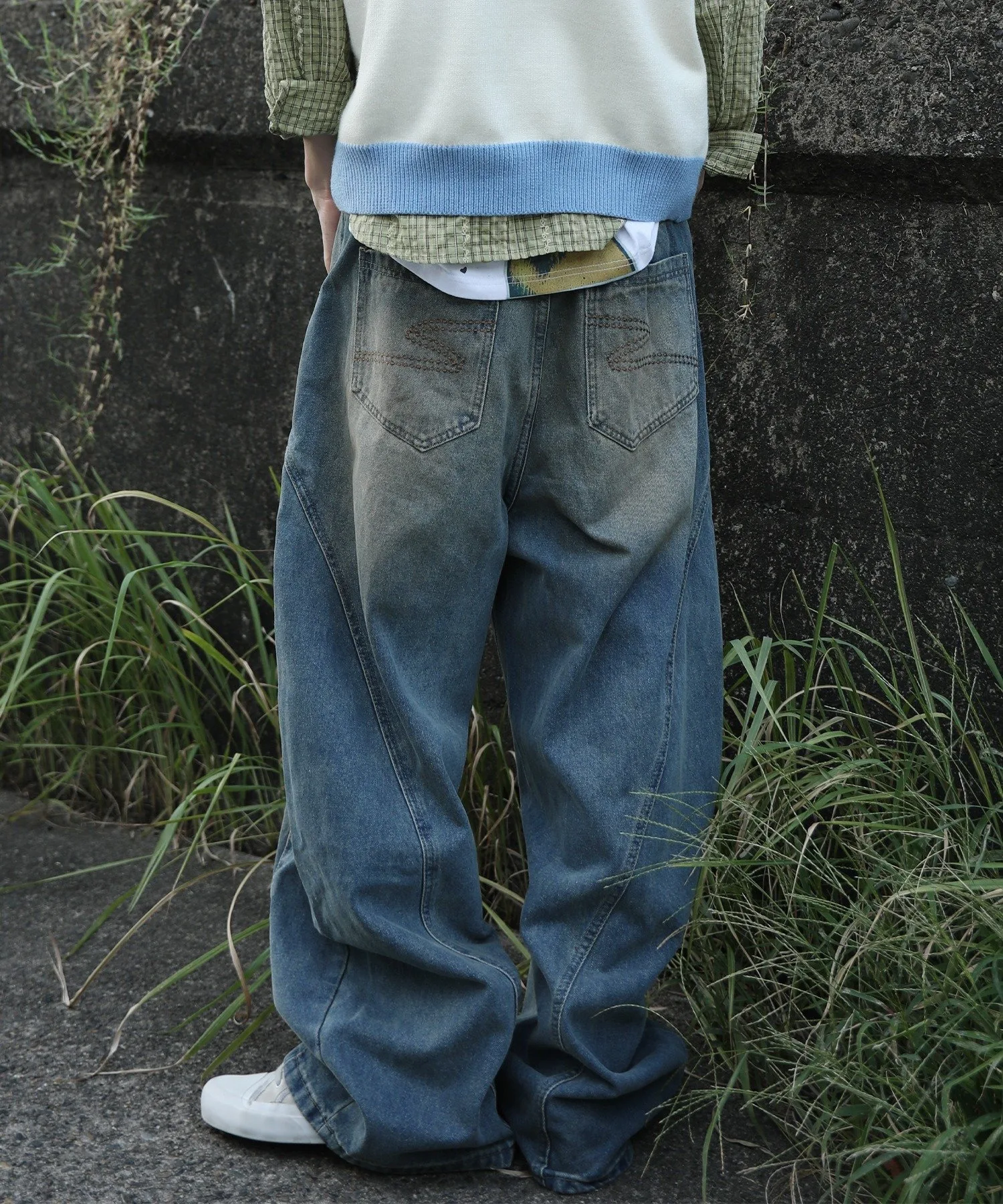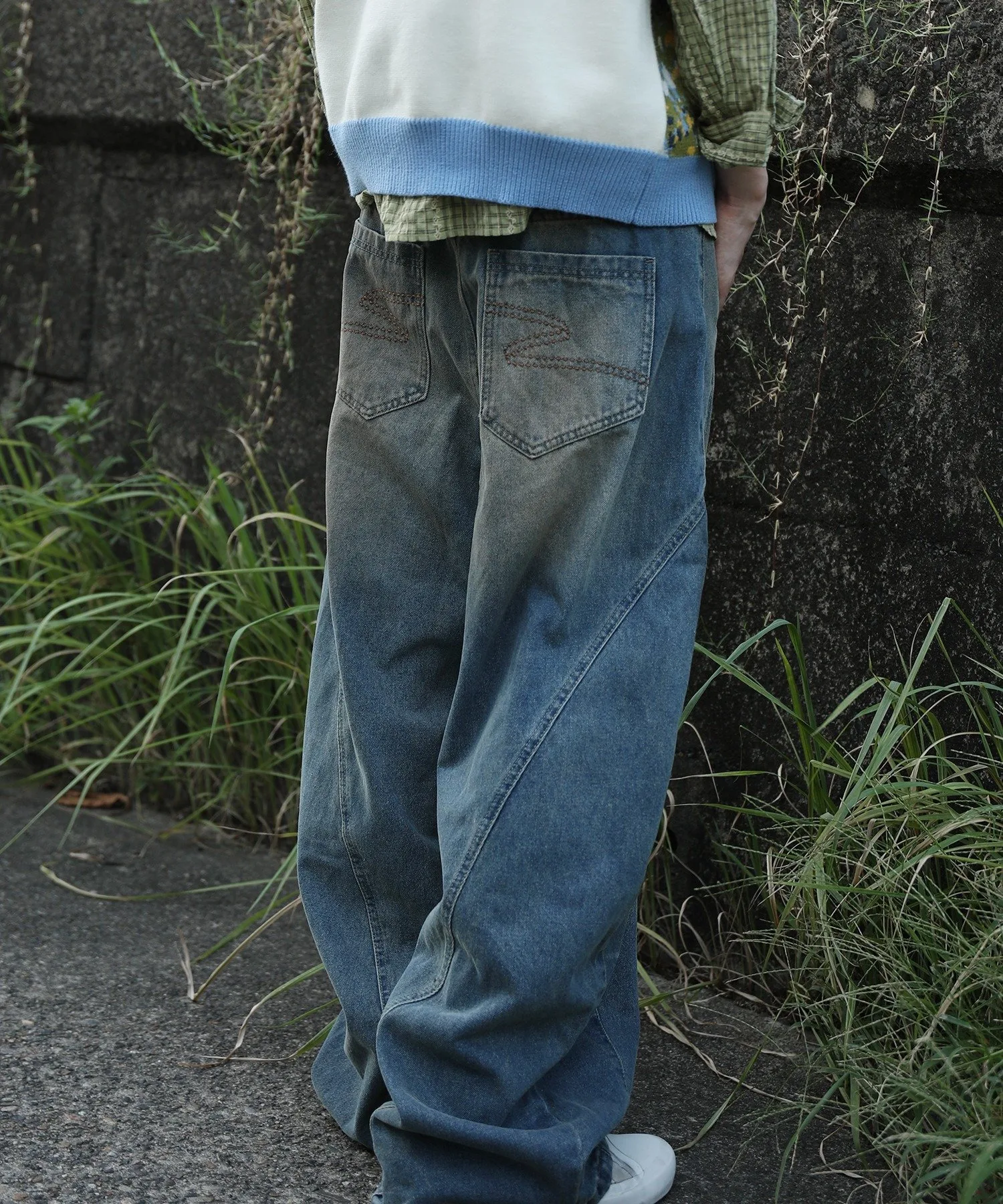 Ретро-винтажные джинсовые брюки с изысканной потертой отделкой, привлекающей внимание.