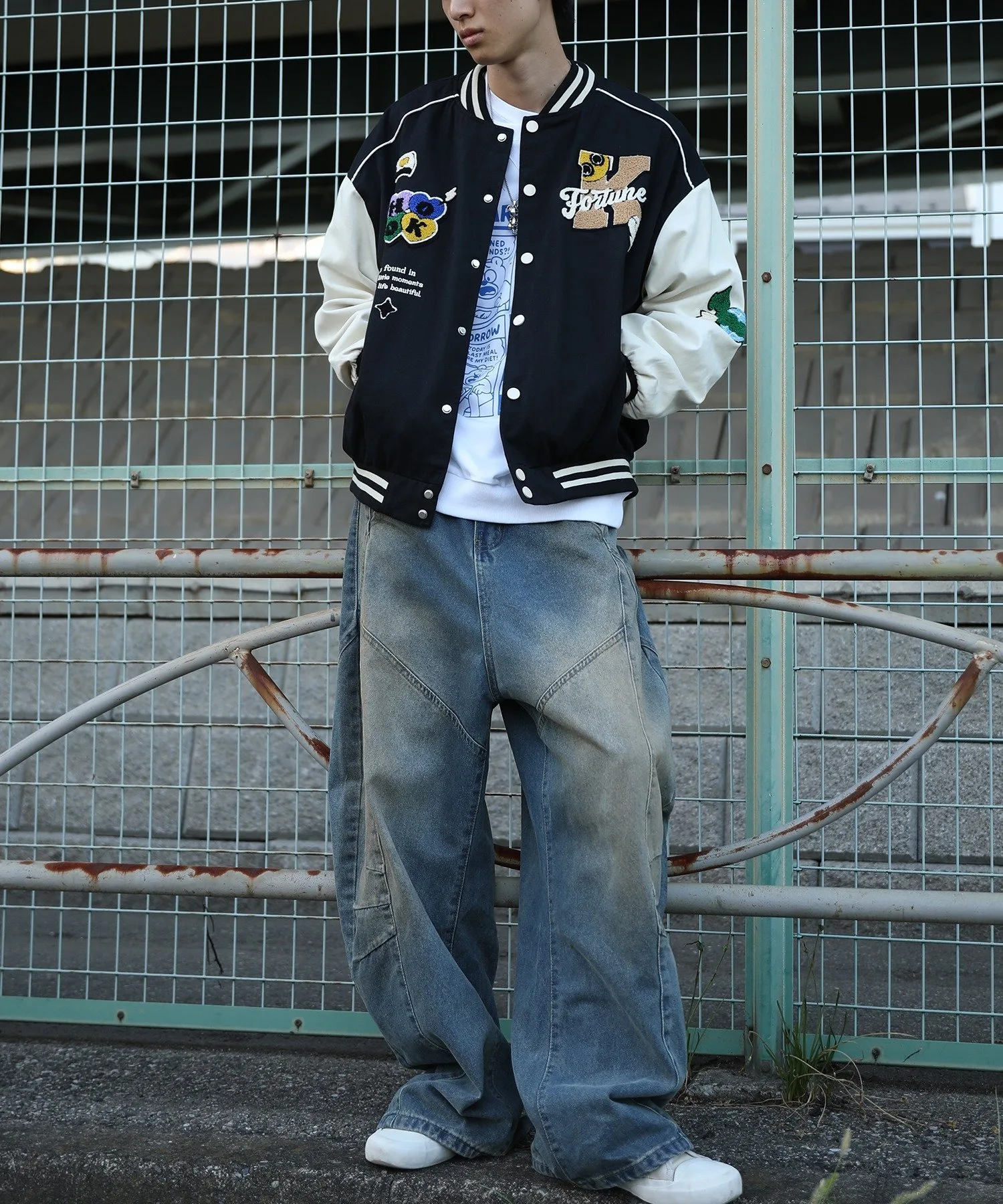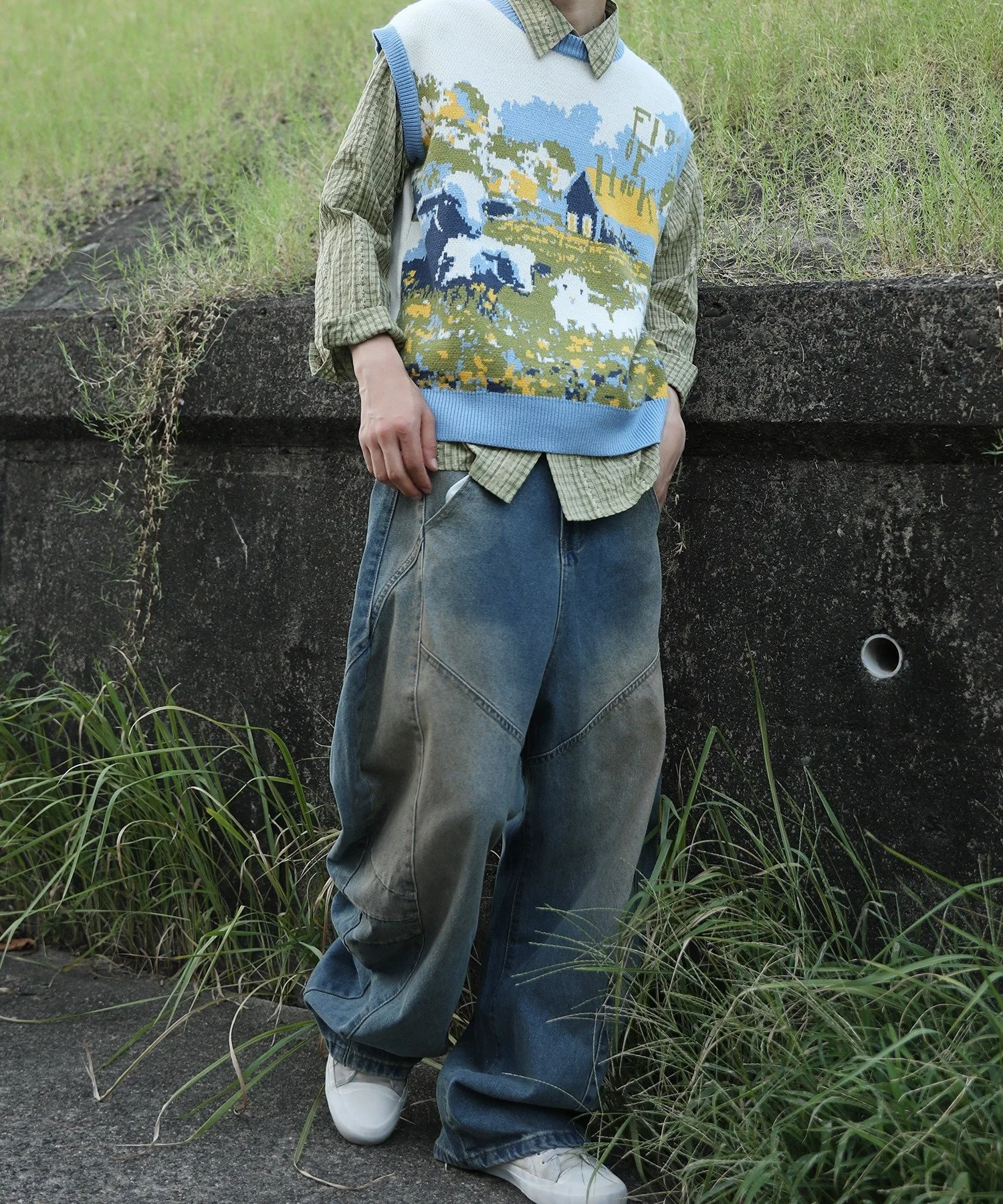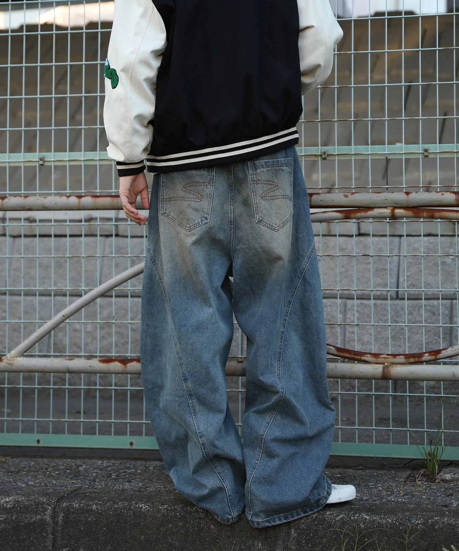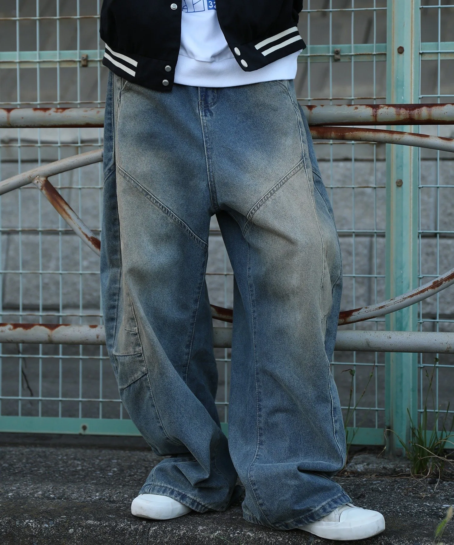 Ретро-винтажные джинсовые брюки с изысканной потертой отделкой, привлекающей внимание.