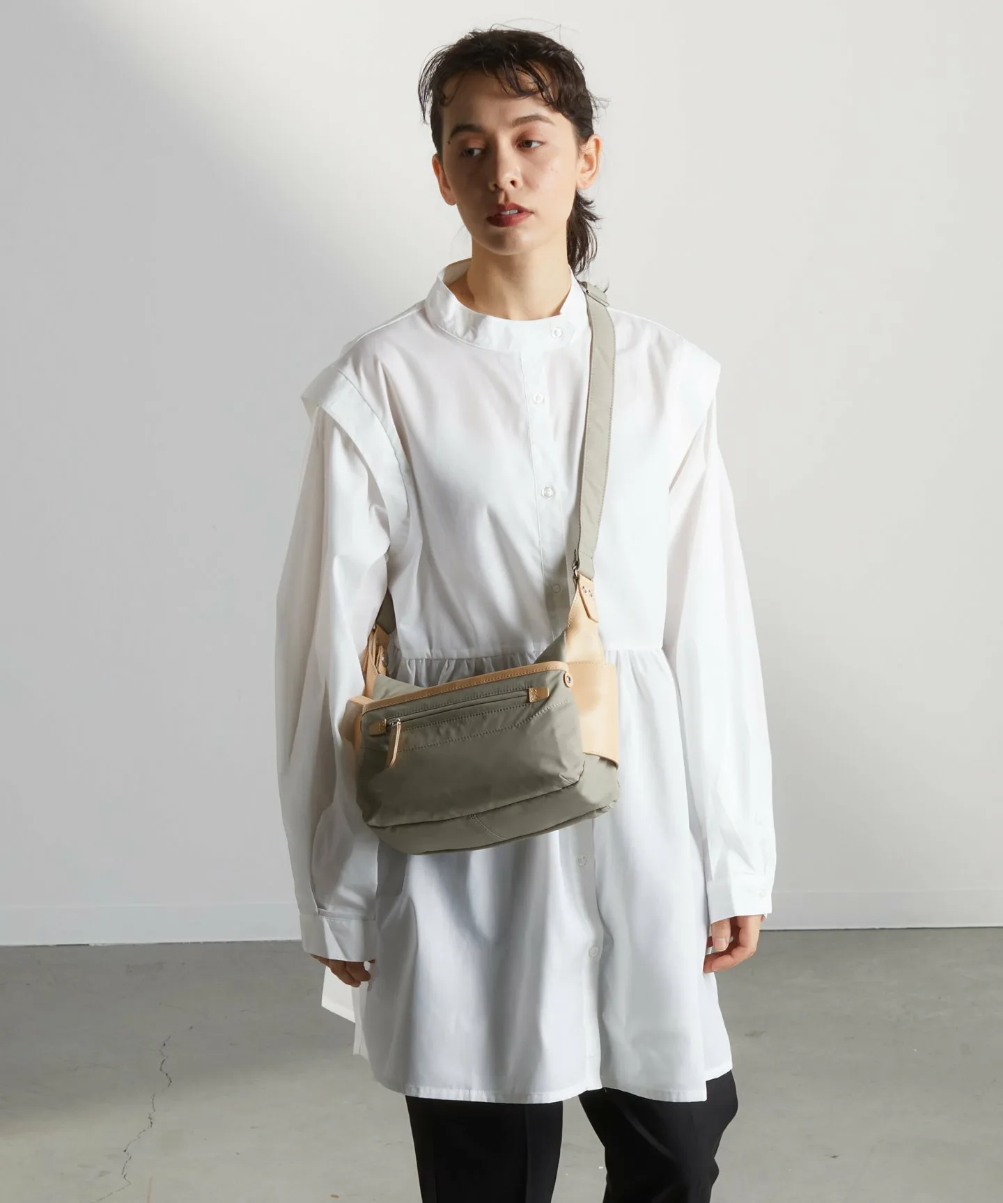 Мягкая и легкая нейлоновая тафта сочетается с жесткой матовой переработанной кожей, создавая нейтральный образ, подходящий и для мужчин.