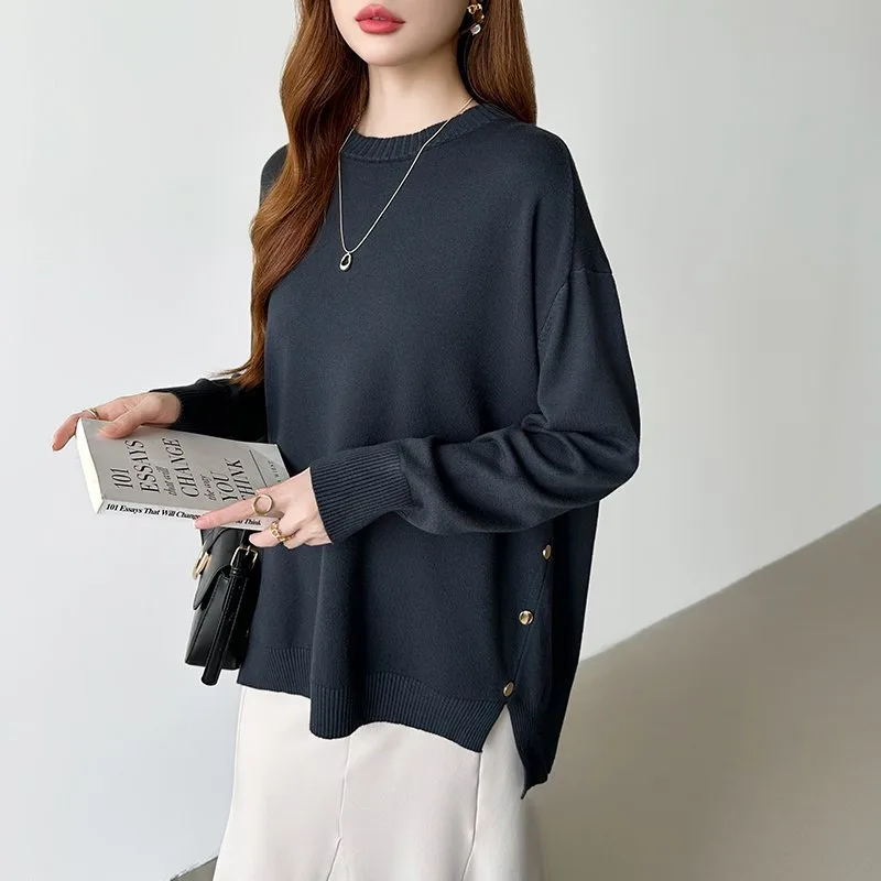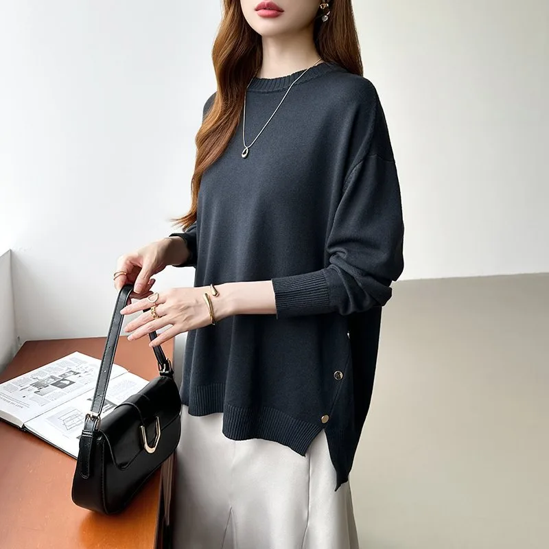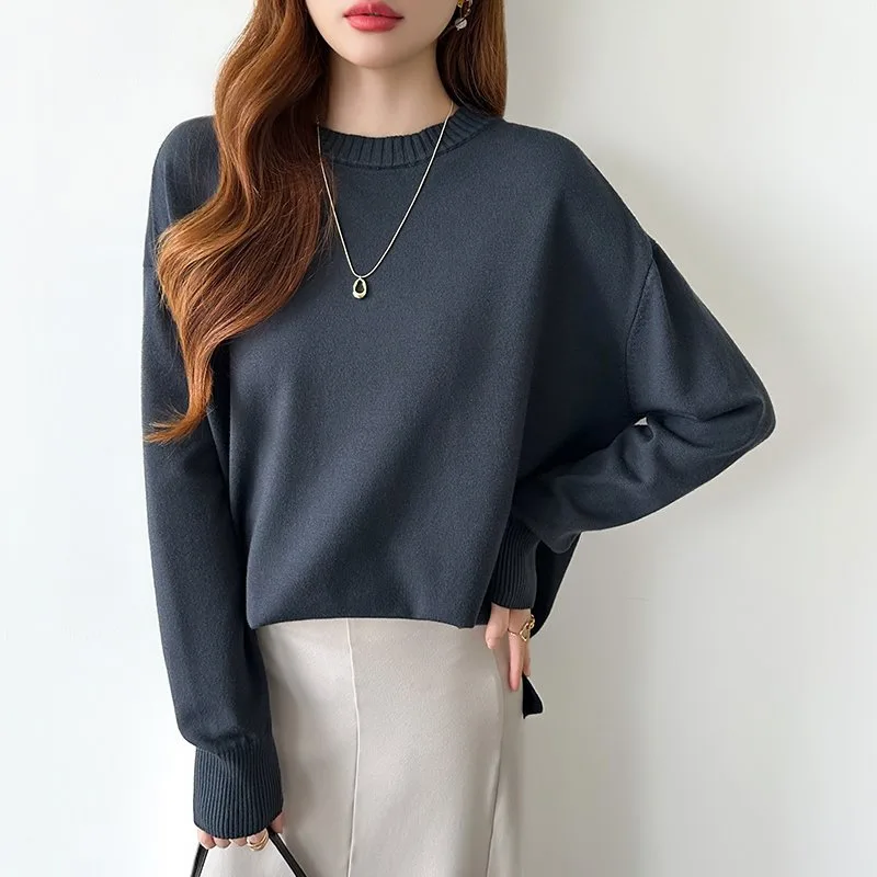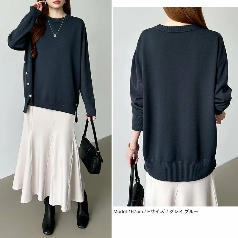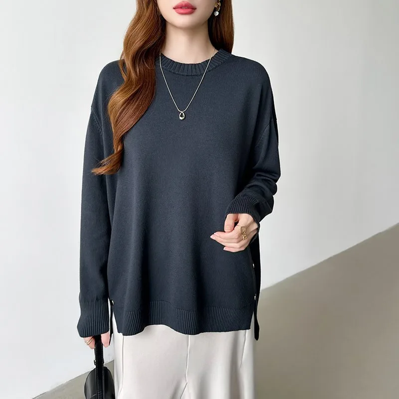 Длинный трикотажный свитер свободного силуэта с удлиненной спинкой, которая естественно облегает фигуру.
