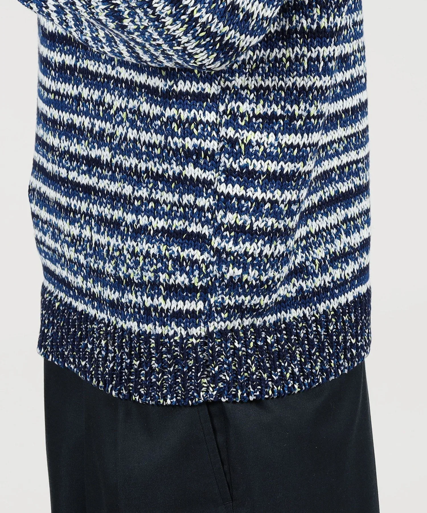 Узор по краю создан из итальянской пряжи, полученной путем разрыва многоцветного полосатого трикотажа на тонкие полоски и обработки их в ленты.