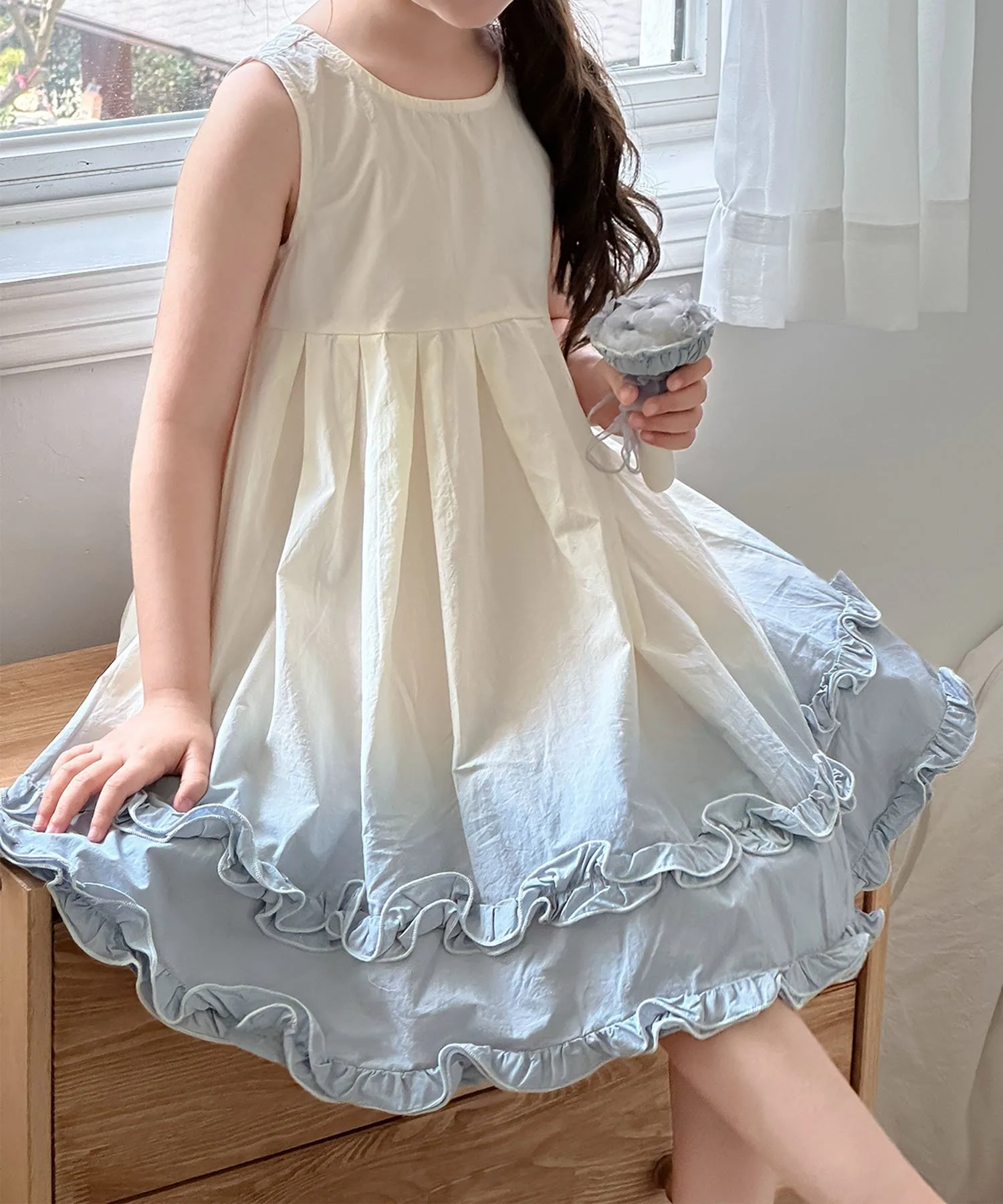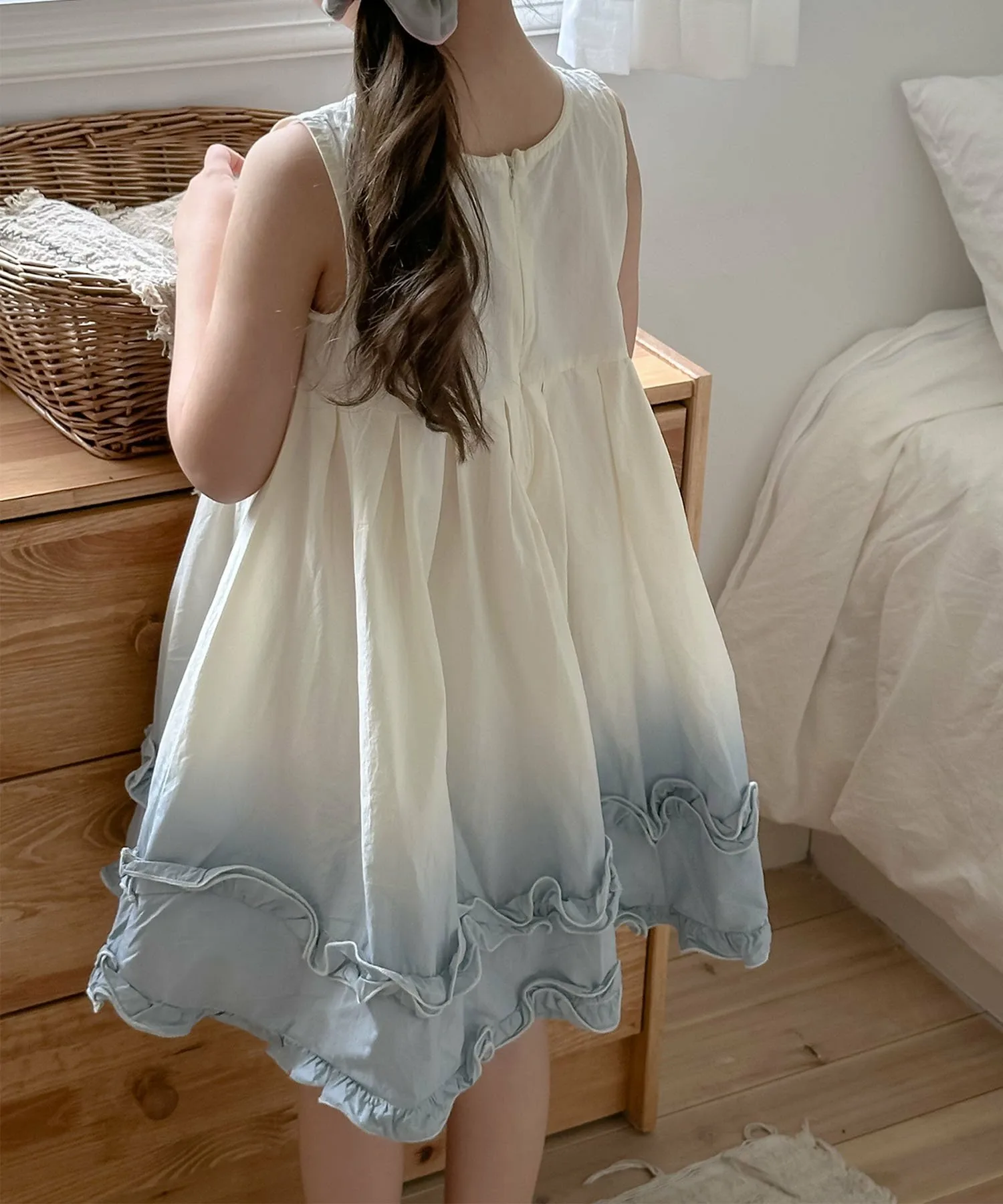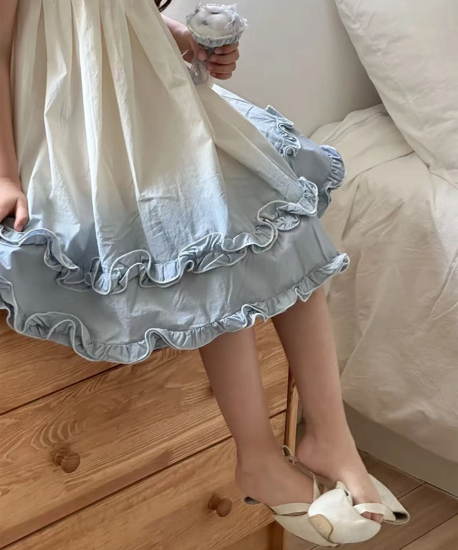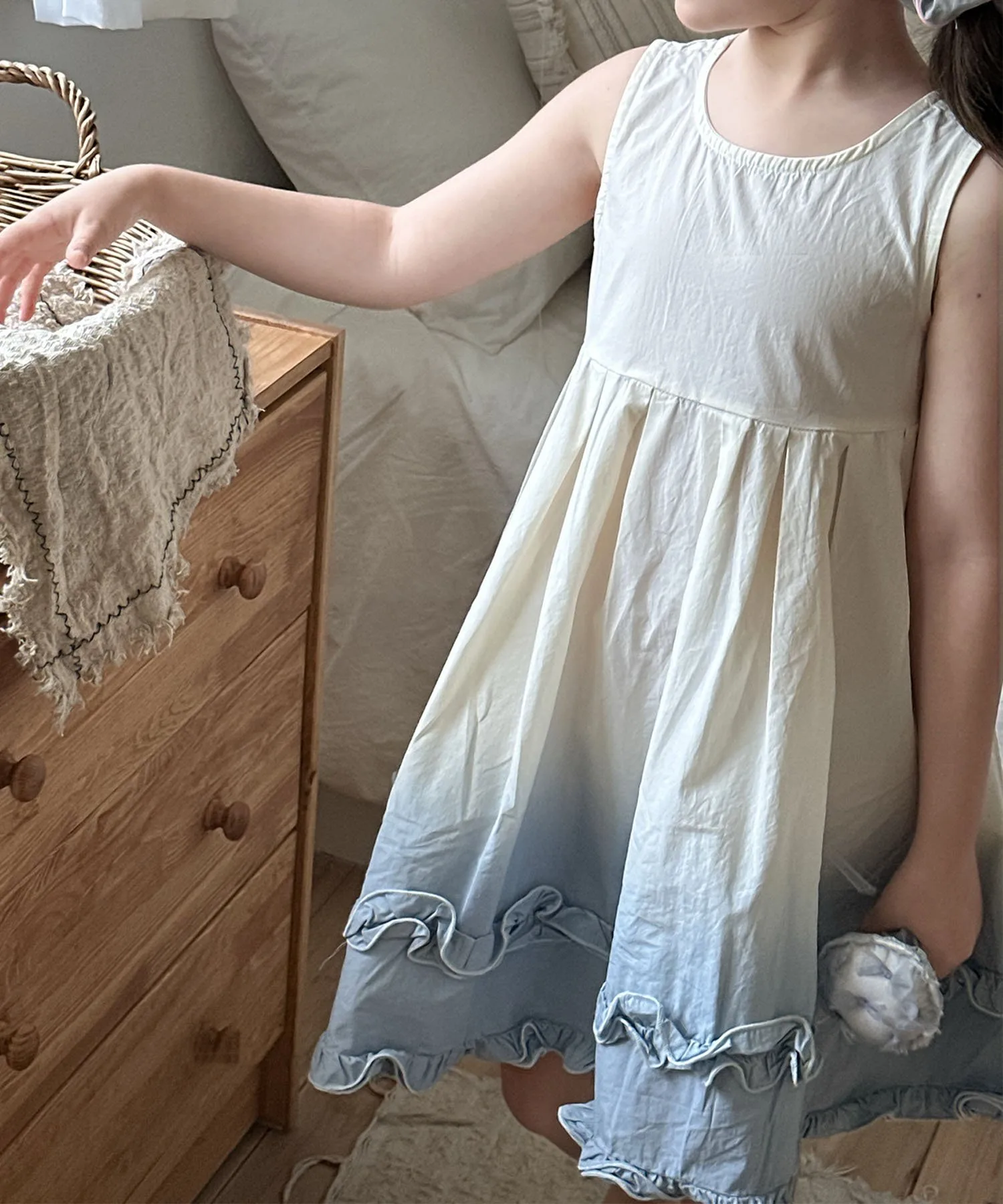Легкое платье с оборками и красивым градиентом цветов, расширяющимся к подолу. Естественная, нежная текстура добавляет стиля.