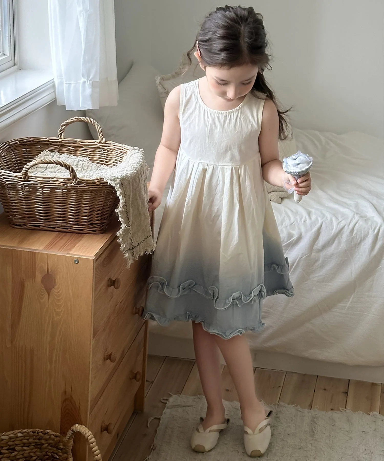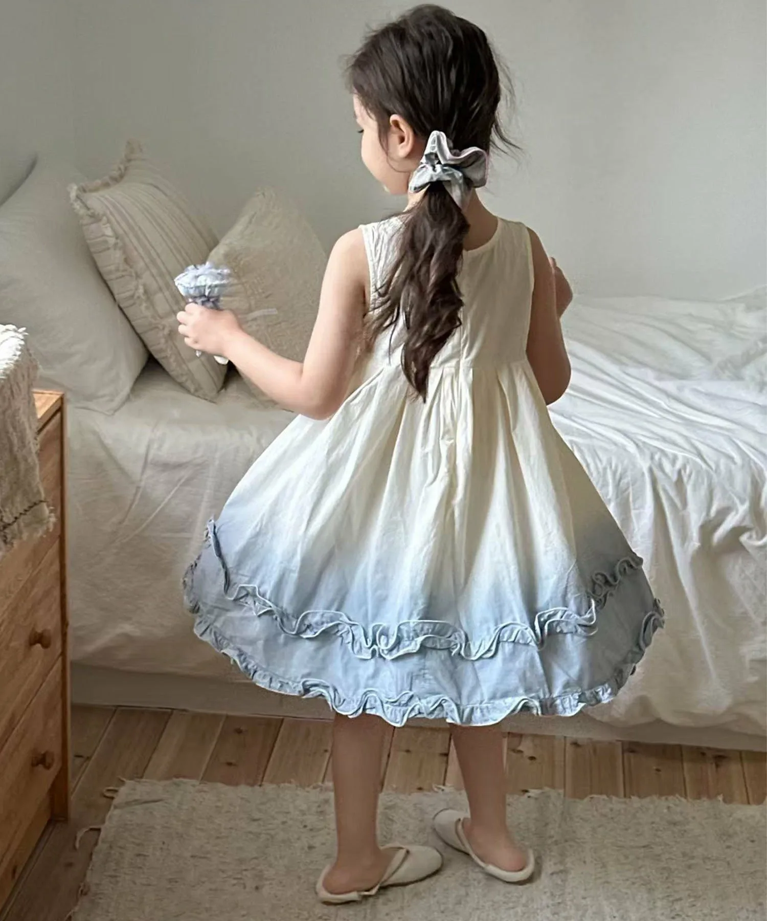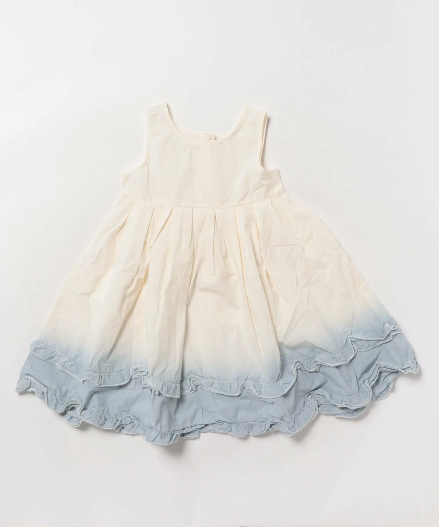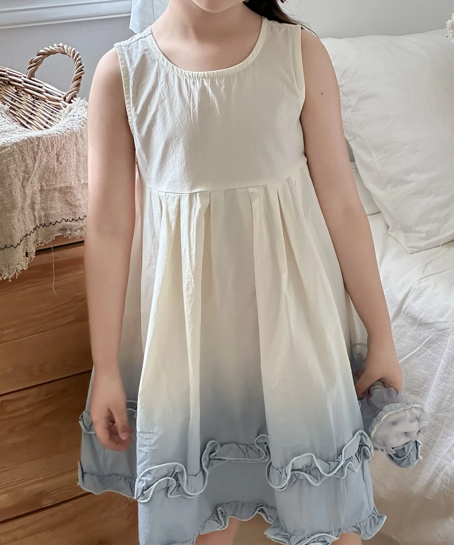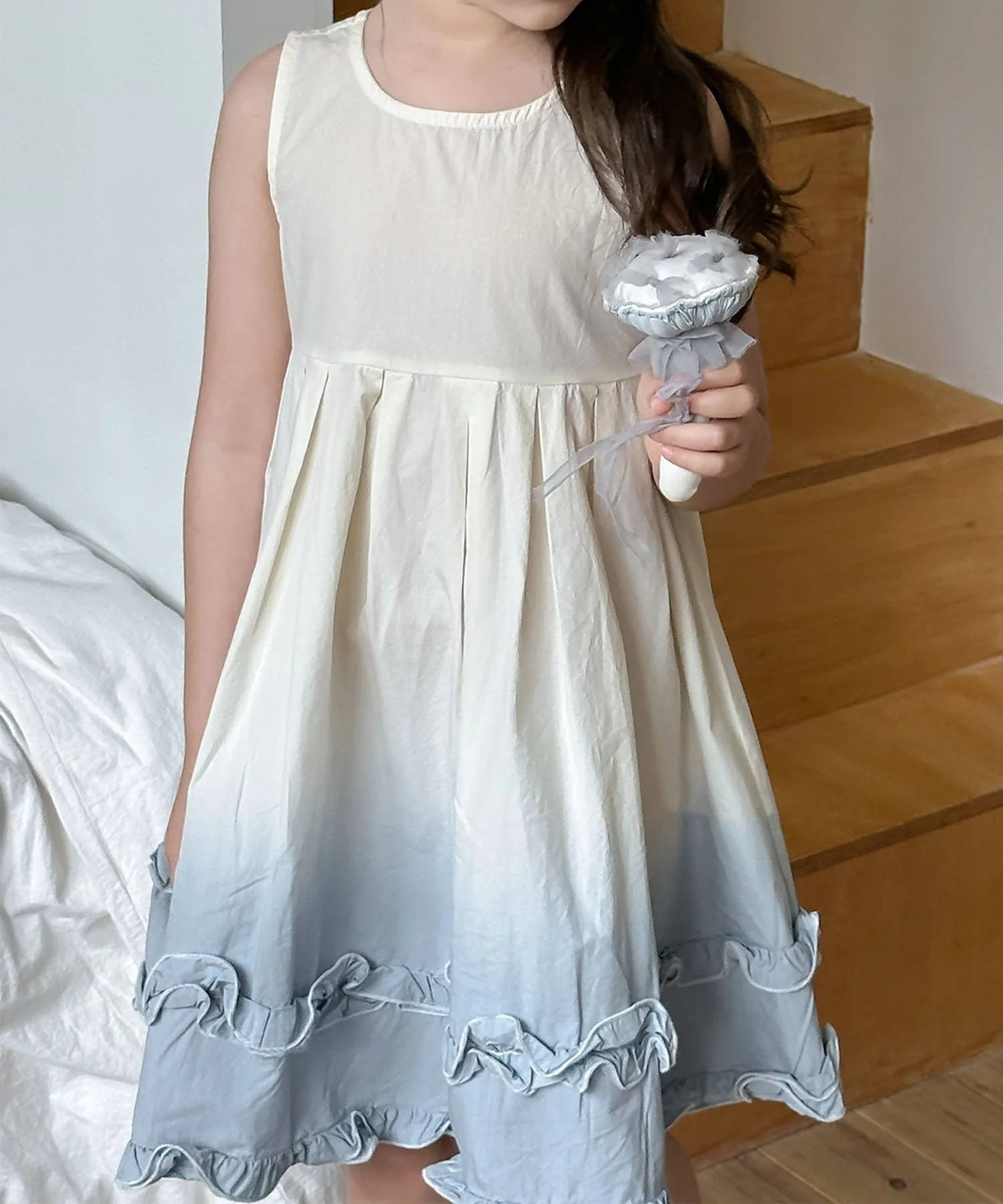 Легкое платье с оборками и красивым градиентом цветов, расширяющимся к подолу. Естественная, нежная текстура добавляет стиля.