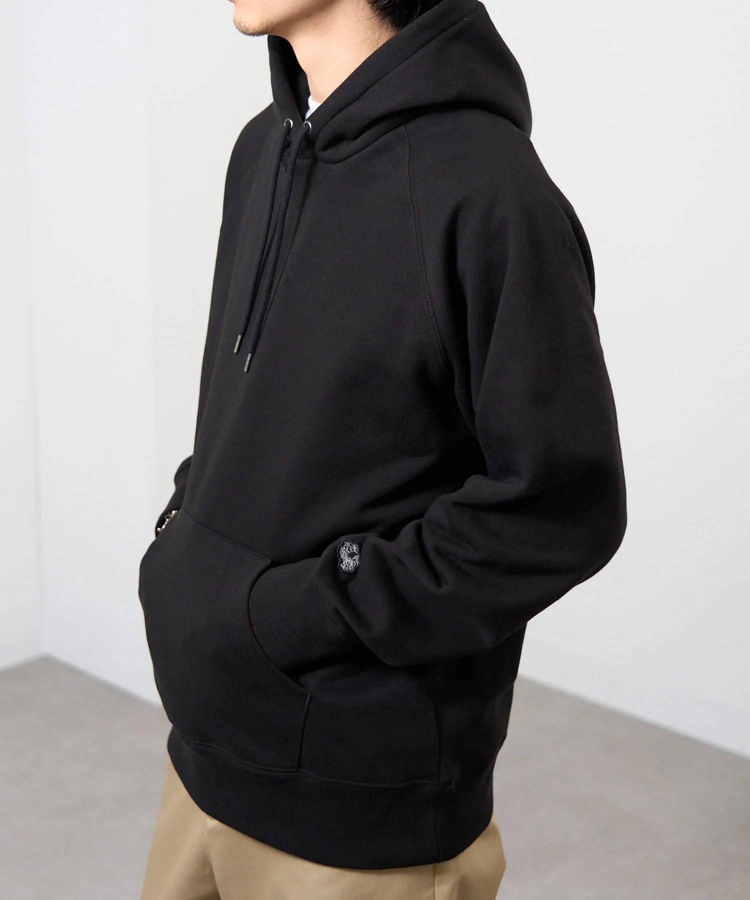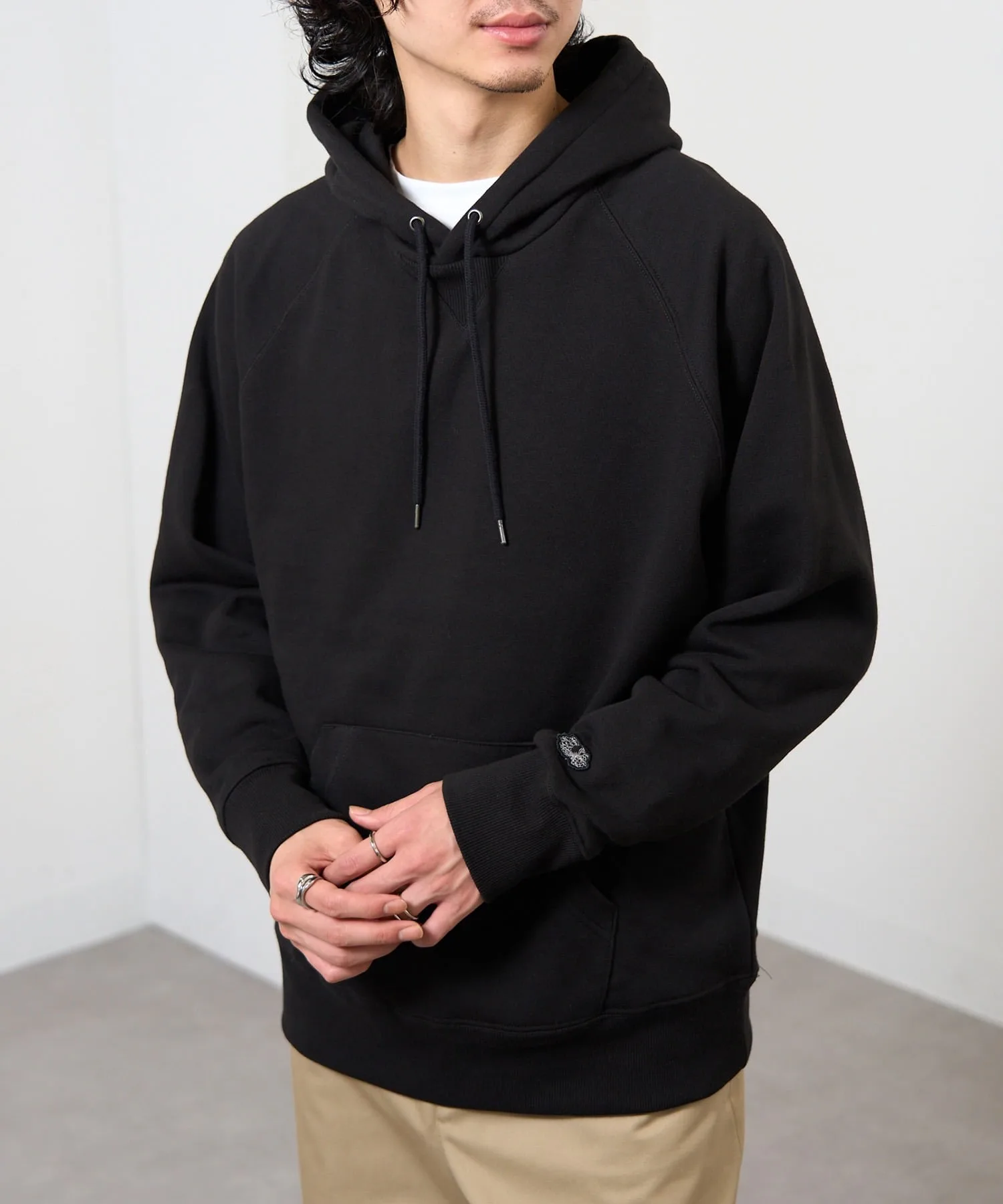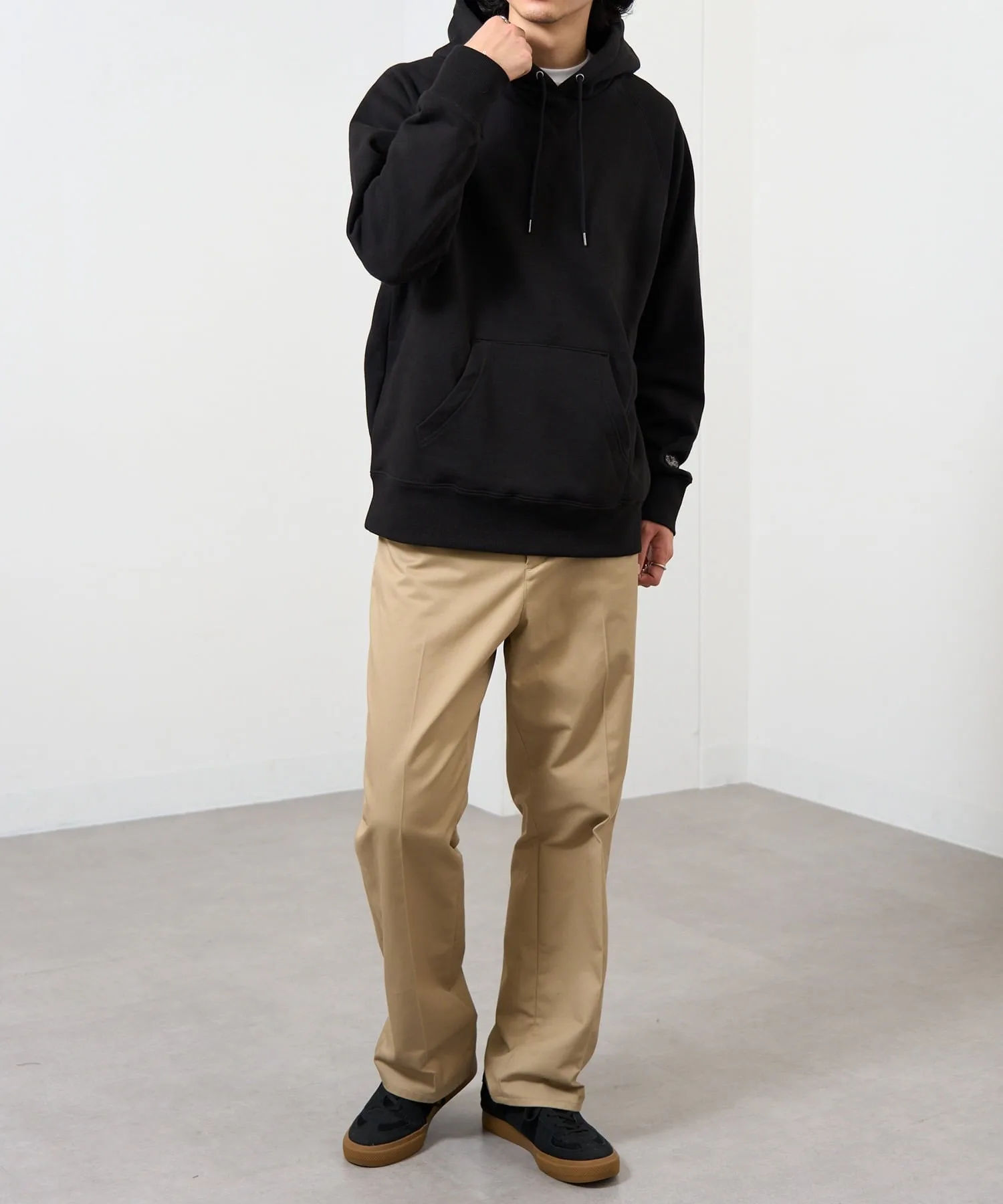 Сочетание・Сочетайте ее с простыми джинсами и белыми кроссовками для непринужденного повседневного образа. ・Сочетайте его с брюками на флисовой подкладке для создания расслабленного, непринужденного образа. ・Легко создайте спортивный образ для выхода в свет, добавив кепку и спортивные брюки. ・В дни, когда вы хотите добавить немного цвета, сочетайте его с брюками приглушенного цвета для создания изысканного образа, где худи является центральным элементом.