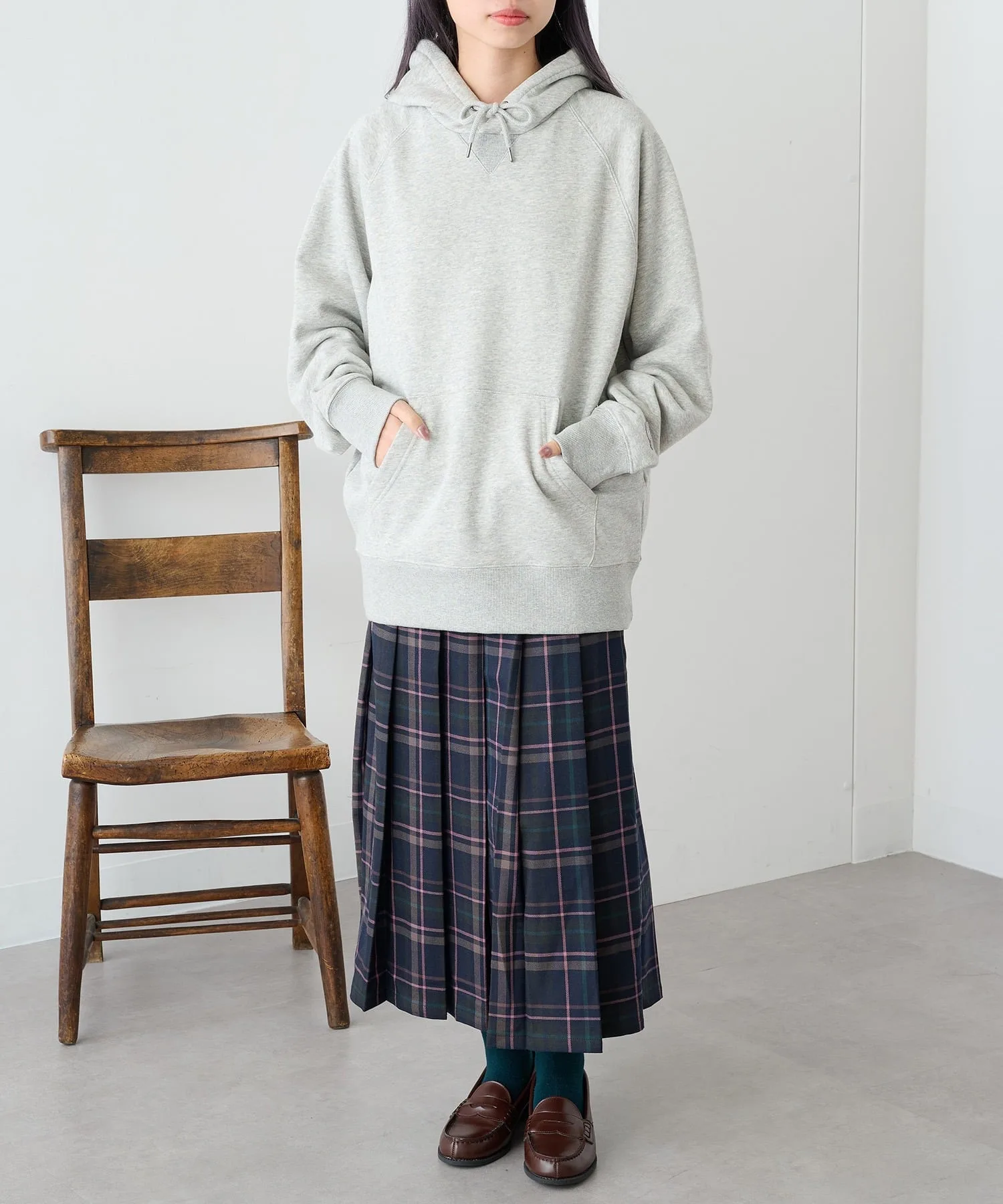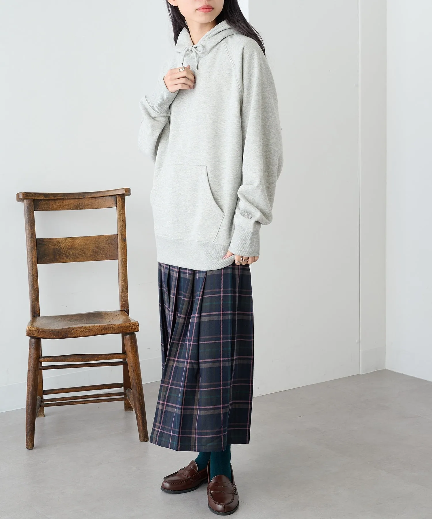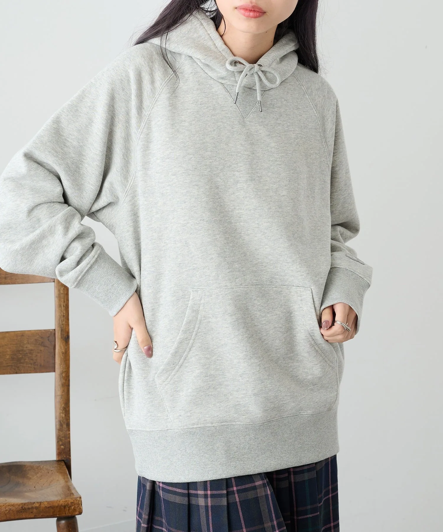 Сочетание・Сочетайте ее с простыми джинсами и белыми кроссовками для непринужденного повседневного образа. ・Сочетайте его с брюками на флисовой подкладке для создания расслабленного, непринужденного образа. ・Легко создайте спортивный образ для выхода в свет, добавив кепку и спортивные брюки. ・В дни, когда вы хотите добавить немного цвета, сочетайте его с брюками приглушенного цвета для создания изысканного образа, где худи является центральным элементом.