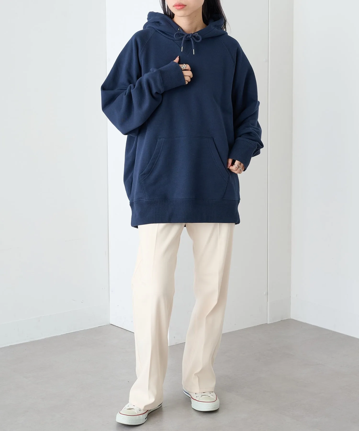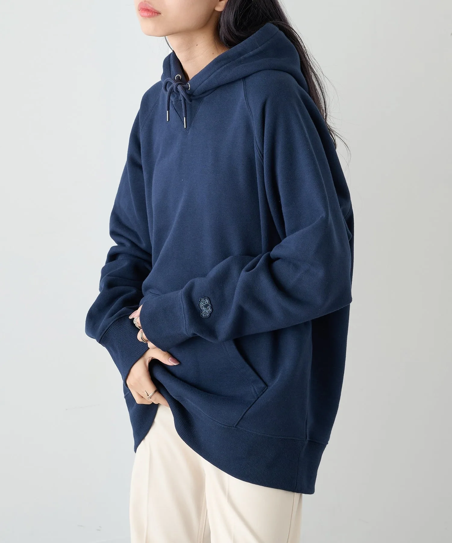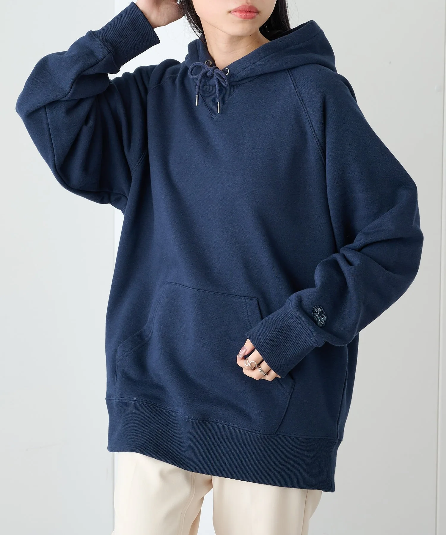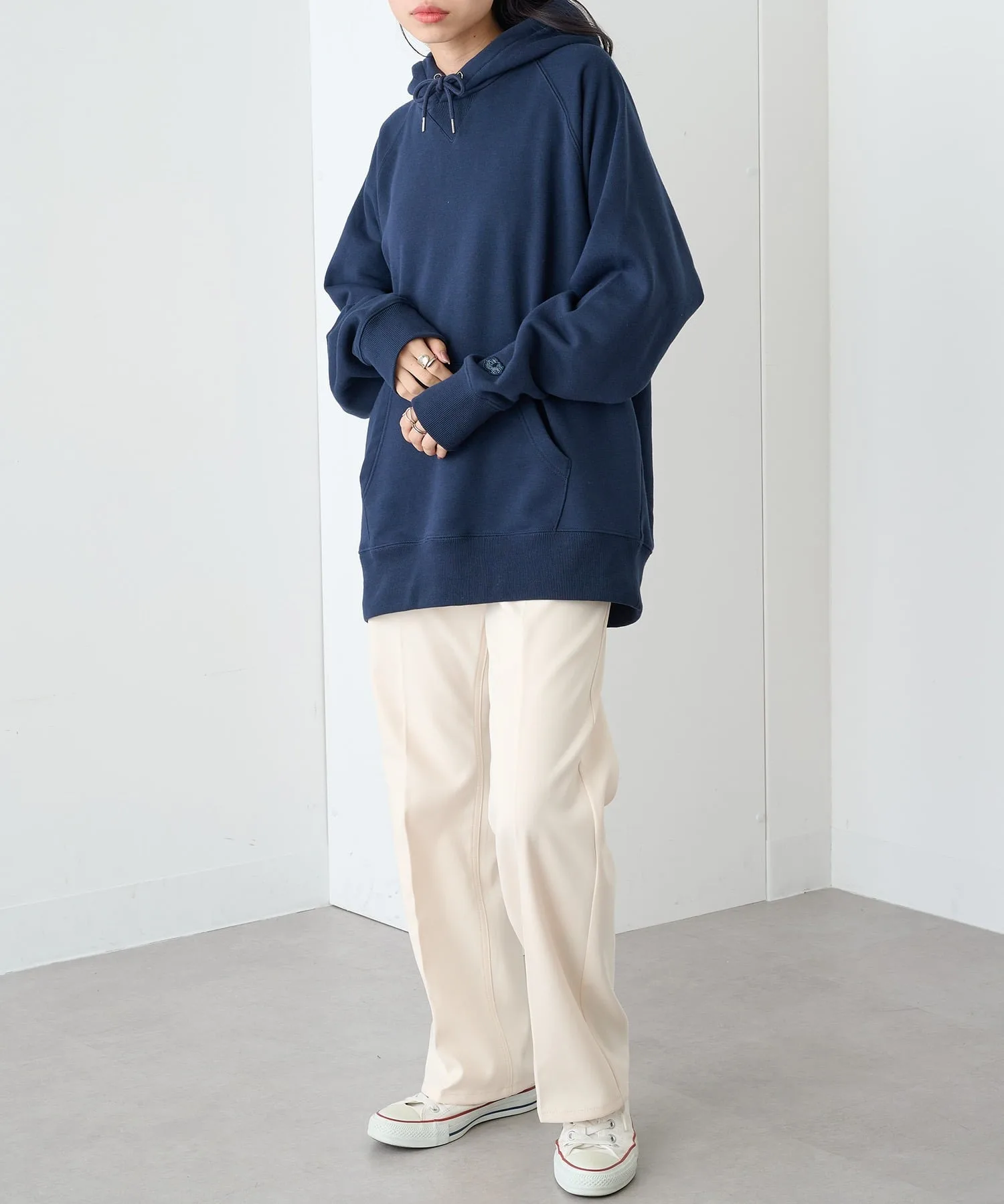 Сочетание・Сочетайте ее с простыми джинсами и белыми кроссовками для непринужденного повседневного образа. ・Сочетайте его с брюками на флисовой подкладке для создания расслабленного, непринужденного образа. ・Легко создайте спортивный образ для выхода в свет, добавив кепку и спортивные брюки. ・В дни, когда вы хотите добавить немного цвета, сочетайте его с брюками приглушенного цвета для создания изысканного образа, где худи является центральным элементом.