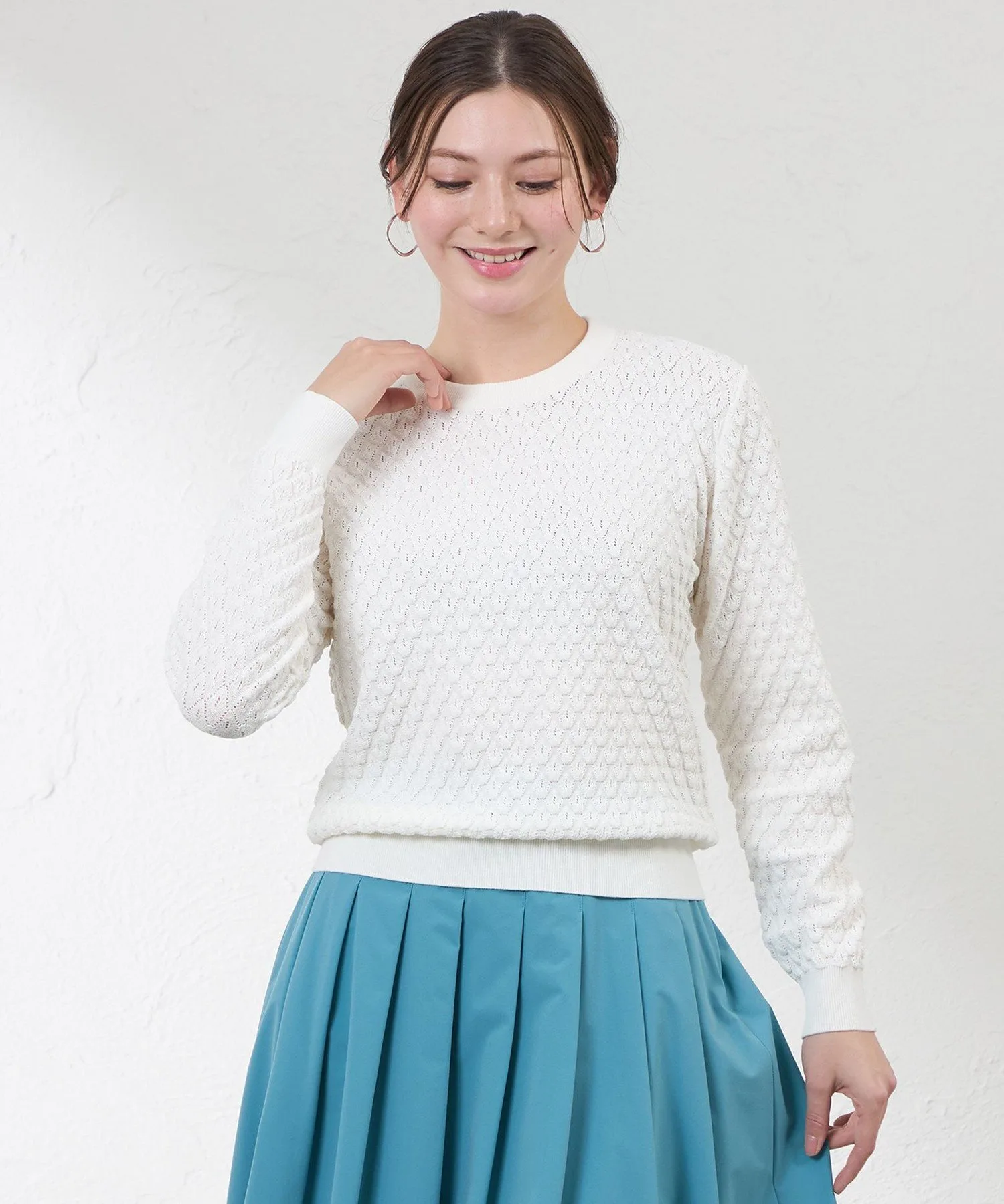Пуловер свободного кроя с круглым вырезом и нежным кружевным узором, напоминающим ракушки.
