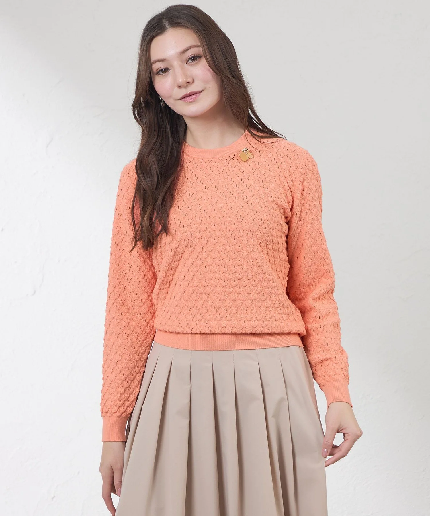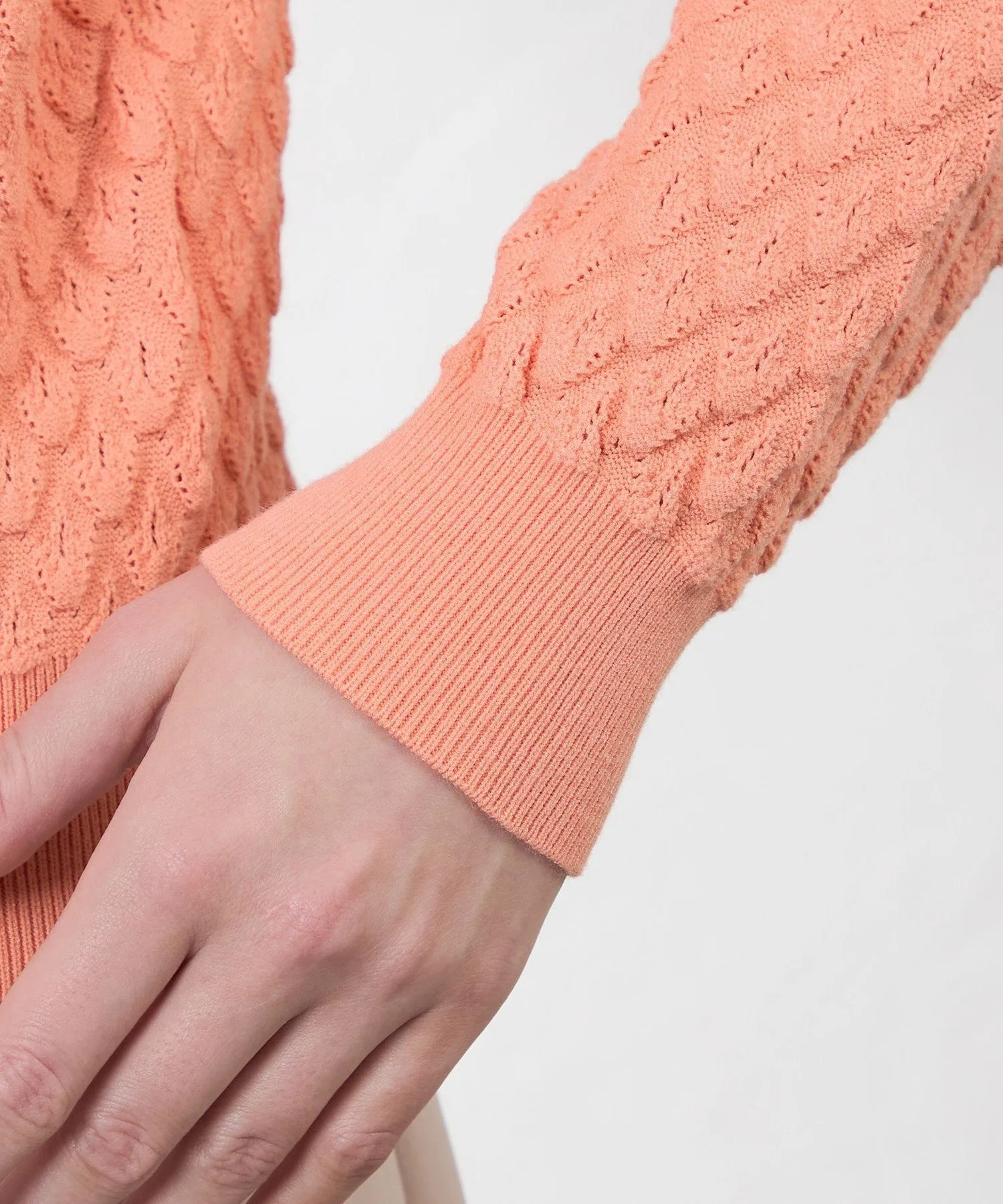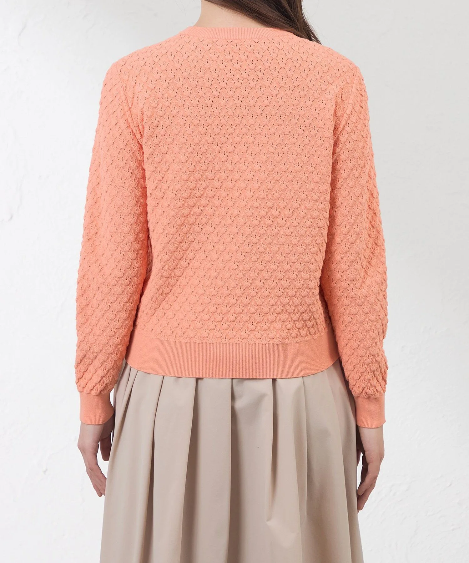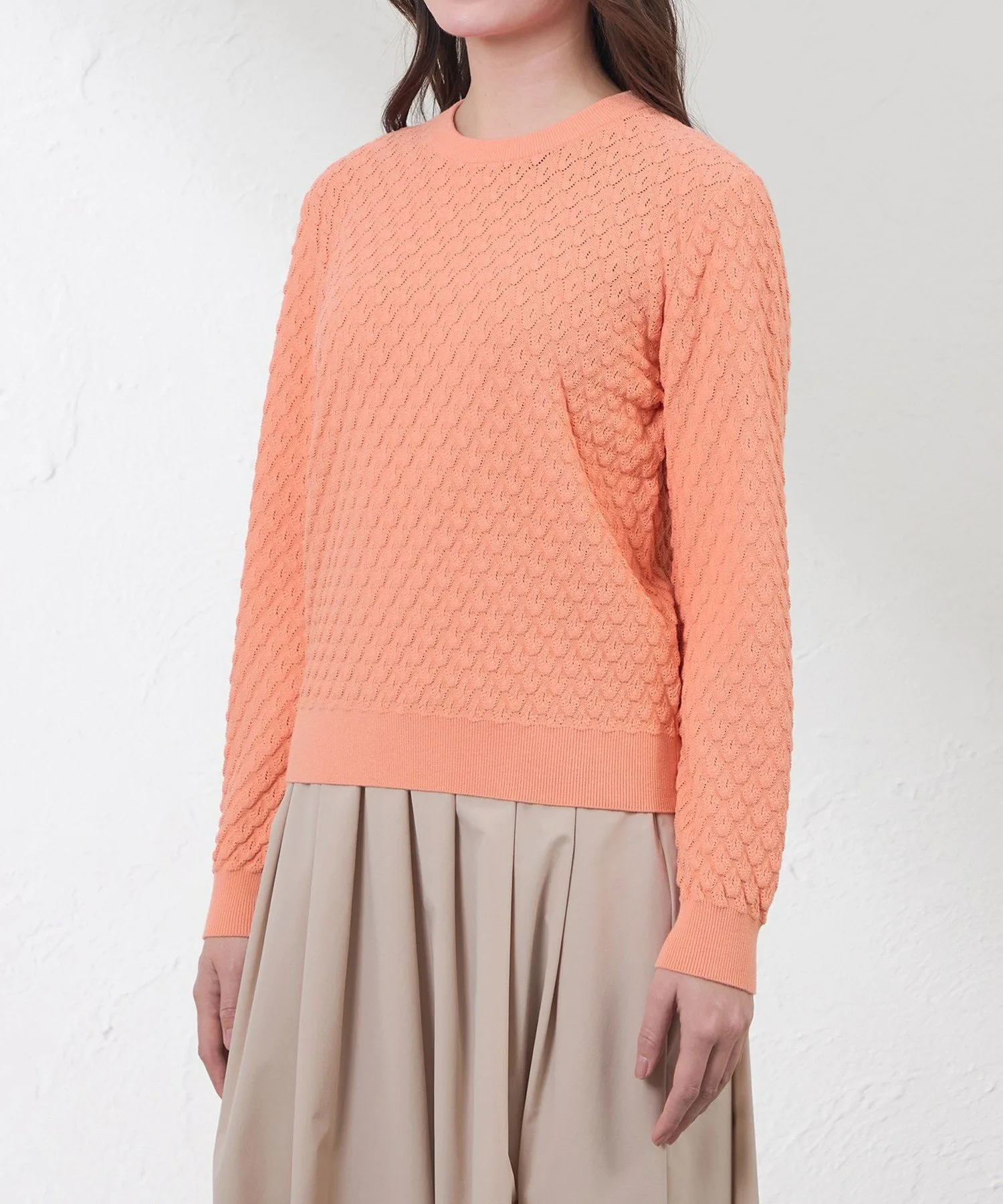 Пуловер свободного кроя с круглым вырезом и нежным кружевным узором, напоминающим ракушки.