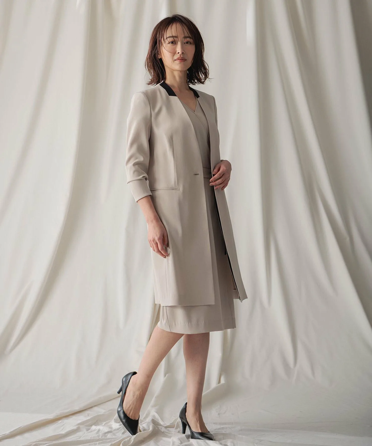 Это женственное платье отлично смотрится само по себе. Халат позволяет немного регулировать размер, создавая аккуратный и выгодно подчеркивающий фигуру силуэт. Пояс на талии соответствует цвету жакета, создавая гармоничный образ при ношении с костюмом. Это платье-халат универсально и может носиться как самостоятельный элемент гардероба для работы, особых случаев или повседневной носки. *Песочный x Черный (цвет 033) и Ледяной x Белый (цвет 073) поставляются с подъюбником.