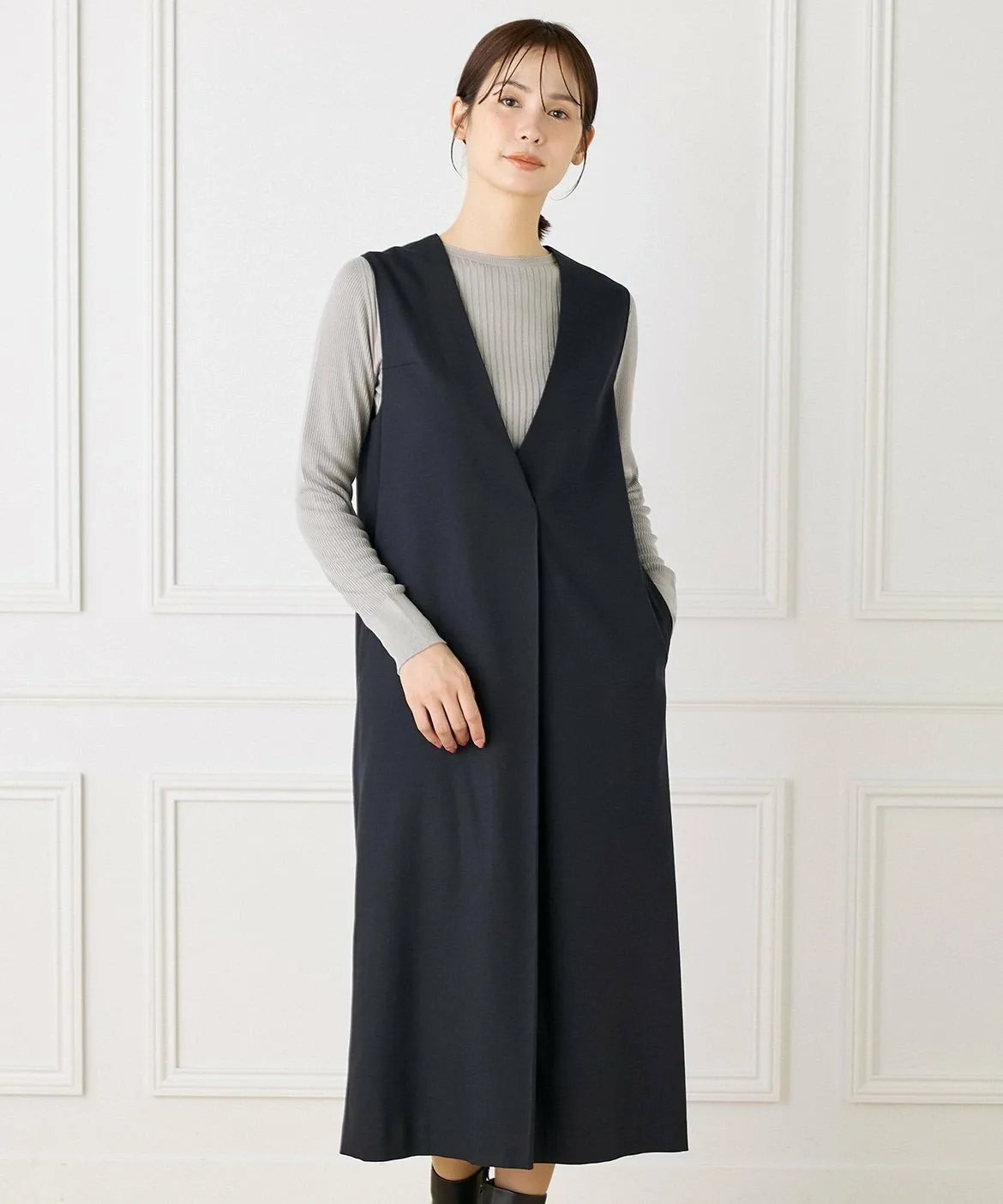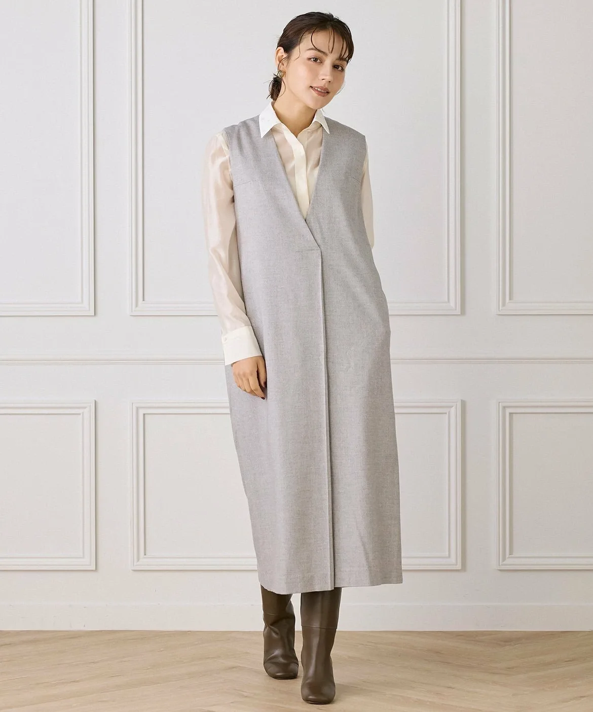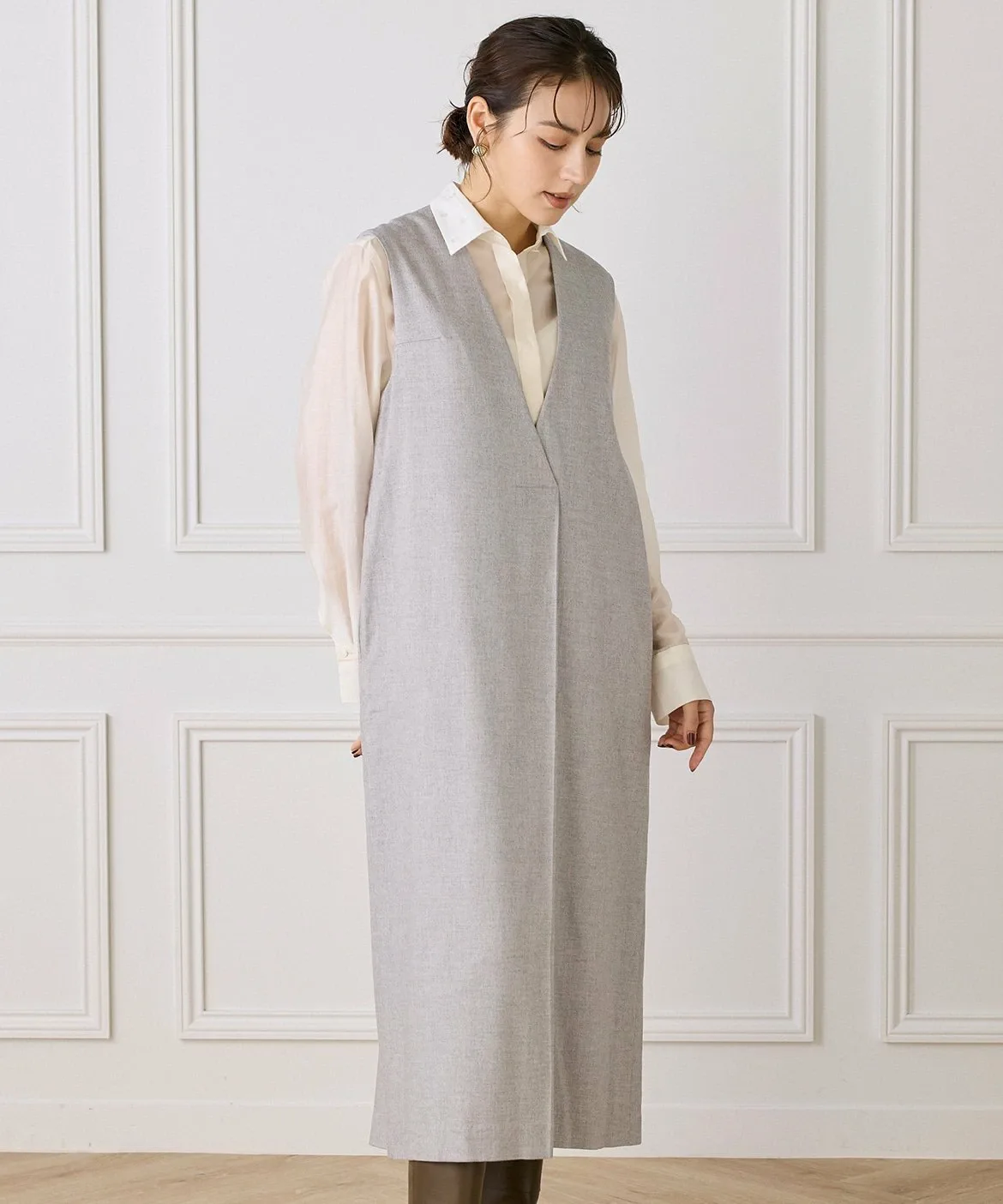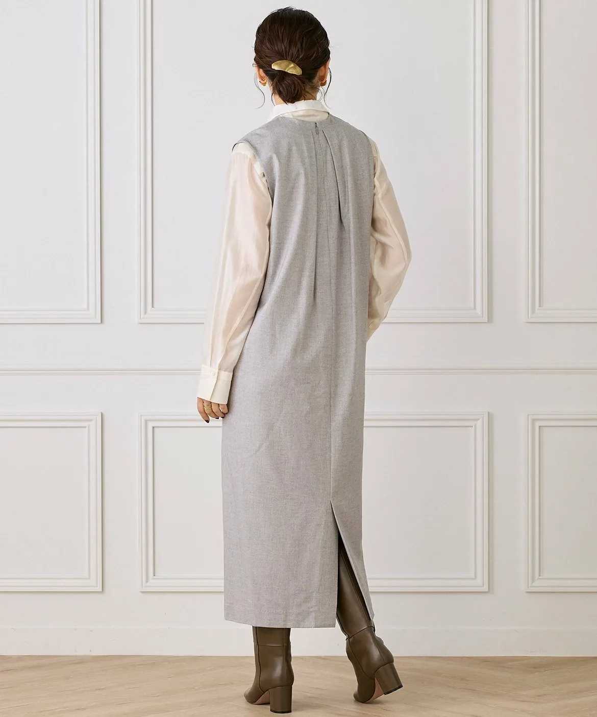 Это многослойное платье сшито из шерсти с роскошным блеском. Глубокий V-образный вырез спереди создает непринужденный образ. Широкий пояс сзади создает контраст между передней и задней частью. Глубокие складки создают силуэт кокона, позволяя создавать разнообразные многослойные образы. Металлические детали в области плавления также являются уникальным штрихом.