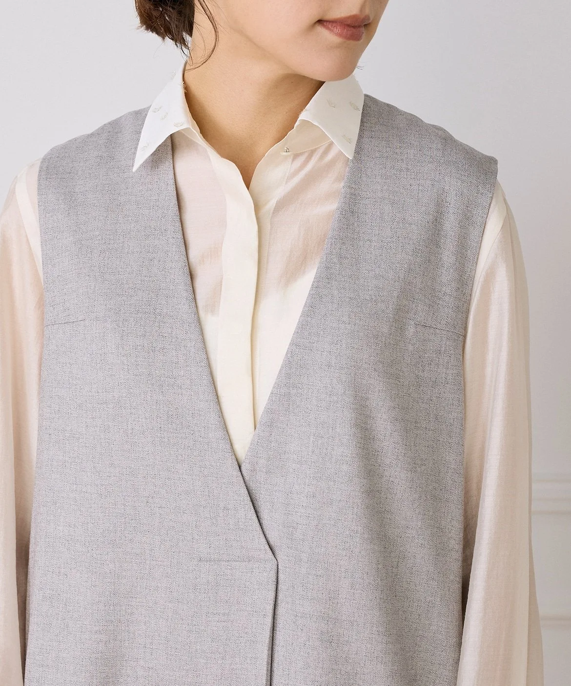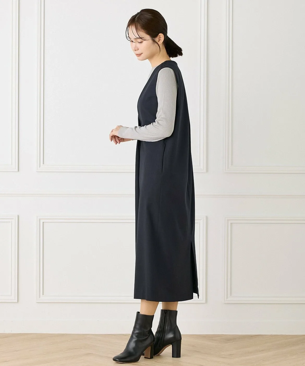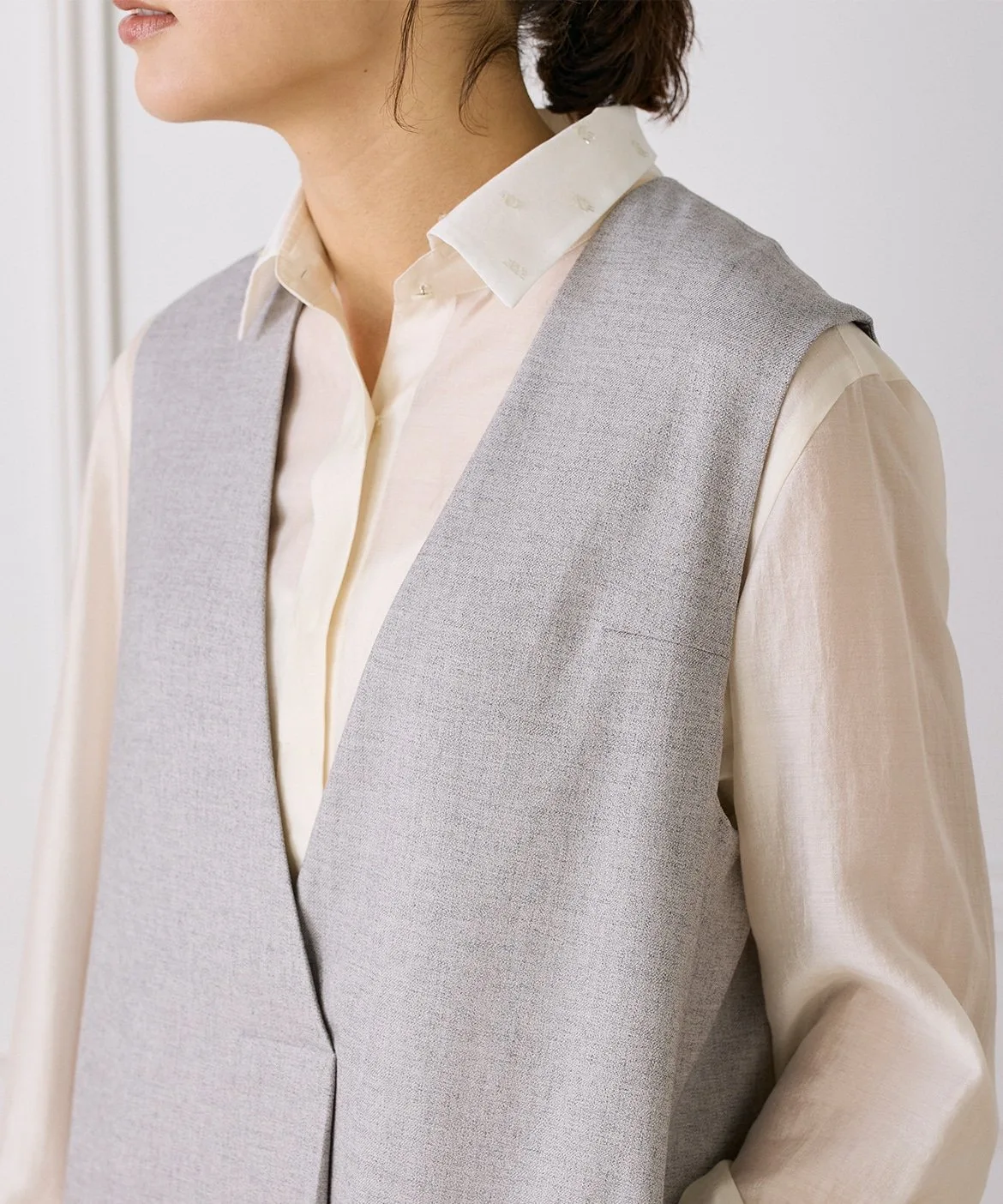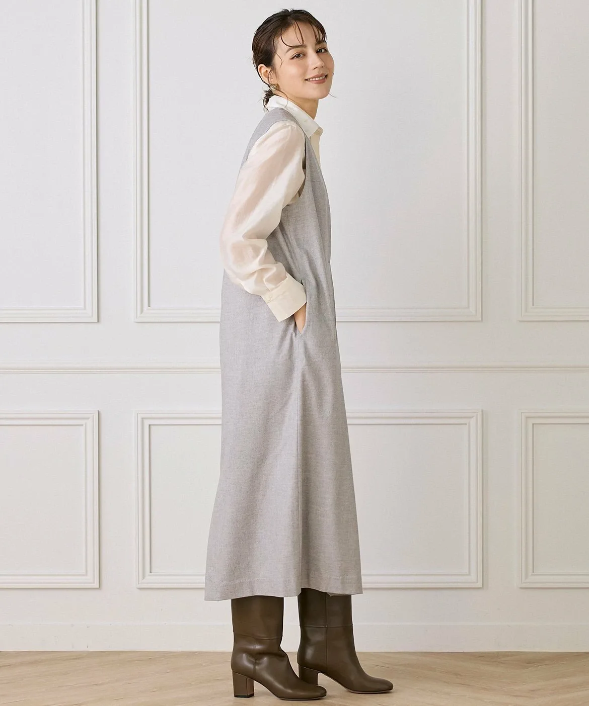 Это многослойное платье сшито из шерсти с роскошным блеском. Глубокий V-образный вырез спереди создает непринужденный образ. Широкий пояс сзади создает контраст между передней и задней частью. Глубокие складки создают силуэт кокона, позволяя создавать разнообразные многослойные образы. Металлические детали в области плавления также являются уникальным штрихом.