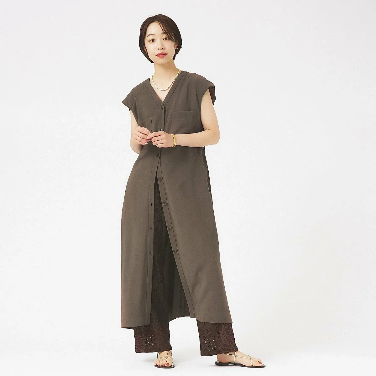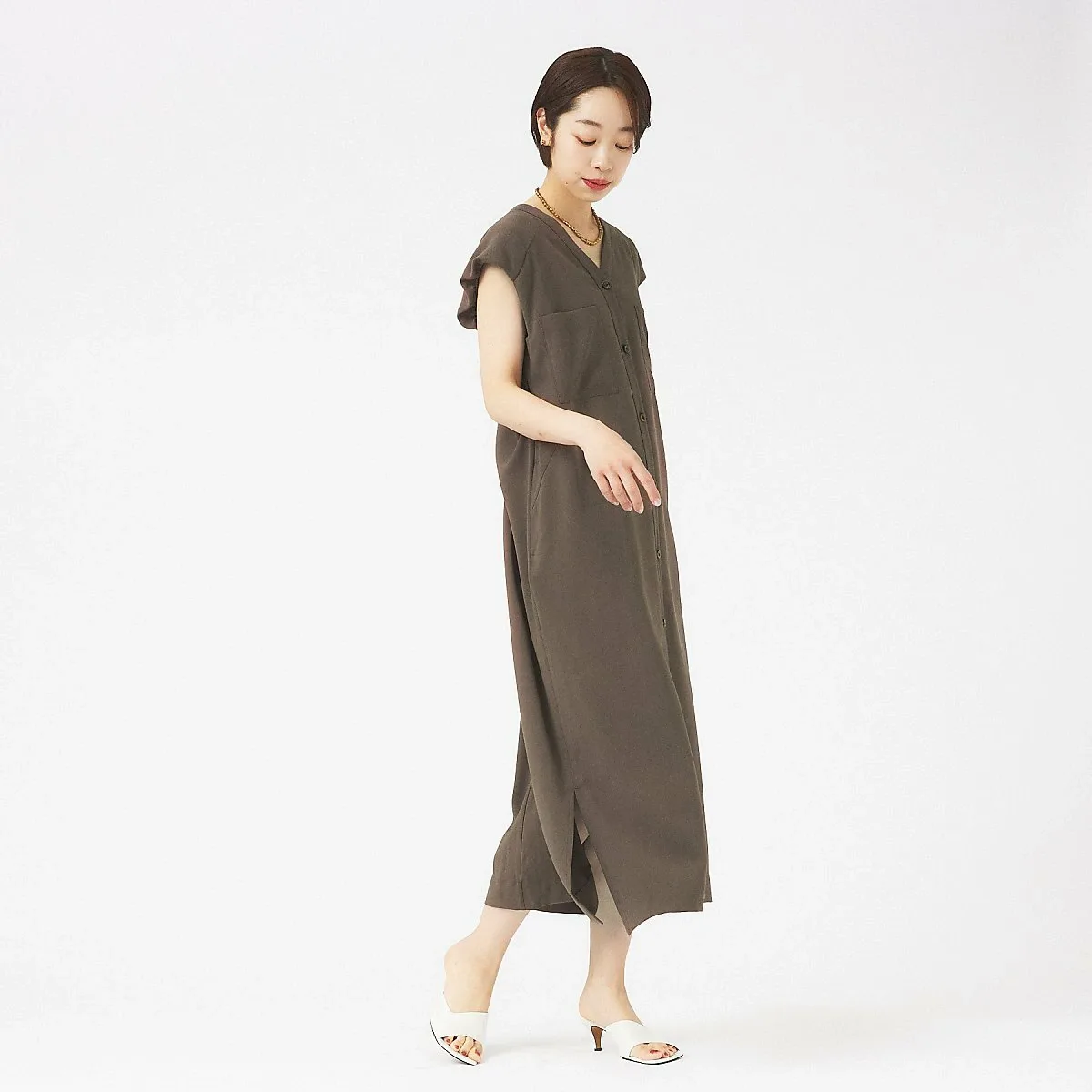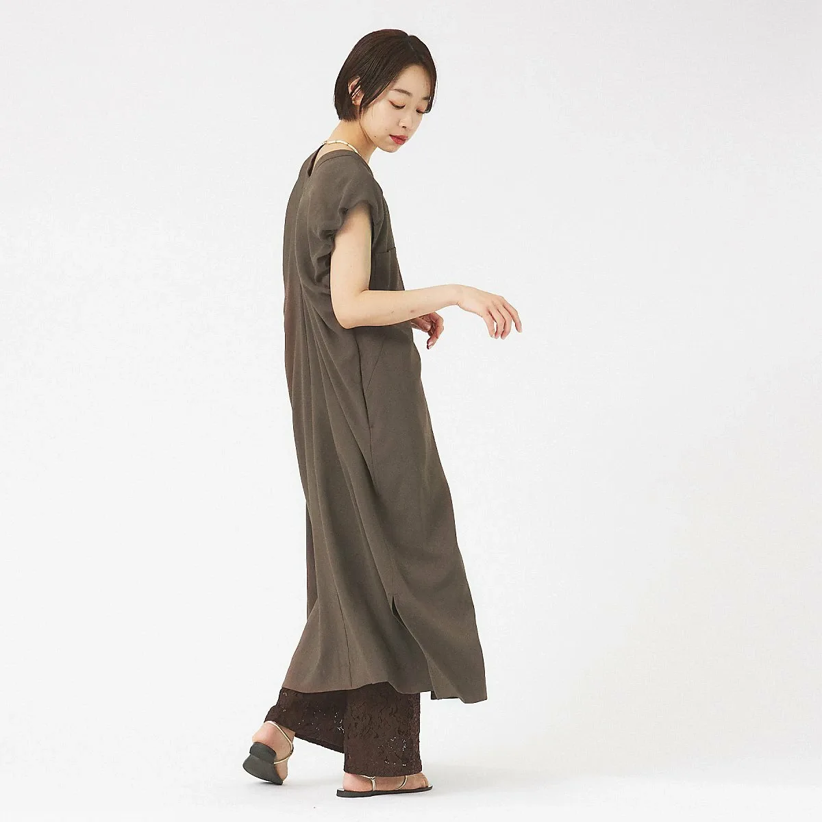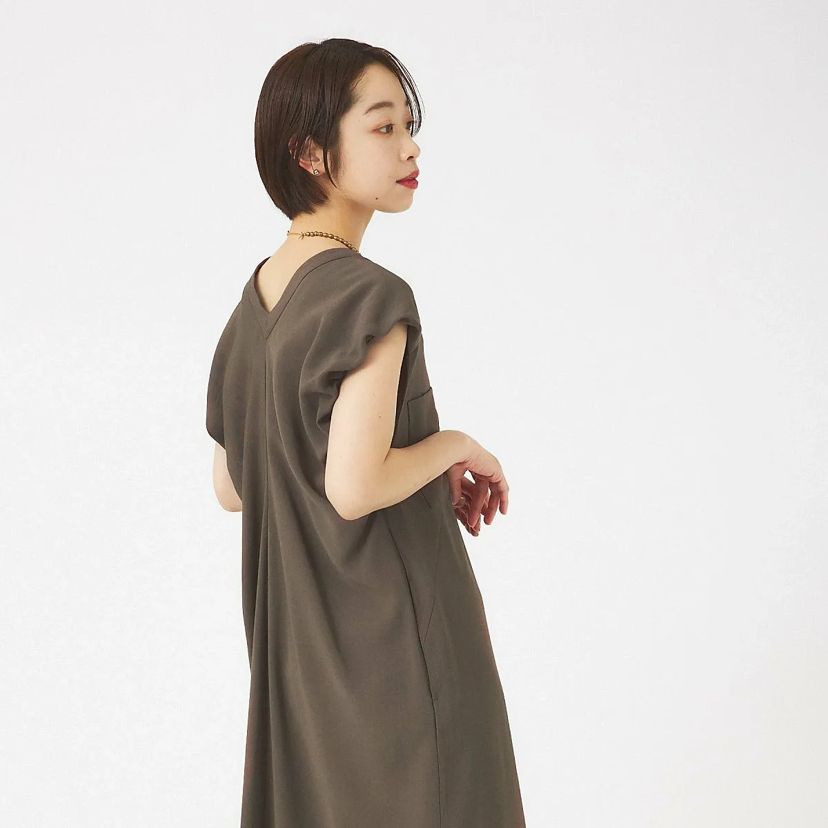 Сборенный по бокам силуэт сзади сужается, создавая общую I-образную линию для чистого и элегантного образа.
