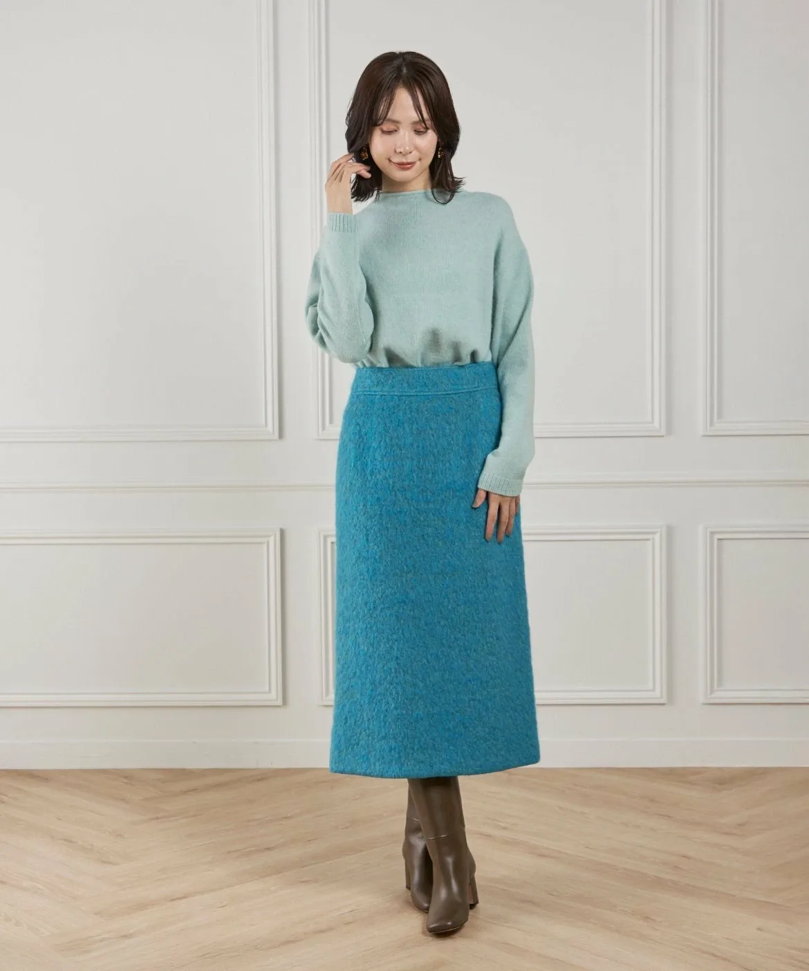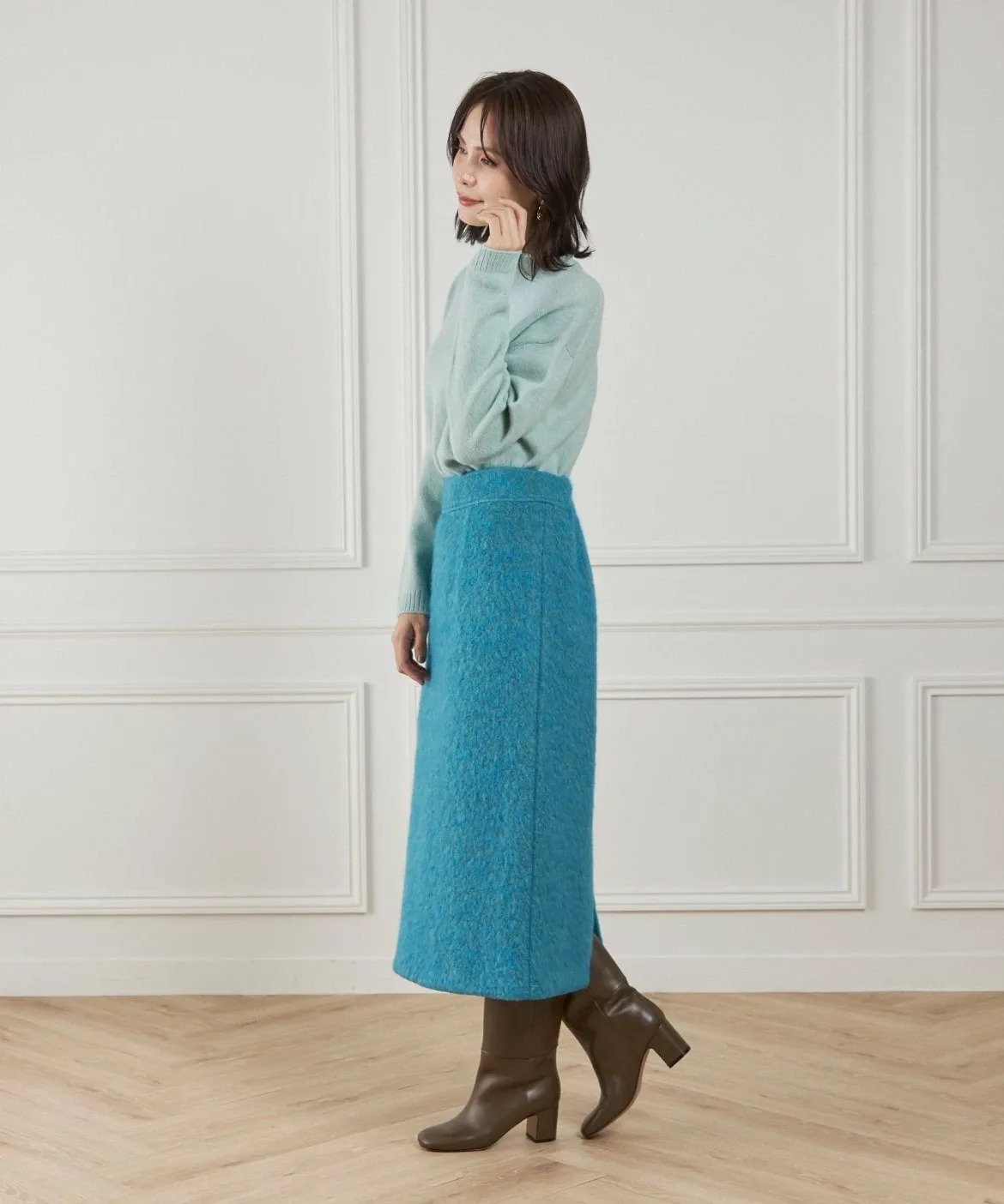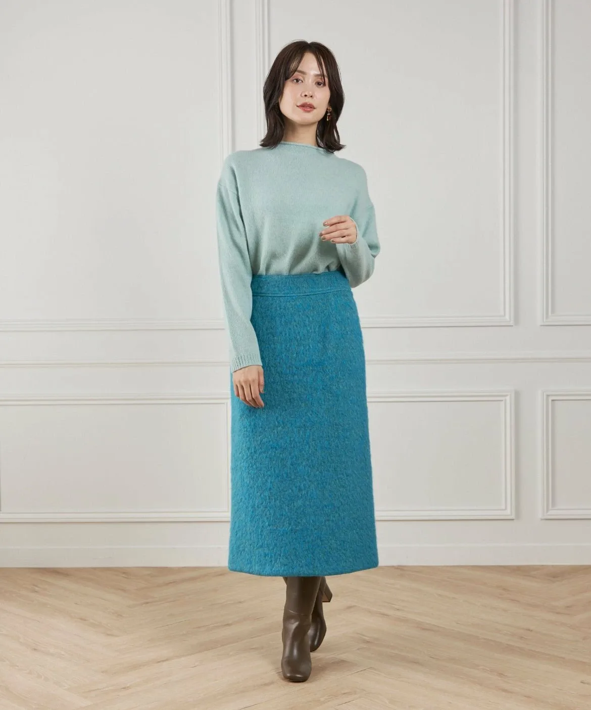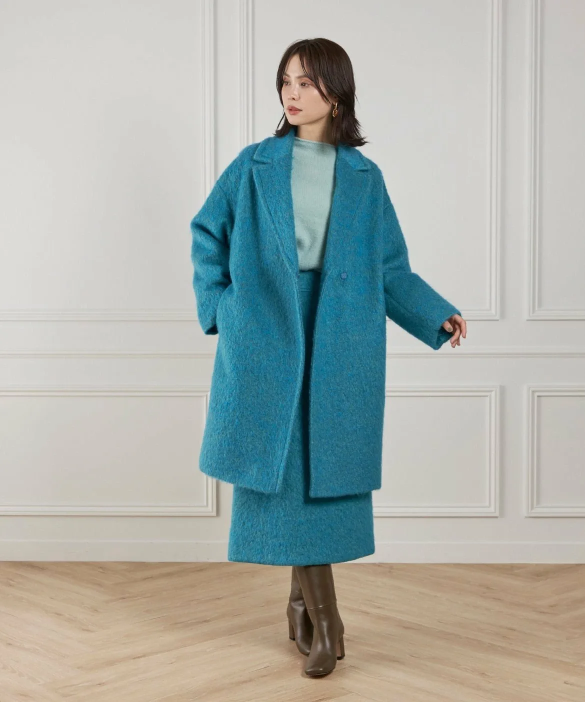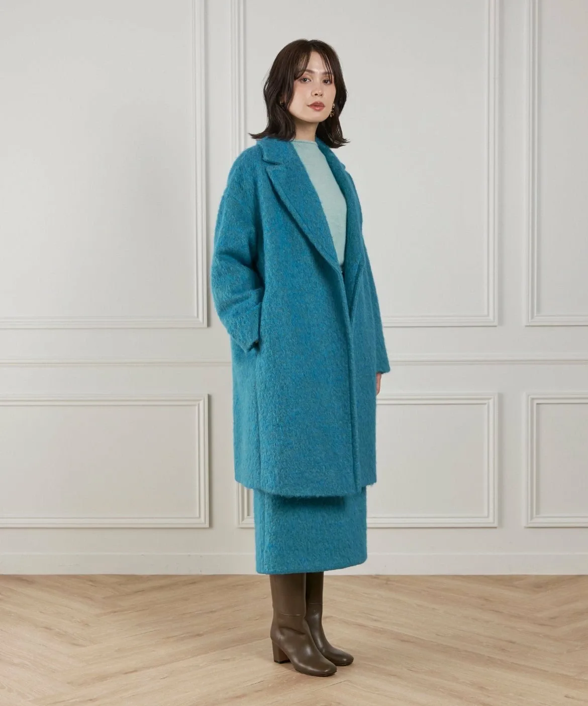 Этот материал для пальто отличается яркой текстурой и насыщенным цветом мохера. Изготовлен из высококачественного необработанного мохера и выразительной петлевой пряжи. Петлевая пряжа нарезается таким образом, чтобы создать уникальный поток, в результате чего получается богатая выразительная отделка, с использованием процесса, называемого «петлевая нарезка пушистого материала». Глубокий цвет, созданный окрашиванием в два разных цвета, и чрезвычайно легкая и пушистая текстура также являются ключевыми особенностями. Это ткань отечественного производства, все процессы прядения, вязания и обработки выполняются внутри страны.