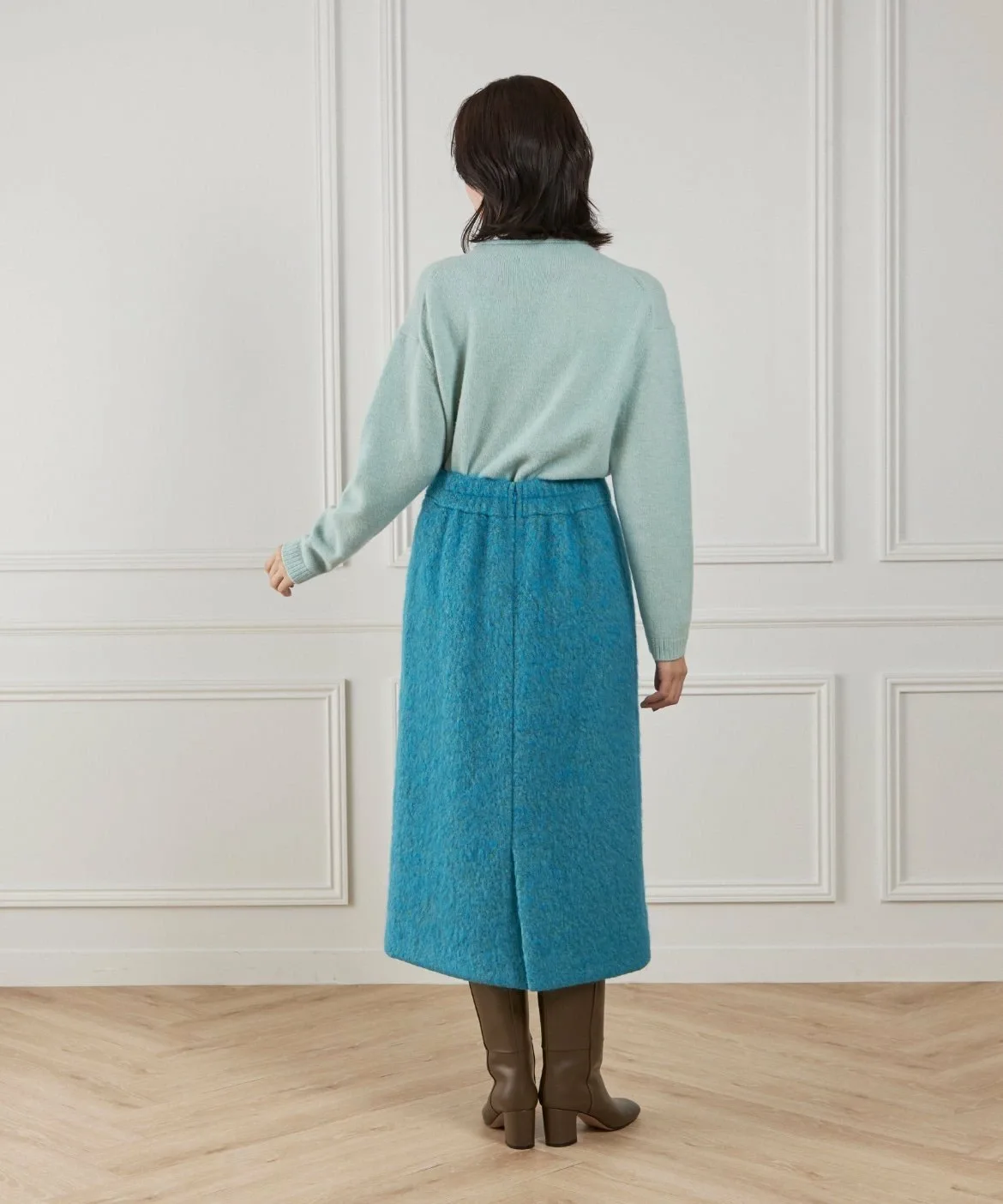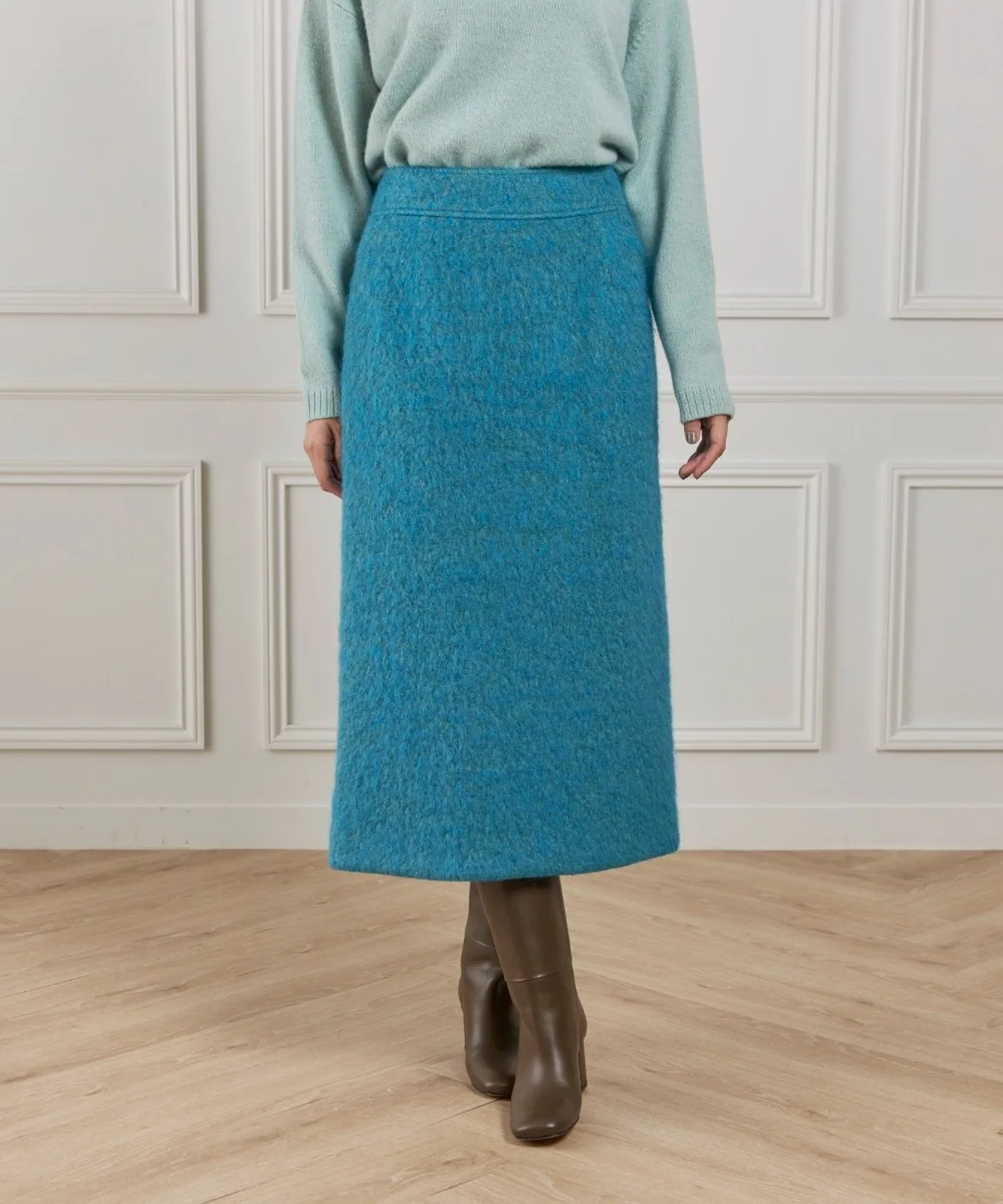 Простая юбка прямого кроя, которая максимально подчеркивает текстуру пушистого материала. Обтекаемая талия позволяет носить юбку заправленной или навыпуск для сбалансированного образа. Умеренный размер и эластичная резинка сзади обеспечивают комфорт при ношении. Прорезные карманы с обеих сторон добавляют практичности. Немного удлиненная длина создает стильный и современный образ.