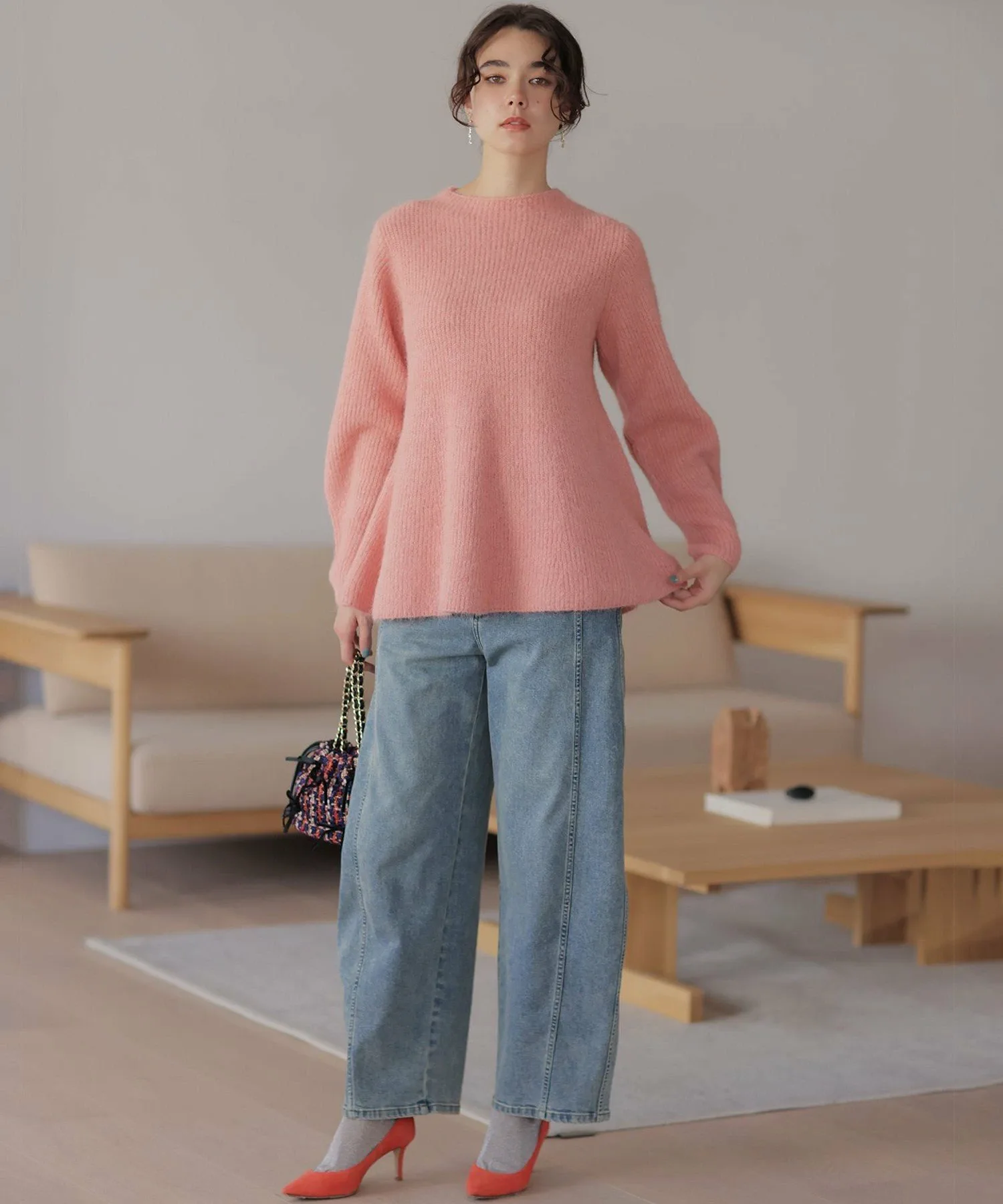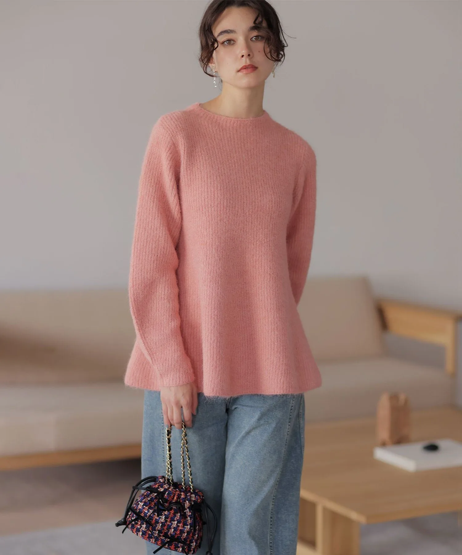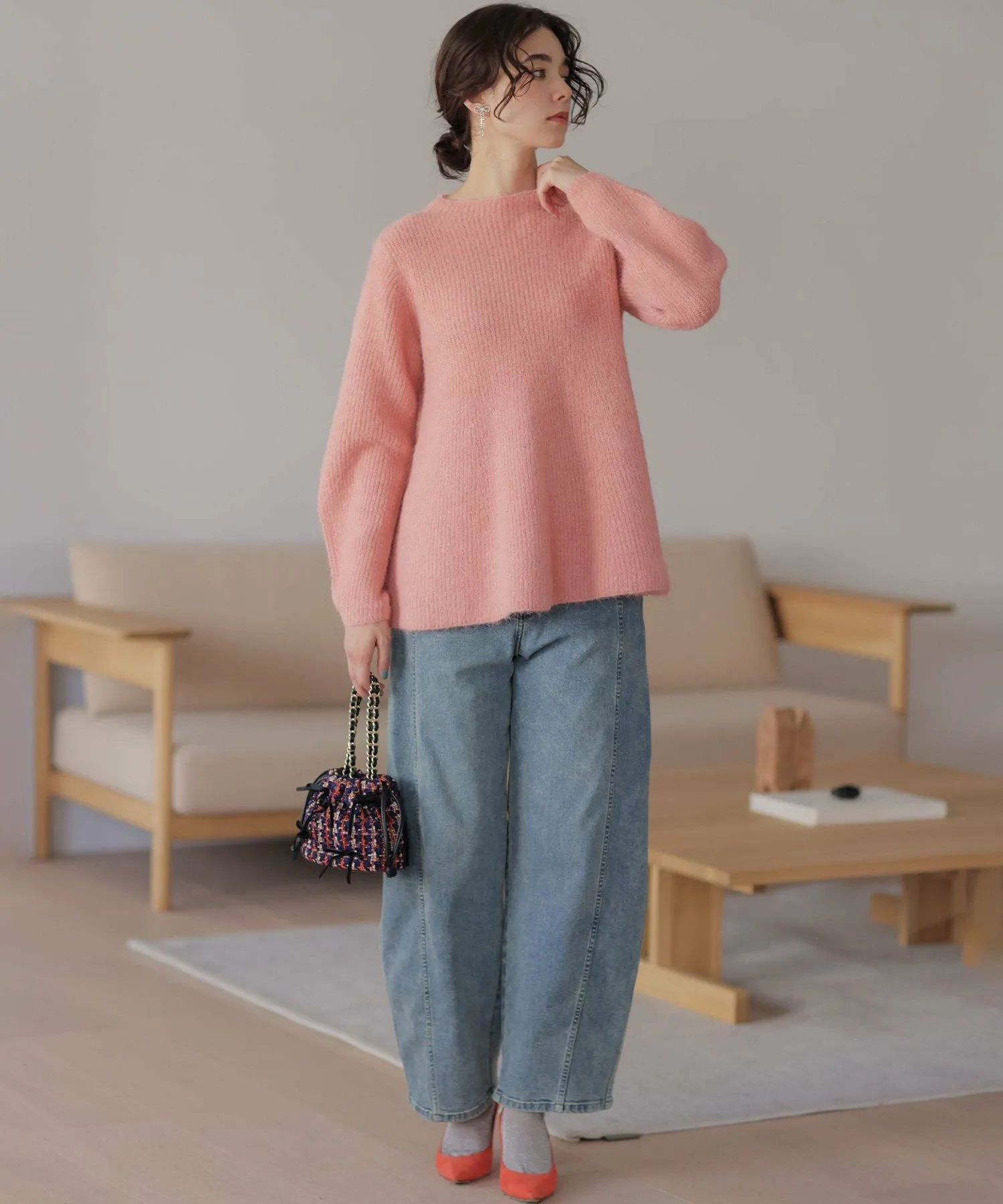Материал・Благодаря естественному мягкому блеску, пушистый материал легче, чем кажется, обеспечивая комфортное ношение. ・Небольшое количество шерсти придает материалу теплоту и естественность.