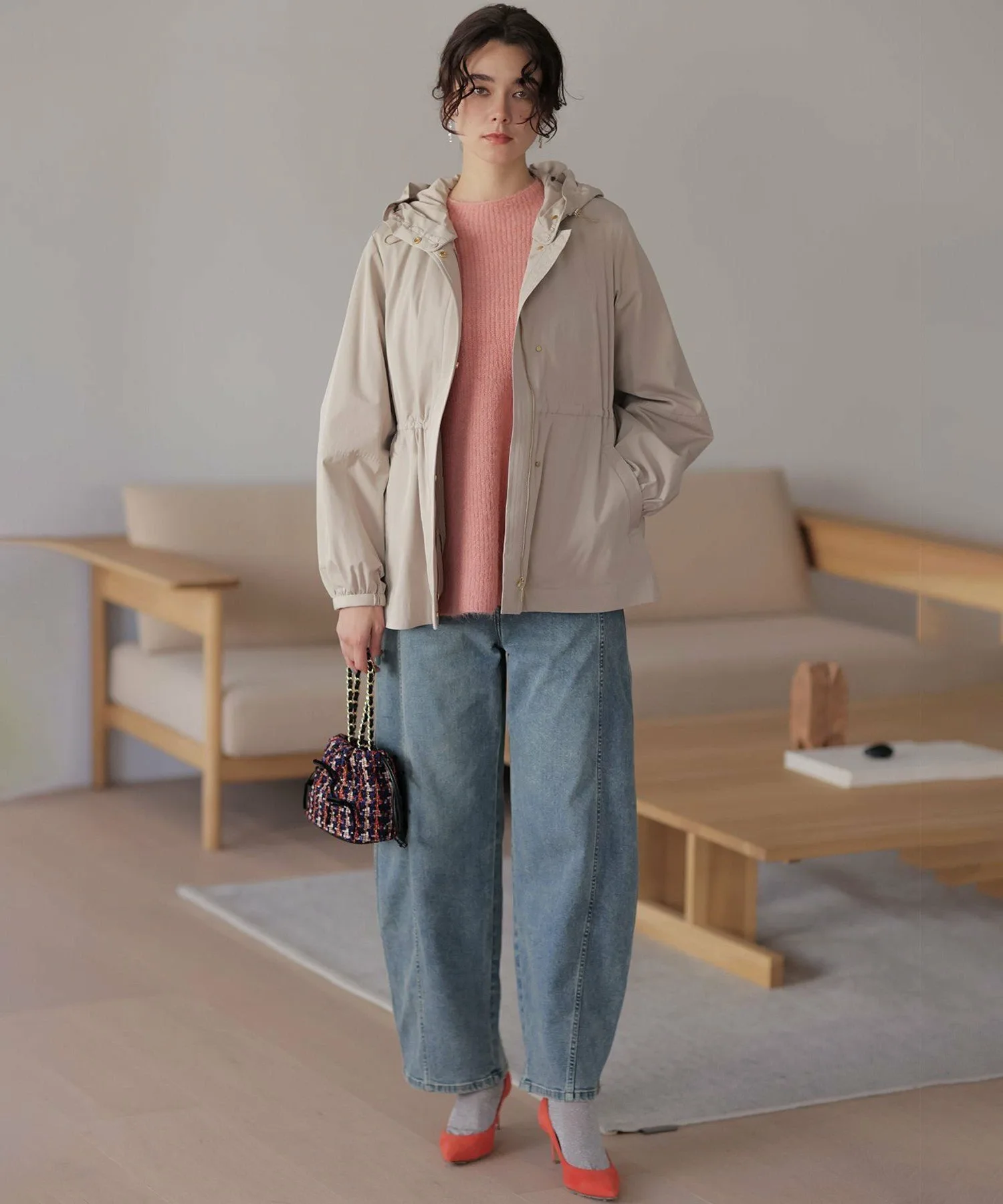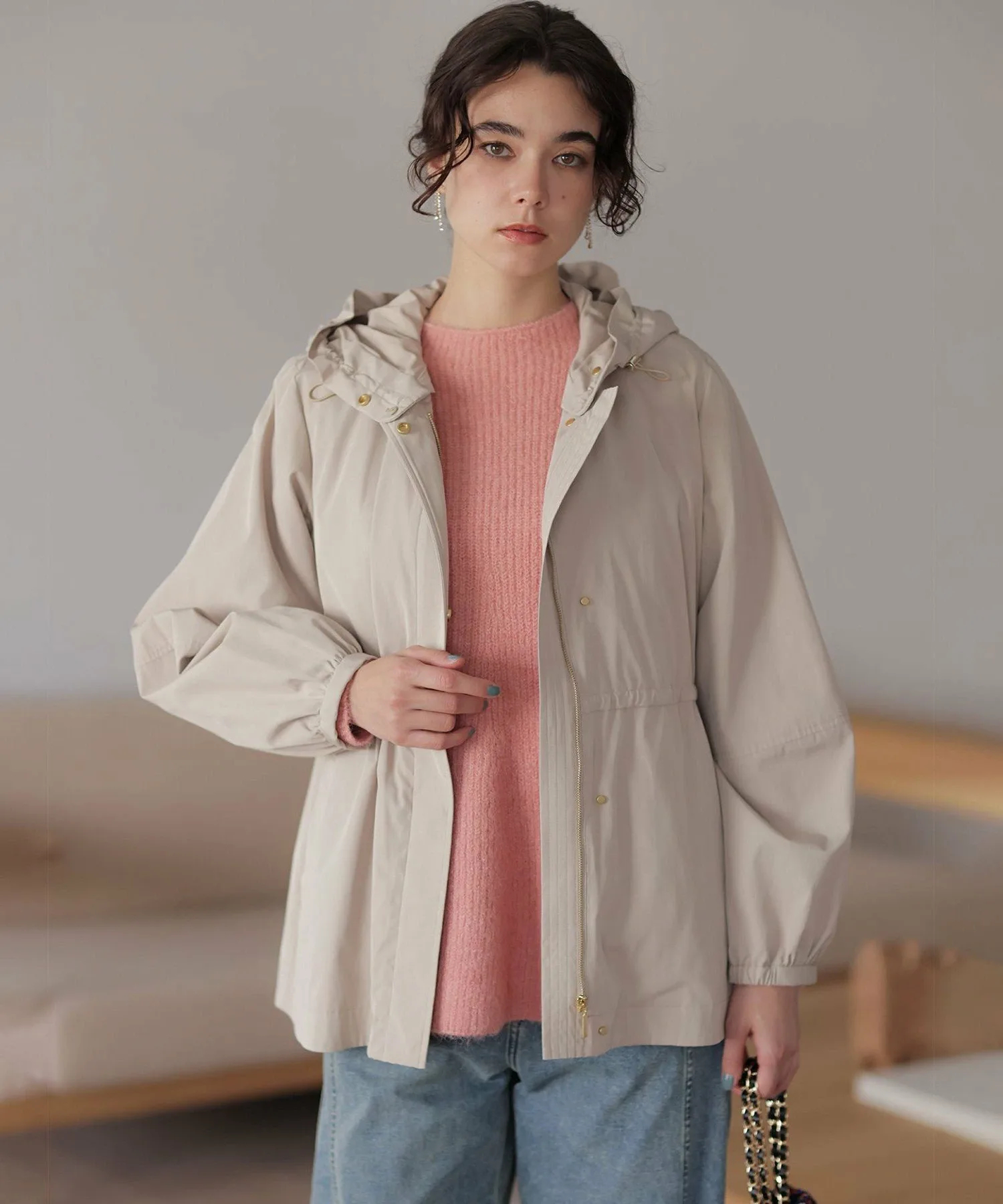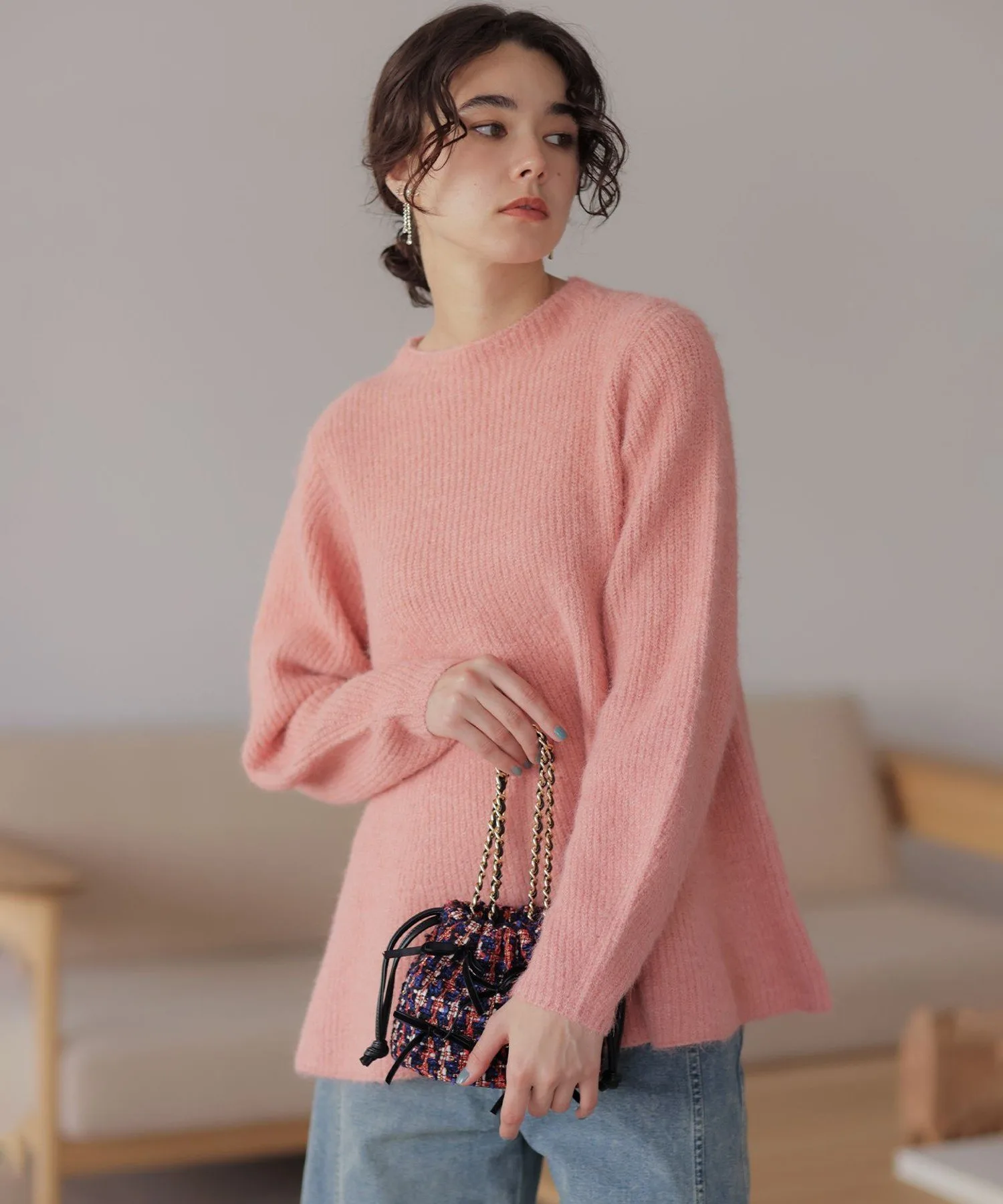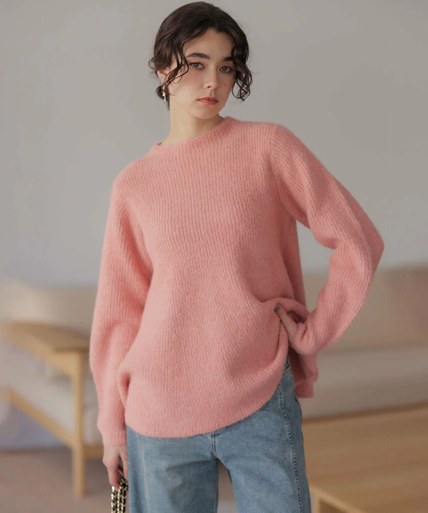 Материал・Благодаря естественному мягкому блеску, пушистый материал легче, чем кажется, обеспечивая комфортное ношение. ・Небольшое количество шерсти придает материалу теплоту и естественность.