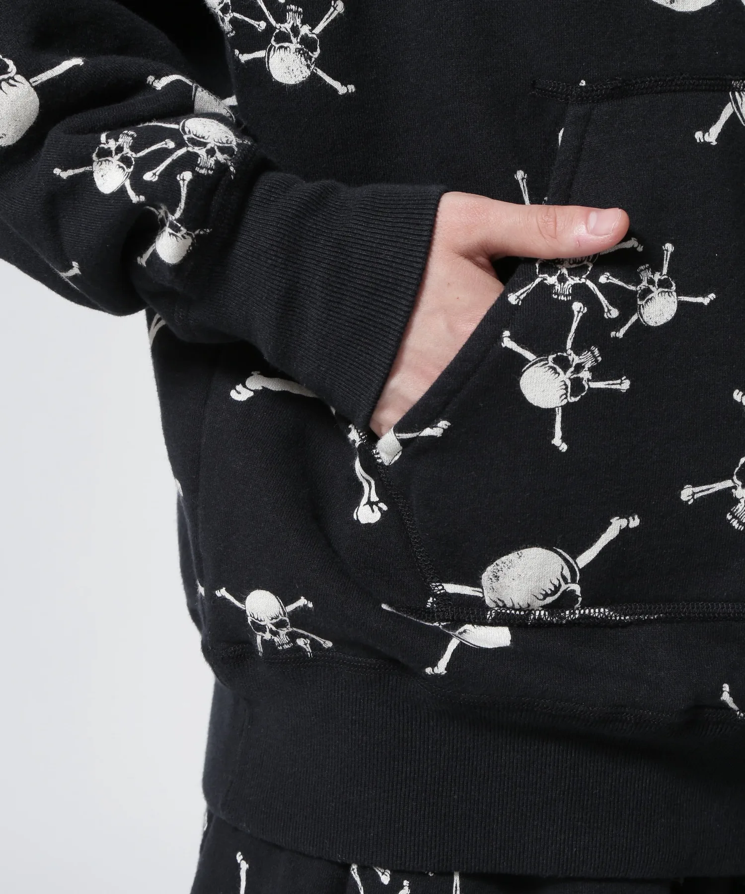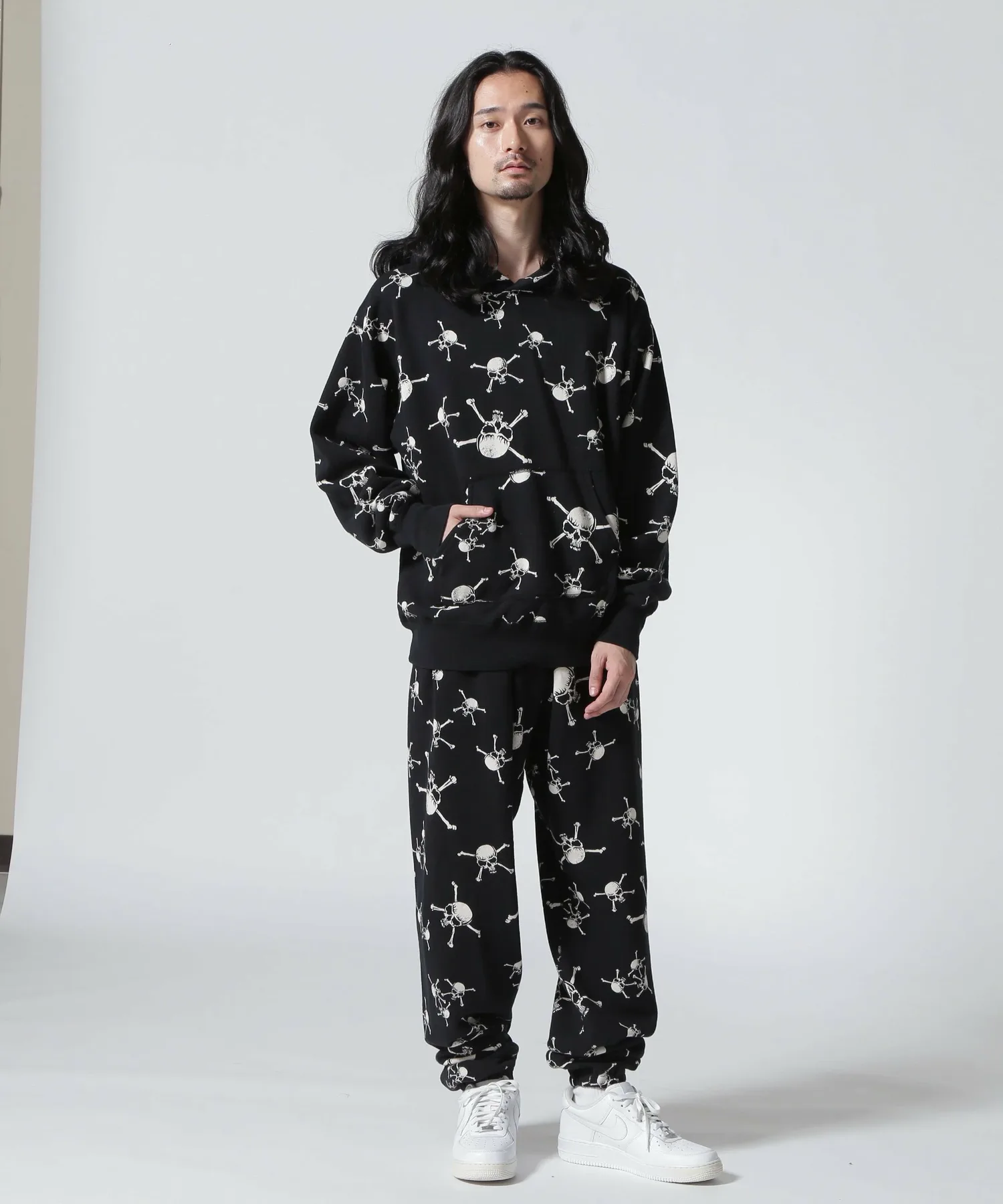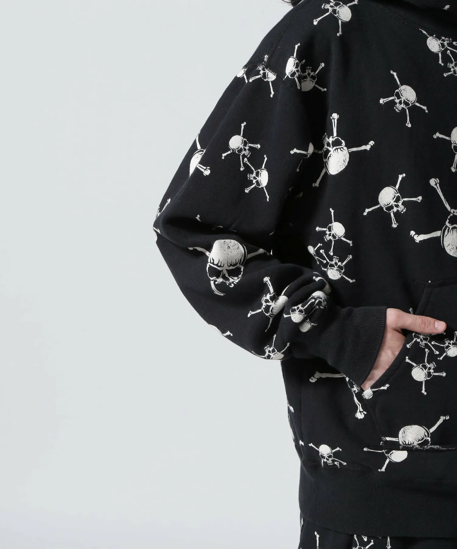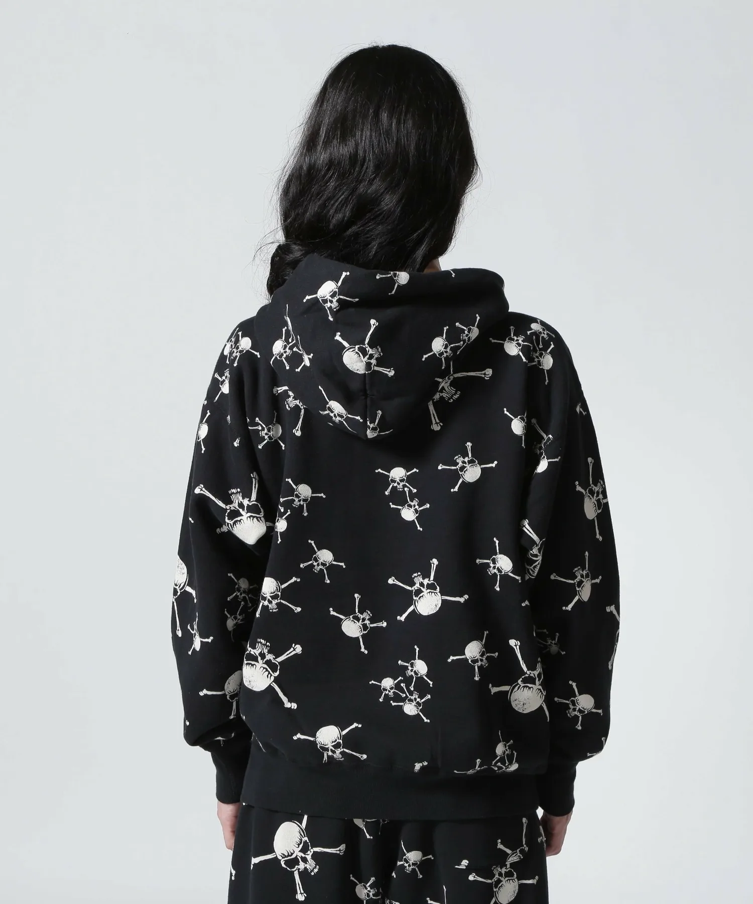 Эта толстовка с капюшоном украшена принтом в виде черепов и костей по всей поверхности. Ее также можно носить в комплекте со спортивными штанами (