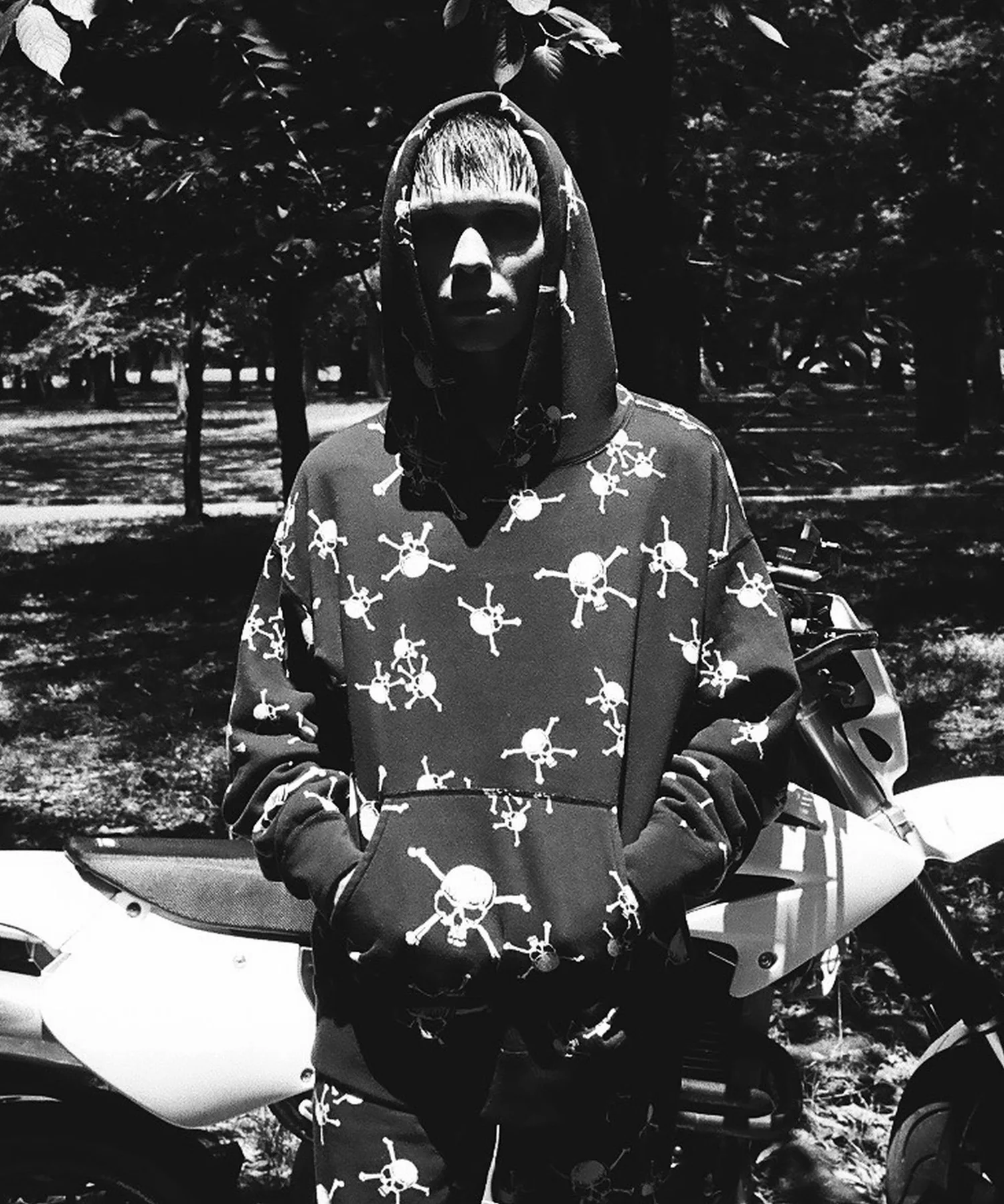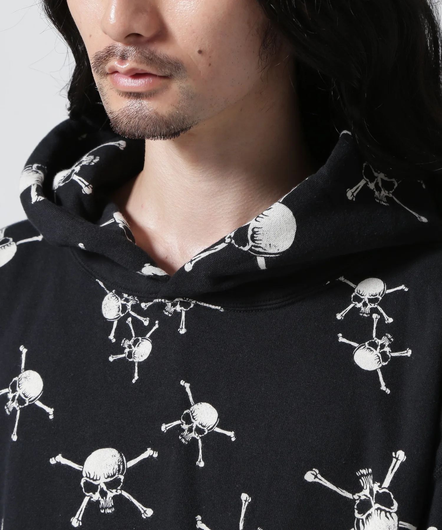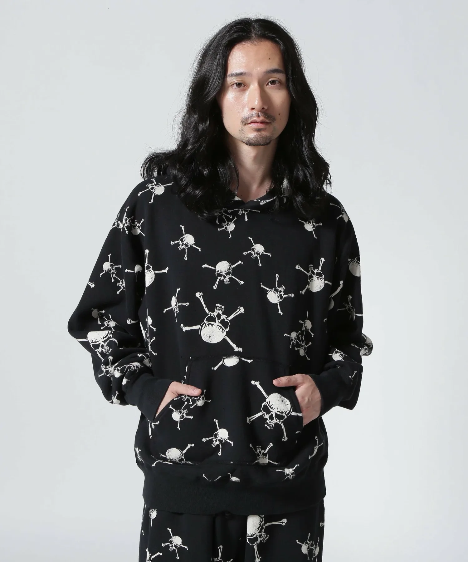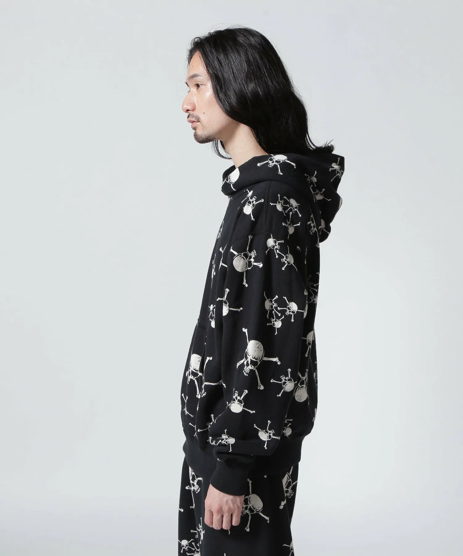 Эта толстовка с капюшоном украшена принтом в виде черепов и костей по всей поверхности. Ее также можно носить в комплекте со спортивными штанами (