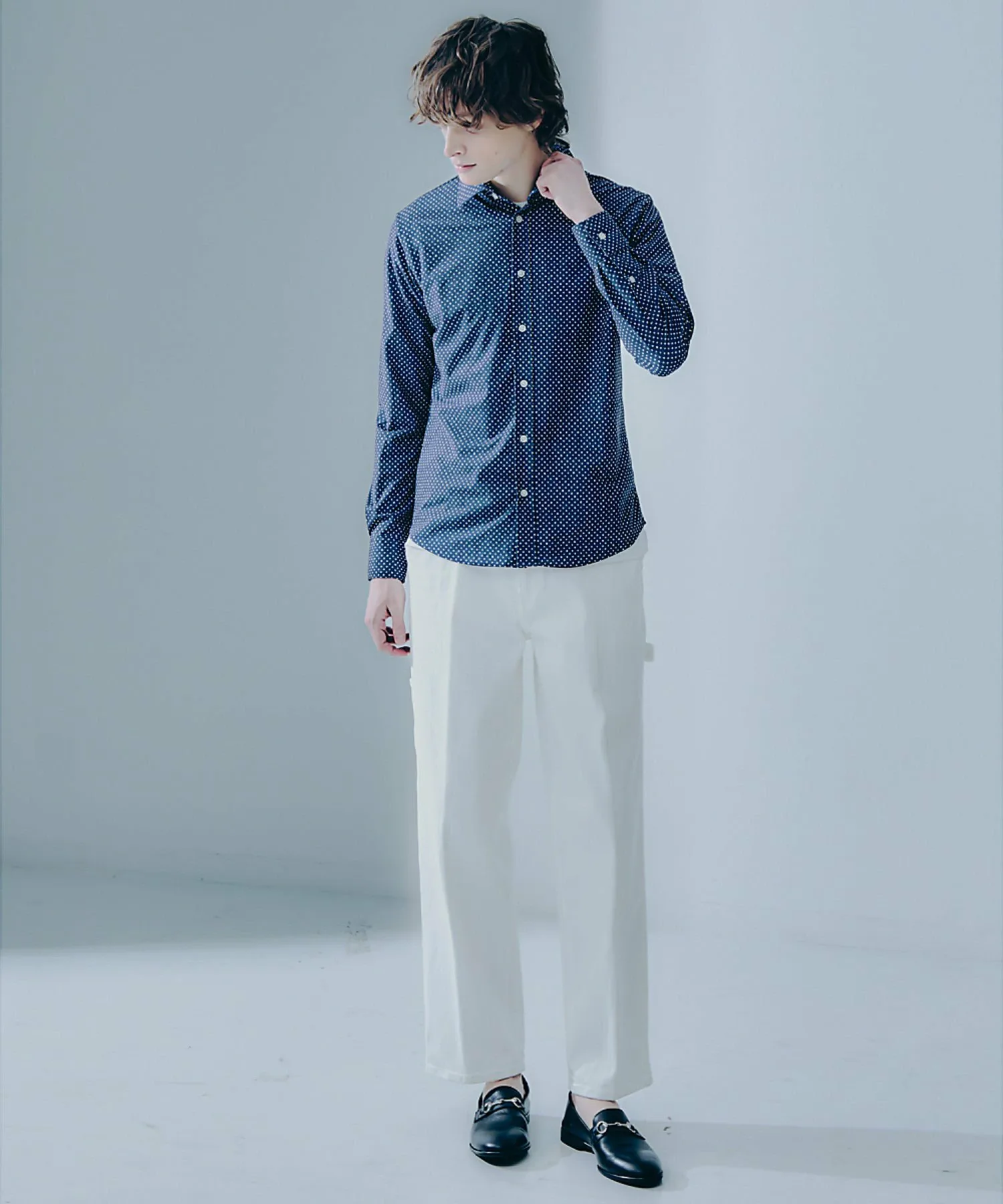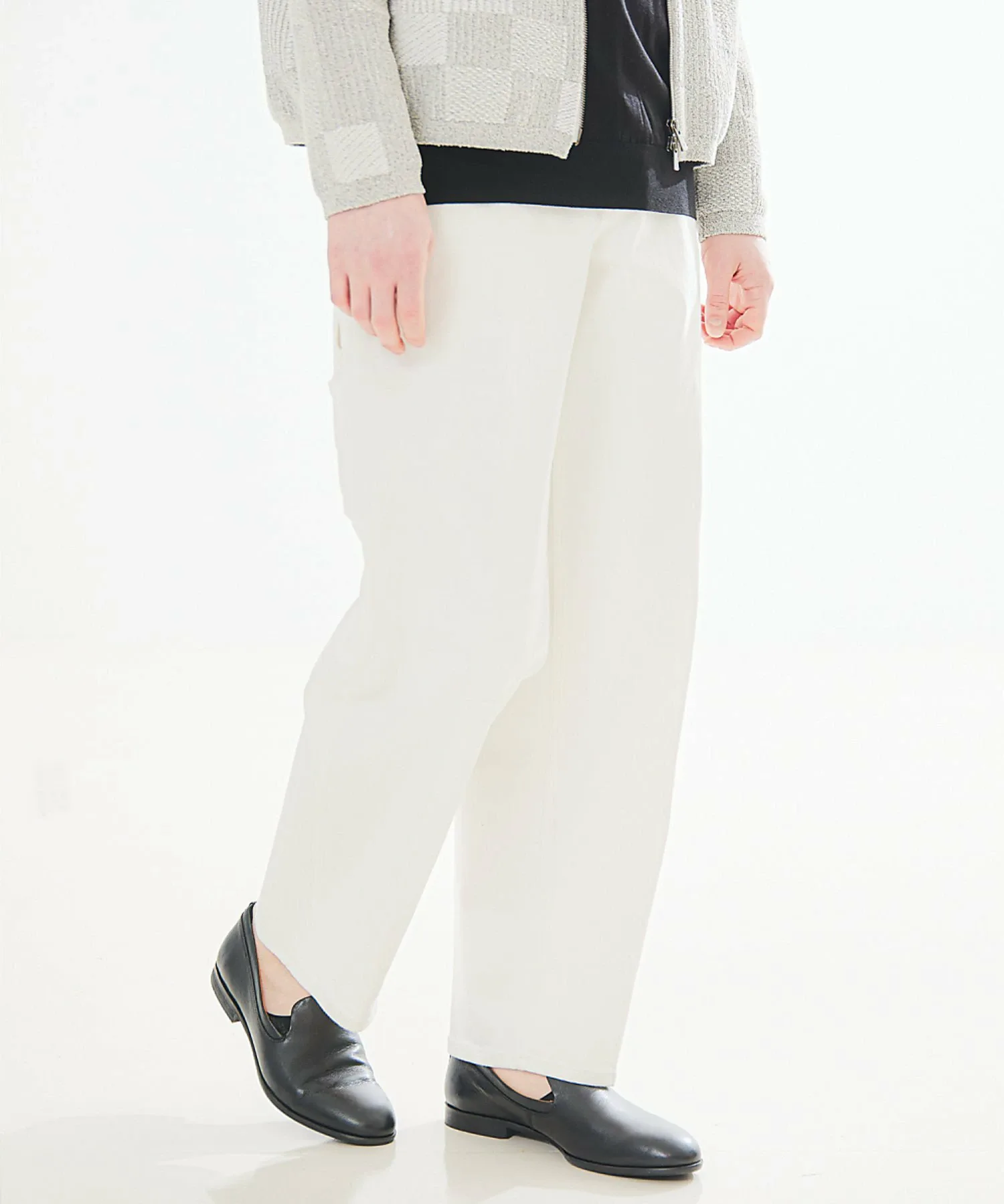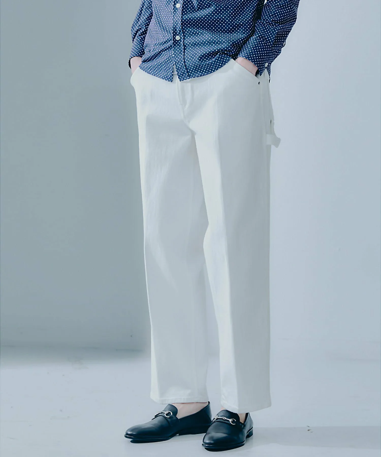 Хотя характеристики и швы рабочих брюк придают им вид джинсов, крой основан на аккуратных брюках, что предотвращает чрезмерную неформальность дизайна. Кроме того, линии сгиба и монохромный дизайн придают рабочим брюкам, которые являются синонимом рабочих брюк, элегантный вид. Широкий силуэт брюк имеет красивую драпировку, подходящую для любого типа фигуры.