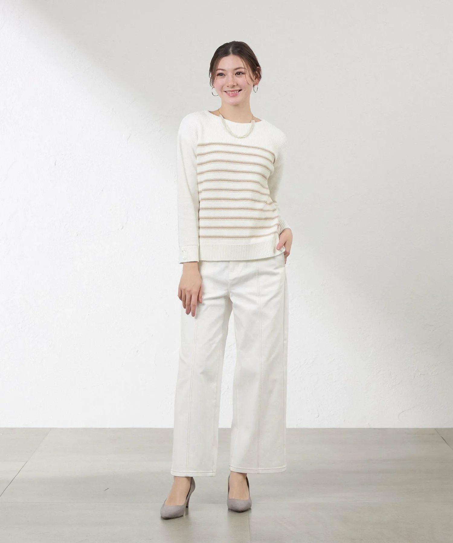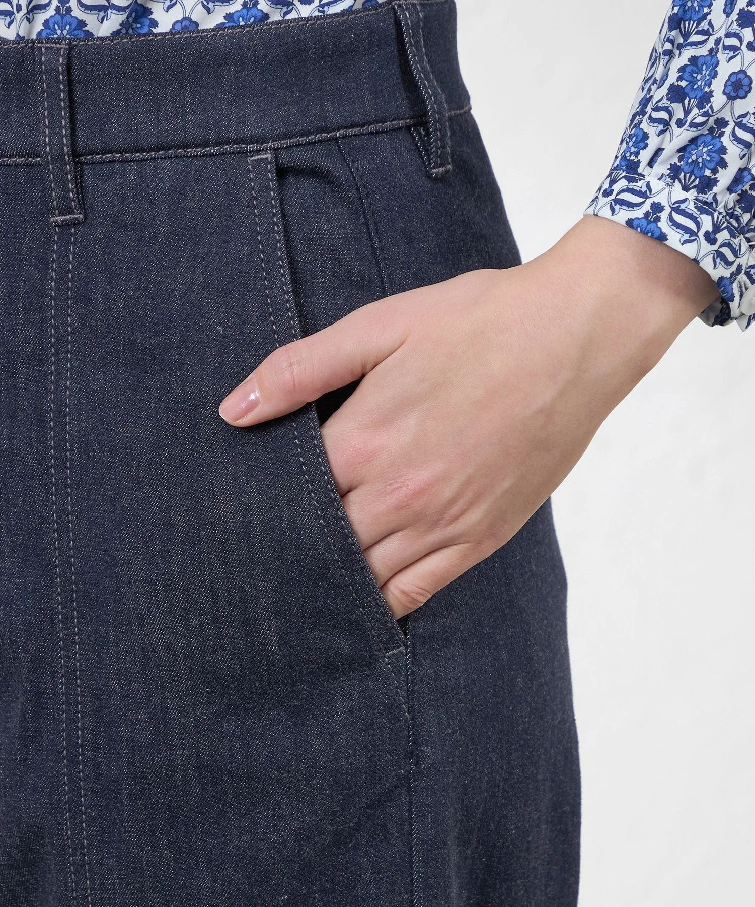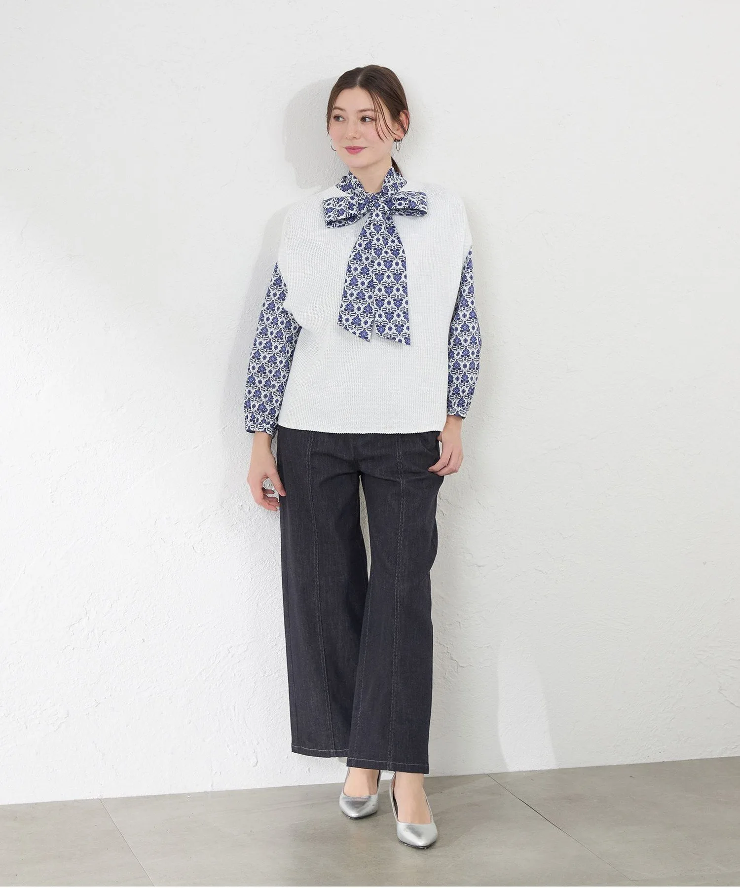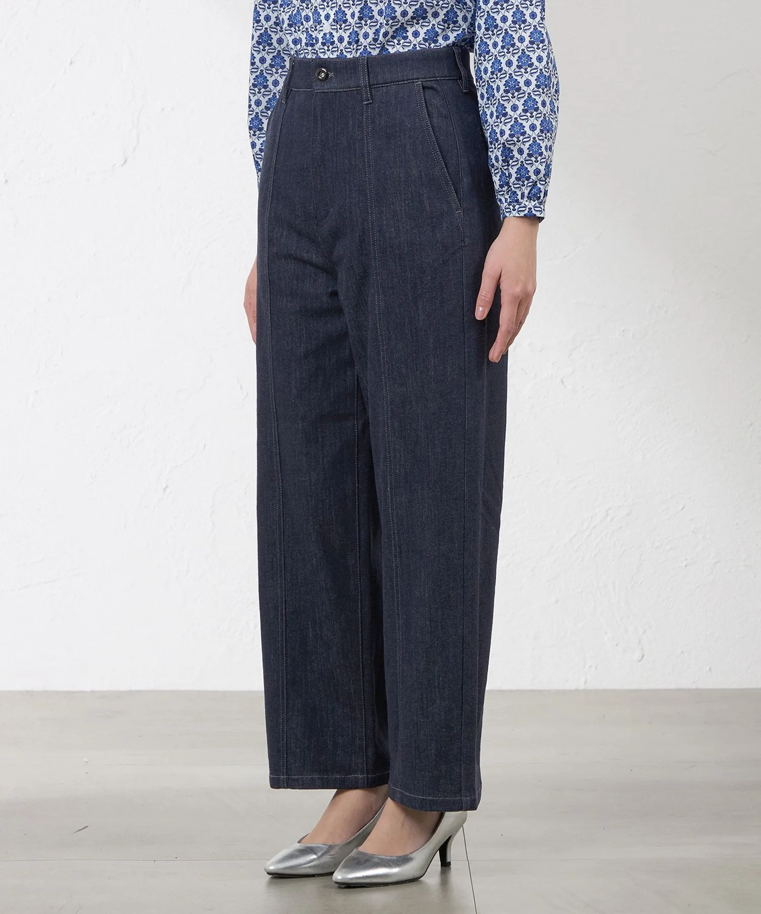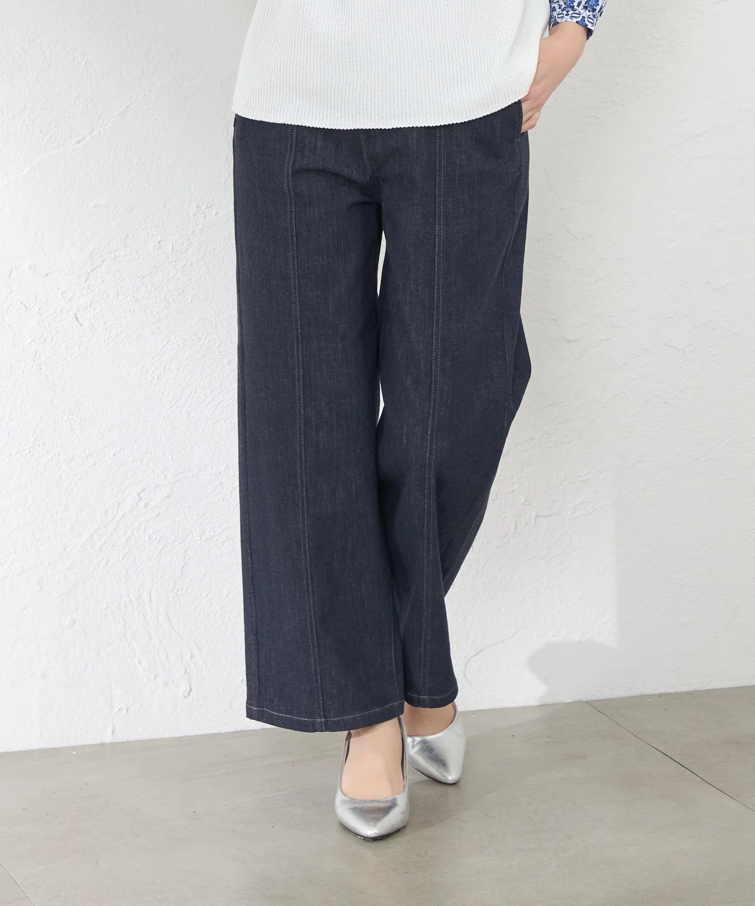 Джинсовые брюки с эффектной строчкой для изысканного, но в то же время повседневного образа. Слегка приталенный прямой силуэт обеспечивает необходимый объем, подчеркивая фигуру и создавая естественный, струящийся силуэт. Передняя и боковая строчка подчеркивает вертикальные линии, выгодно выделяя фигуру. Этот инновационный джинсовый материал был создан в сотрудничестве с ведущим японским производителем джинсовой ткани. Он отличается эластичностью, мягкой текстурой и легкостью, обеспечивая комфорт и стильный внешний вид. *Этот продукт был сфотографирован с использованием образца. Изображения и характеристики могут отличаться от реального продукта. Рост: 164 см, Обхват груди: 80 см, Обхват талии: 59 см, Обхват бедер: 90 см, Размер: 38