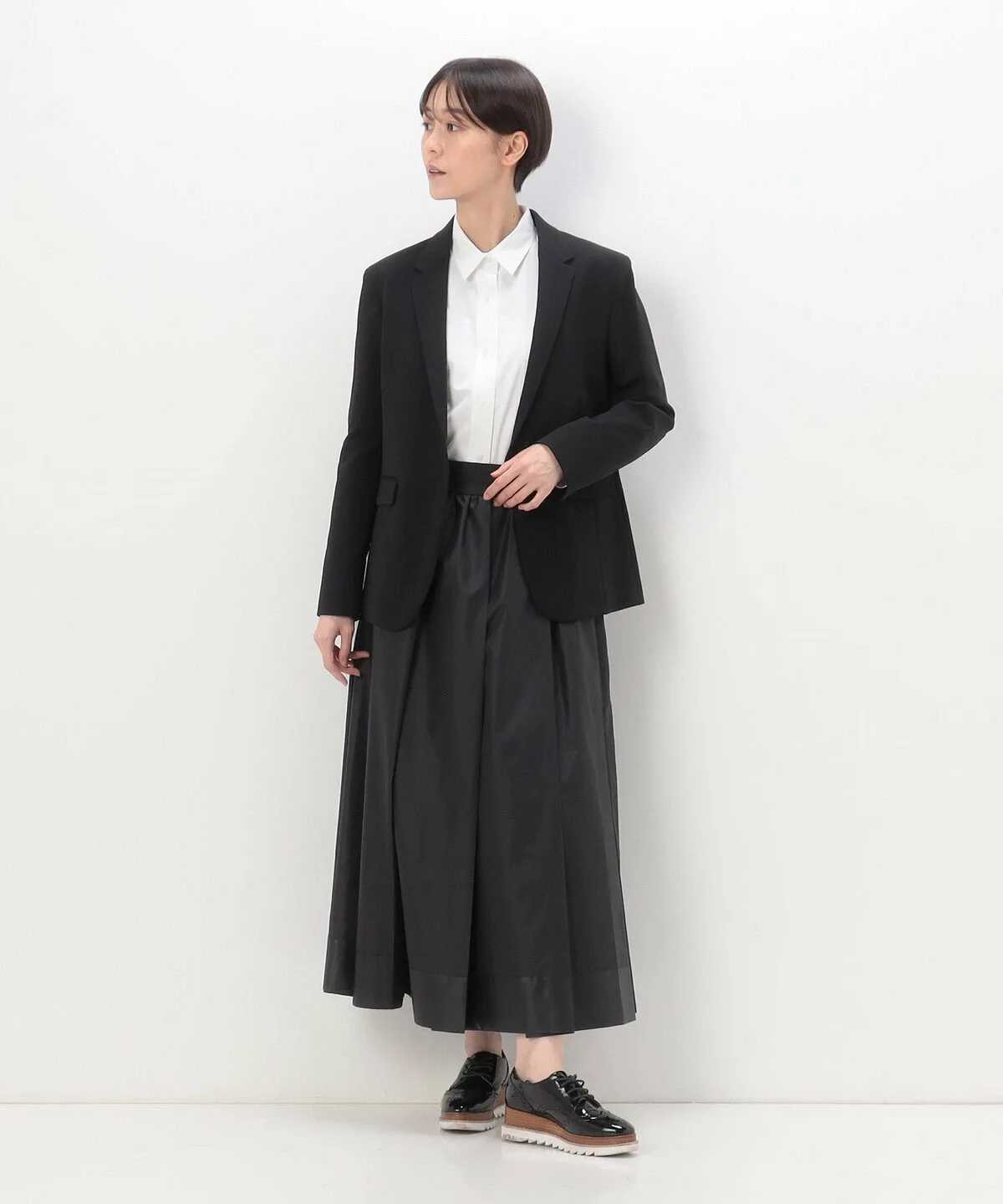 Талия завышена благодаря широкому поясу, а четыре складки спереди и сзади создают плотный объем глубоко внутри складок.