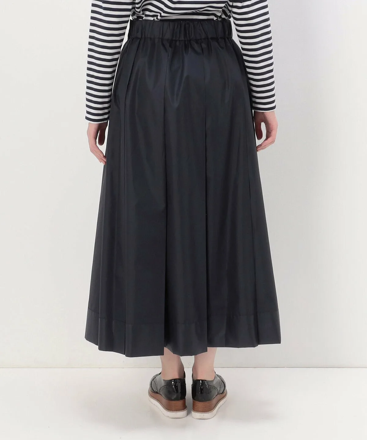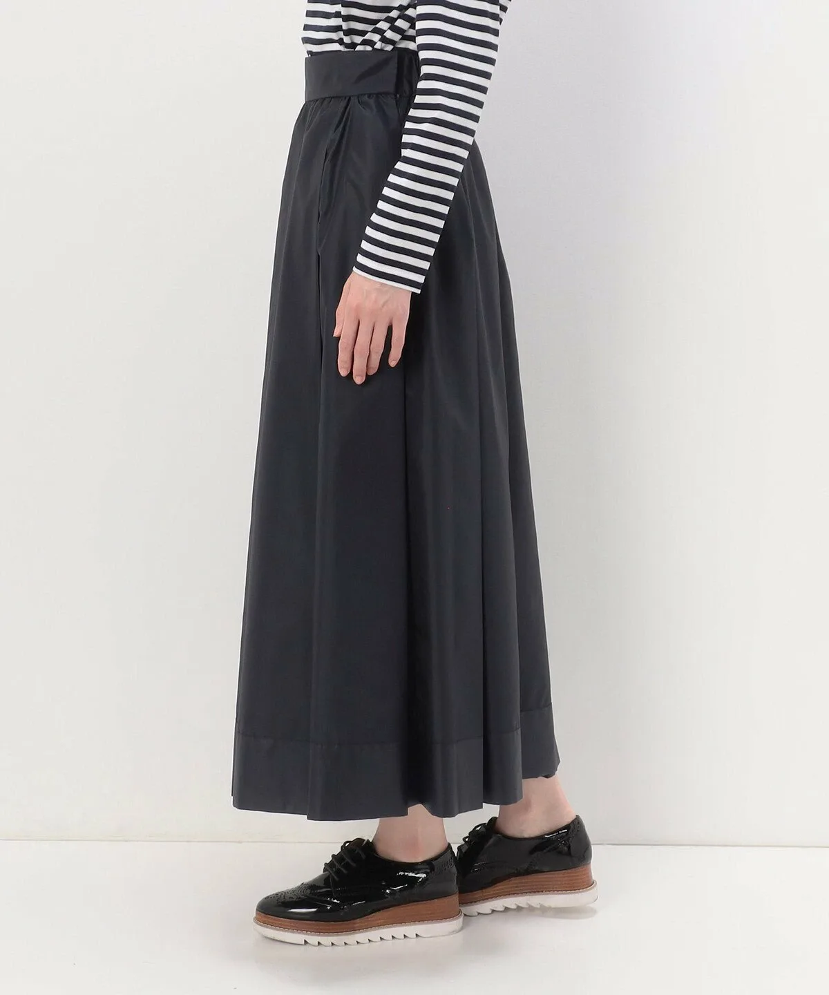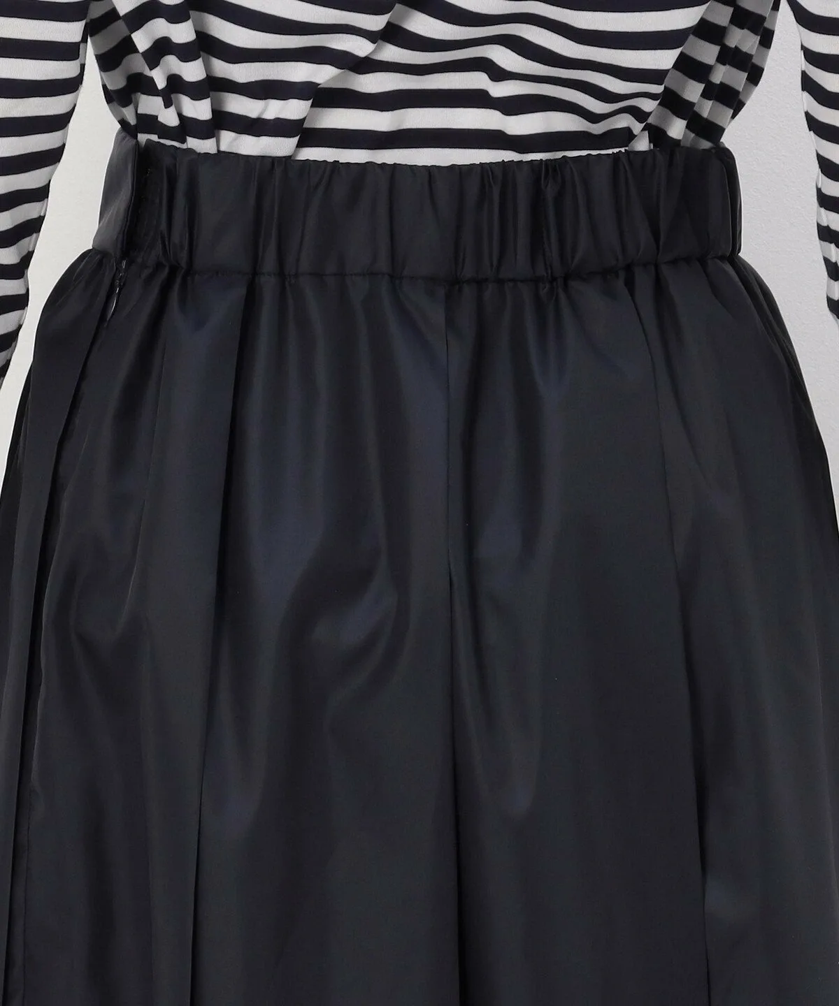 Талия завышена благодаря широкому поясу, а четыре складки спереди и сзади создают плотный объем глубоко внутри складок.