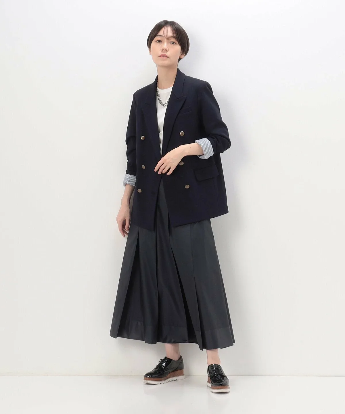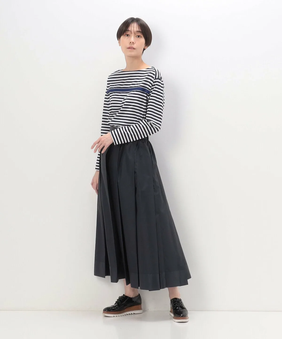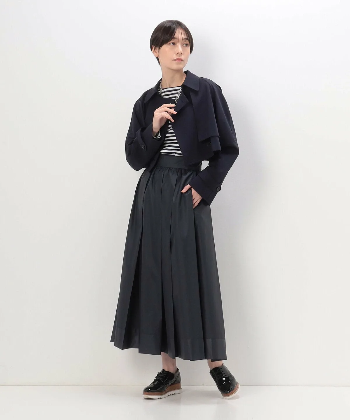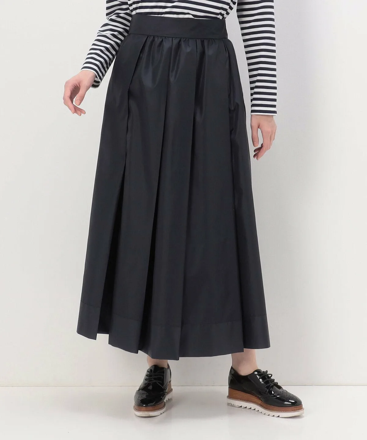 Талия завышена благодаря широкому поясу, а четыре складки спереди и сзади создают плотный объем глубоко внутри складок.