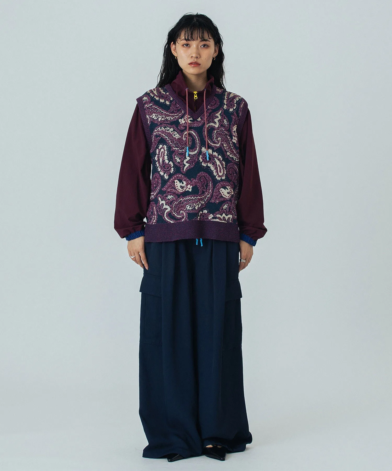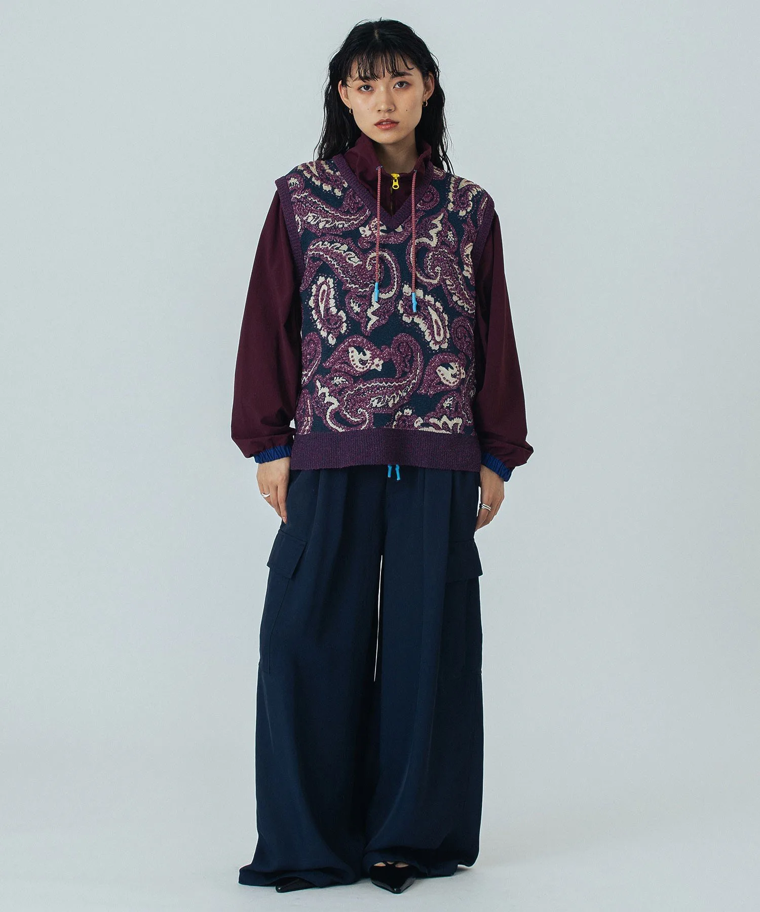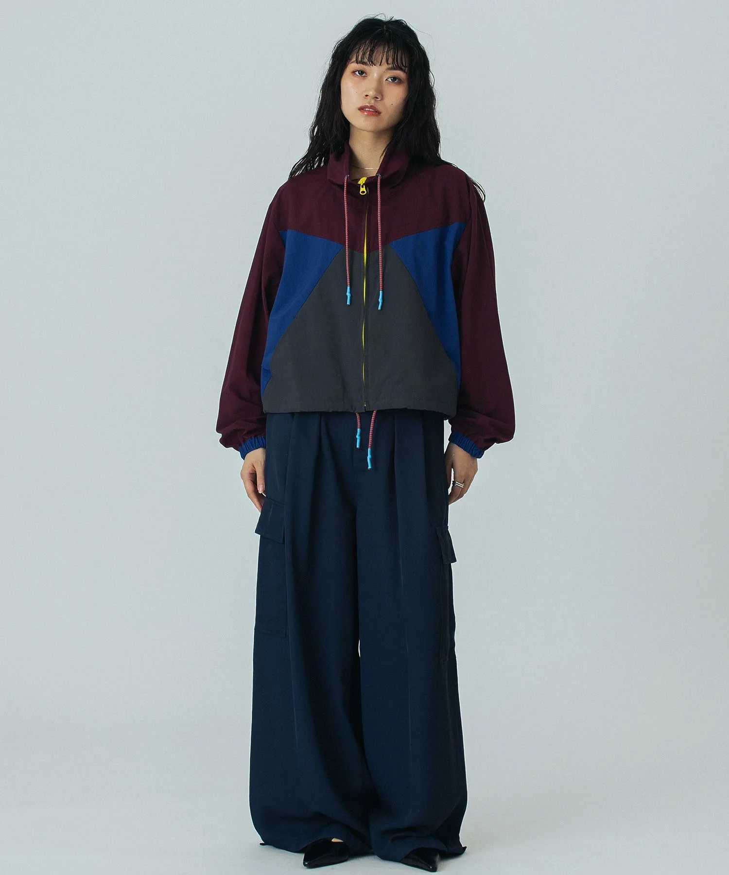 - Широкая лента проходит по низу, позволяя регулировать плотность посадки для создания различных силуэтов.