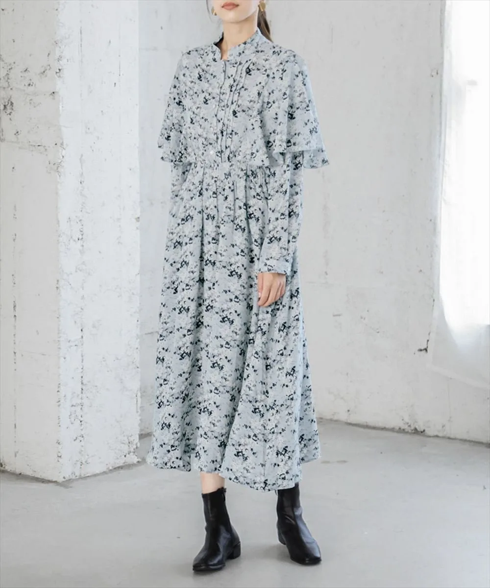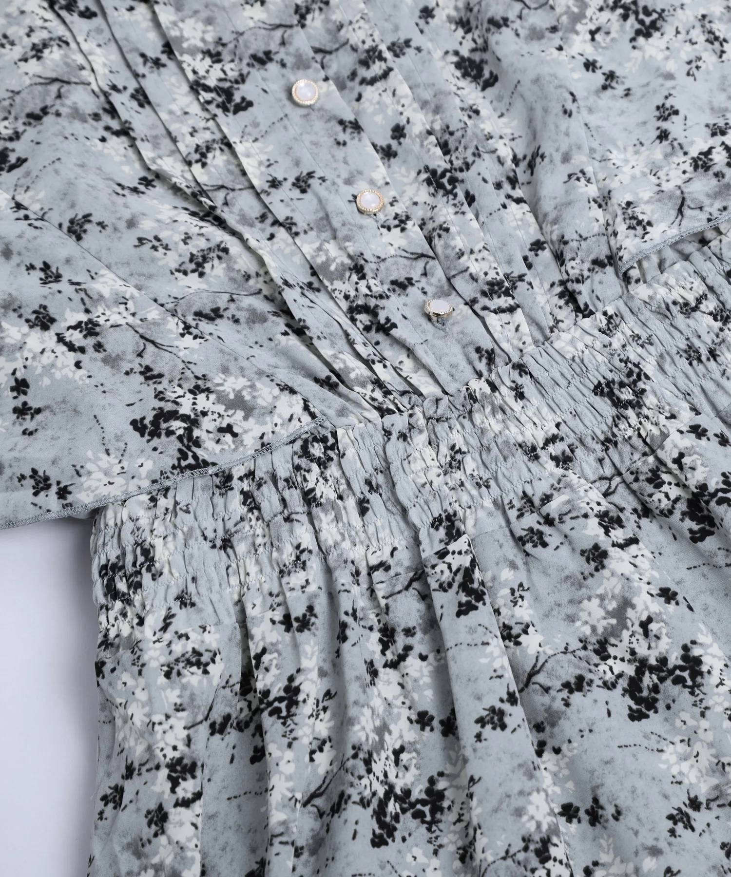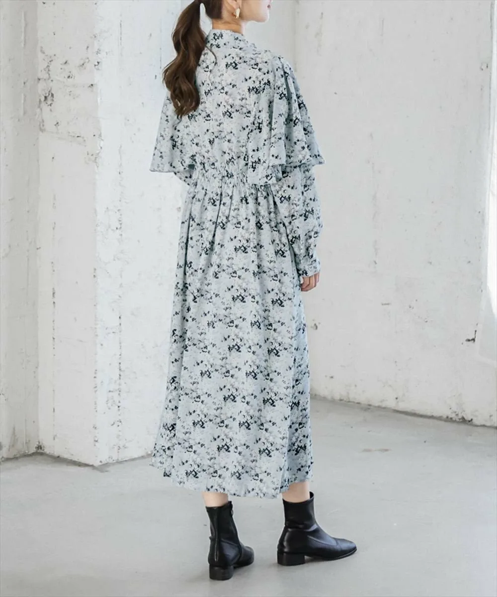 Ретро-цветочный узор привлекает внимание, а оборки придают платью женственный вид.
