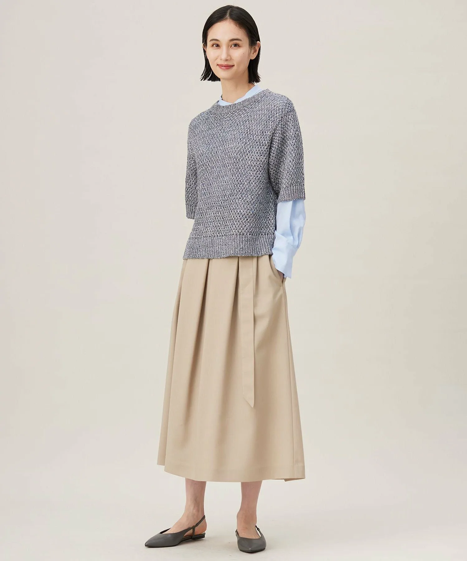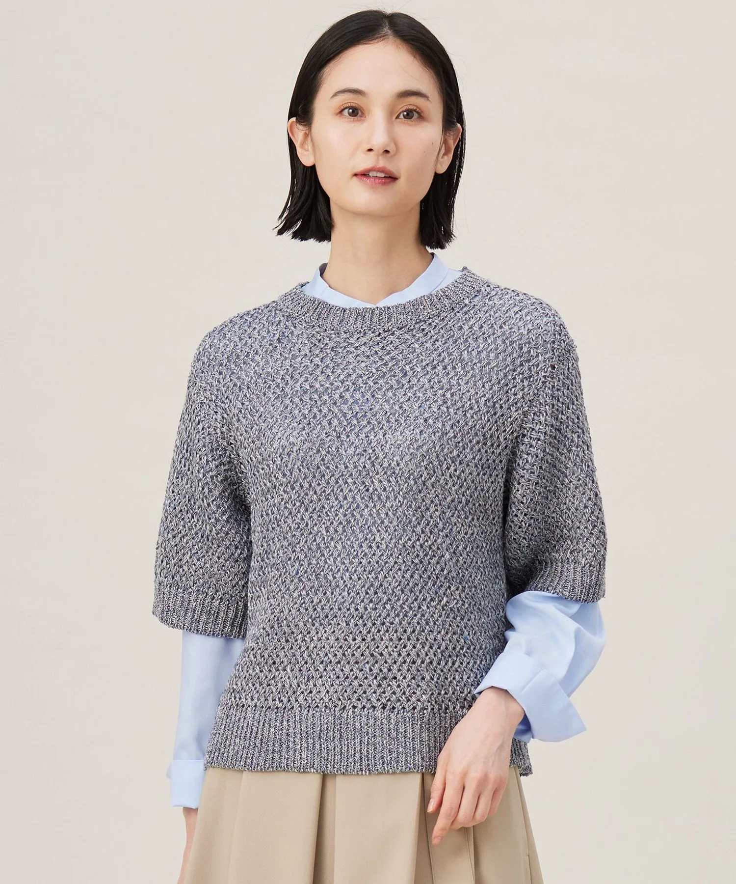 Объемный трикотажный свитер с короткими рукавами, отличающийся уникальным цветом и текстурой. Дизайн: Этот свитер с короткими рукавами имеет узор, напоминающий корзинку. Лен, известный своим уникальным цветом и текстурой, дополнительно подчеркивается меланжевой смесью и многослойной пряжей, в результате чего получается объемный, изысканный свитер. Носите его с модной рубашкой или майкой для создания текстурированного сетчатого образа. Материал: Эта ткань изготовлена из меланжевого льна, впервые разработанного компанией LINIFICIO, давним итальянским производителем льняной пряжи. Тщательно подобранные методы окрашивания повышают износостойкость, а дополнительное окрашивание усиливает глубину цвета. Небольшие блестки добавляют сияния и элегантности.