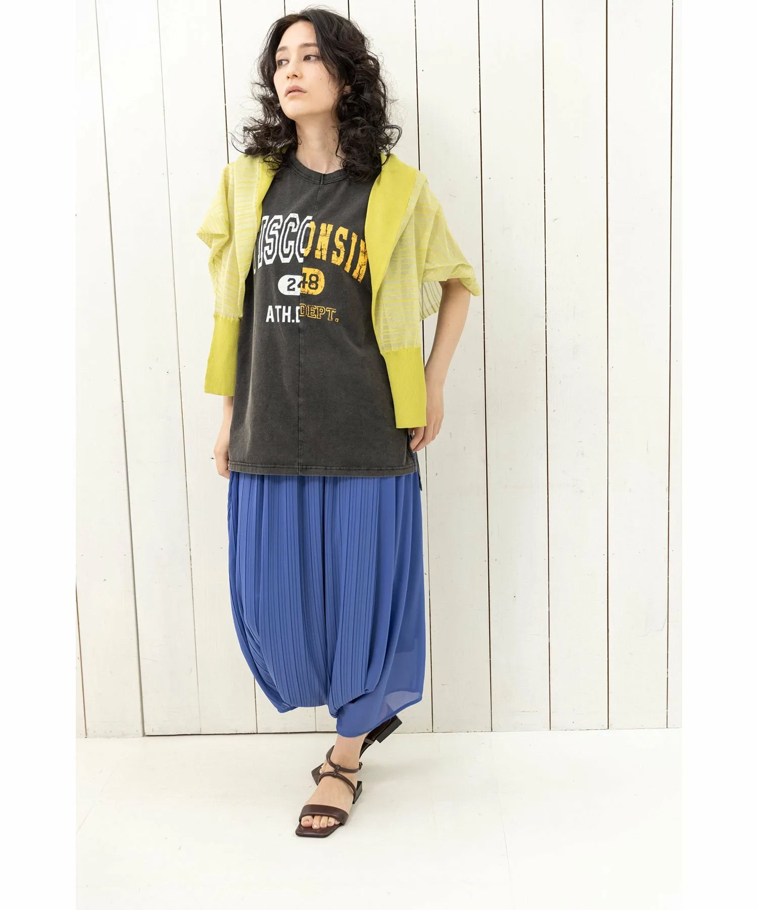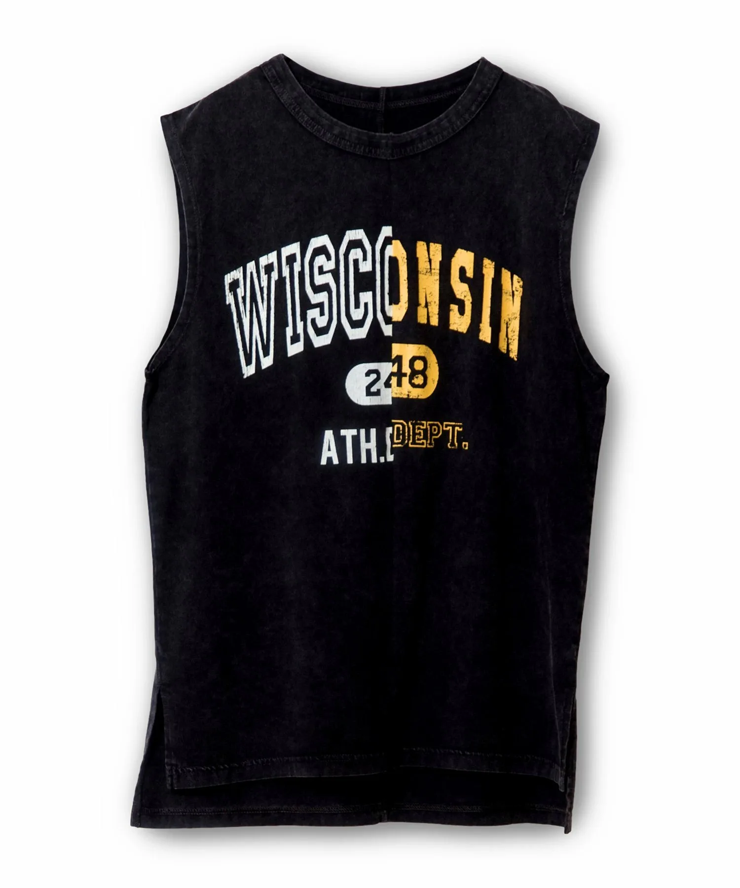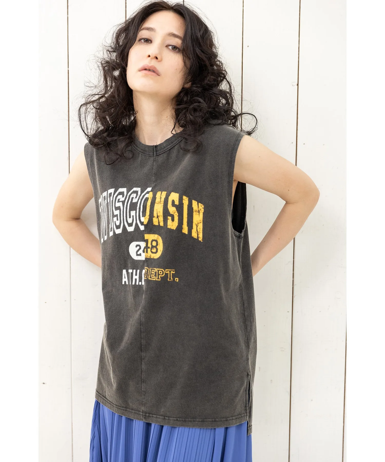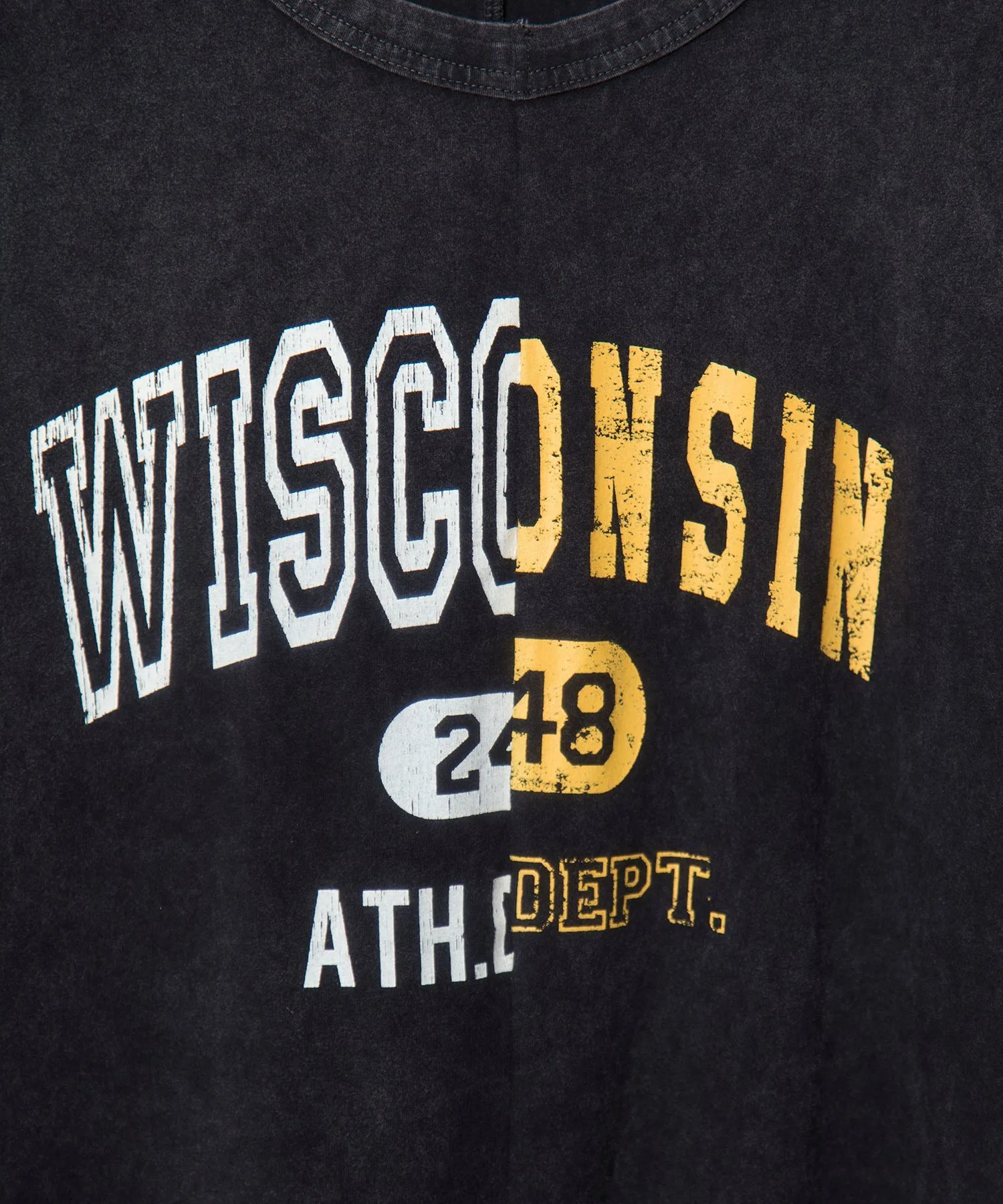 Майка, напоминающая ремейк футболки с логотипом колледжа. Благодаря винтажной текстуре она создает изысканный образ.