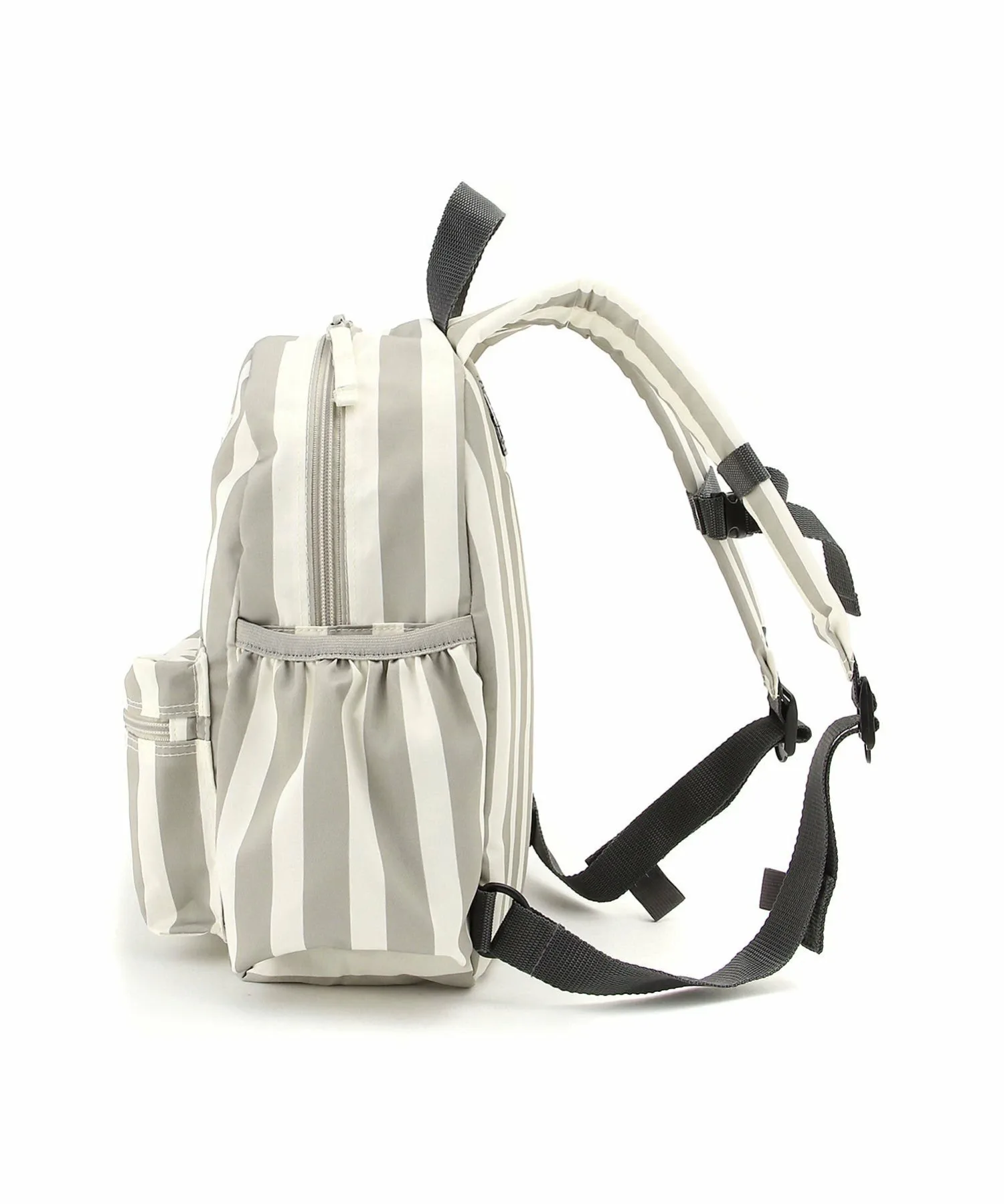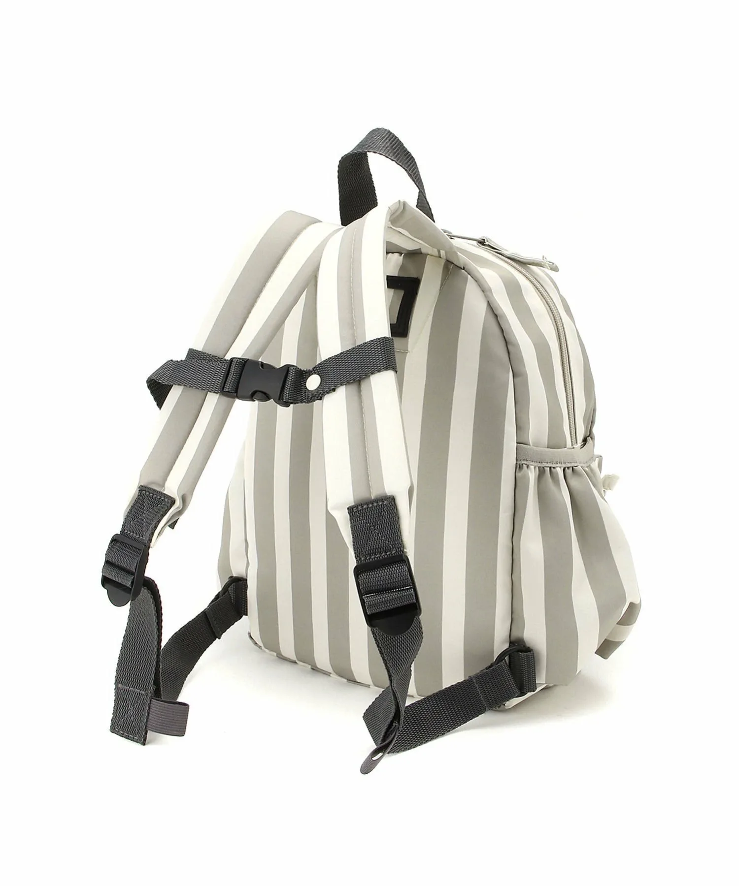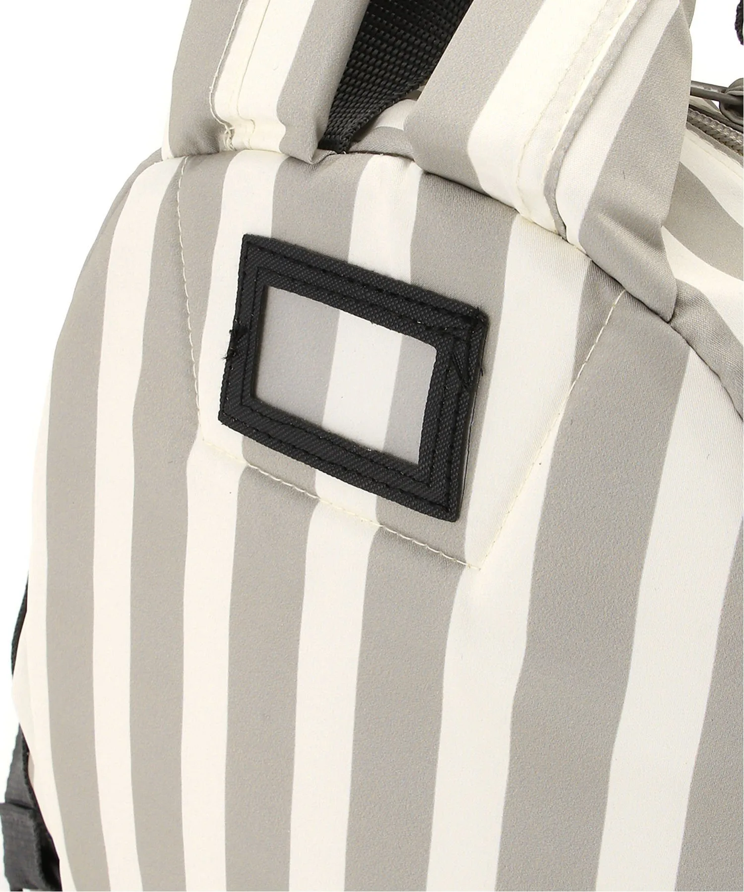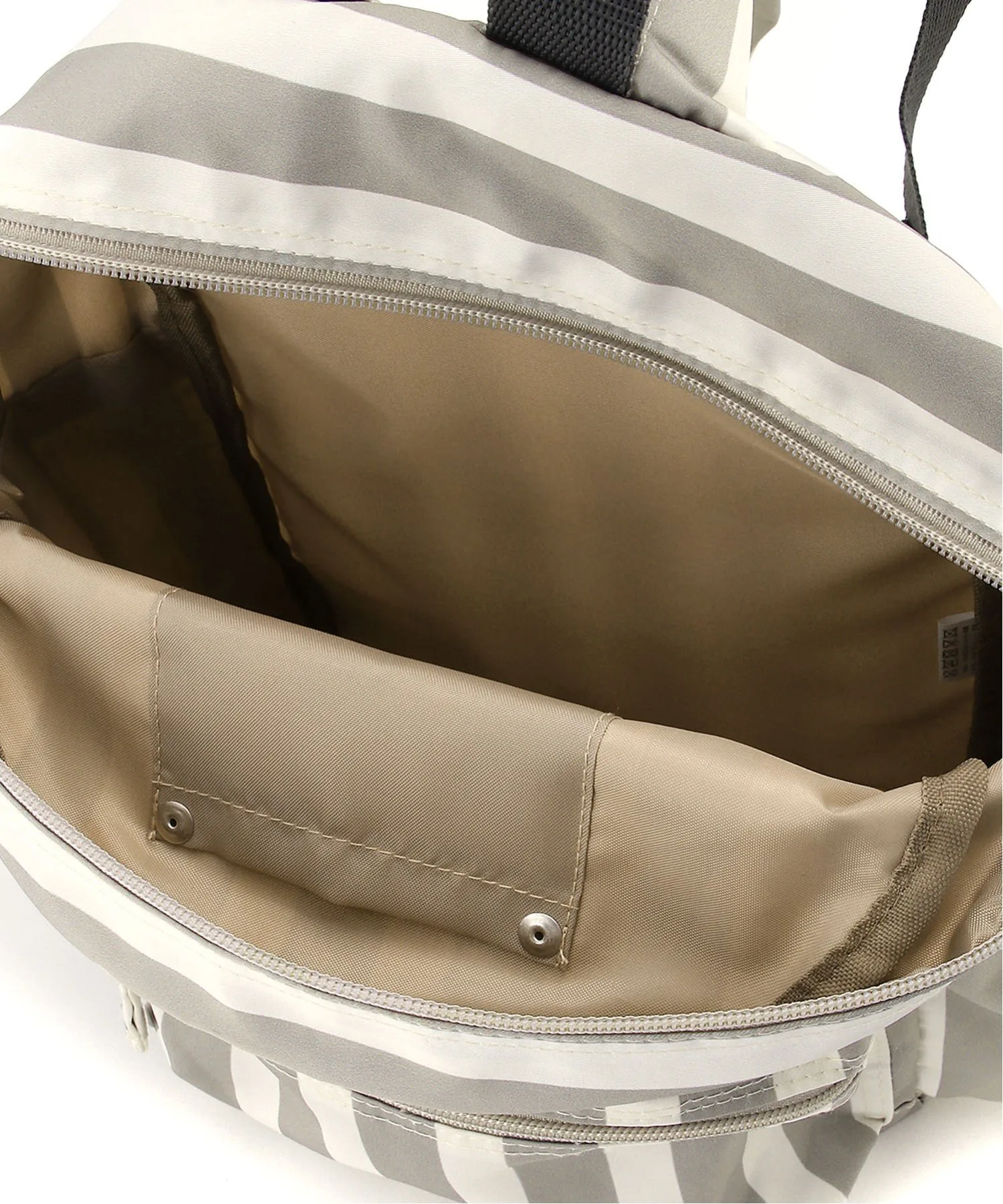 Рюкзак с узором из случайных точек натурального цвета и однотонным полосатым принтом по всей поверхности.