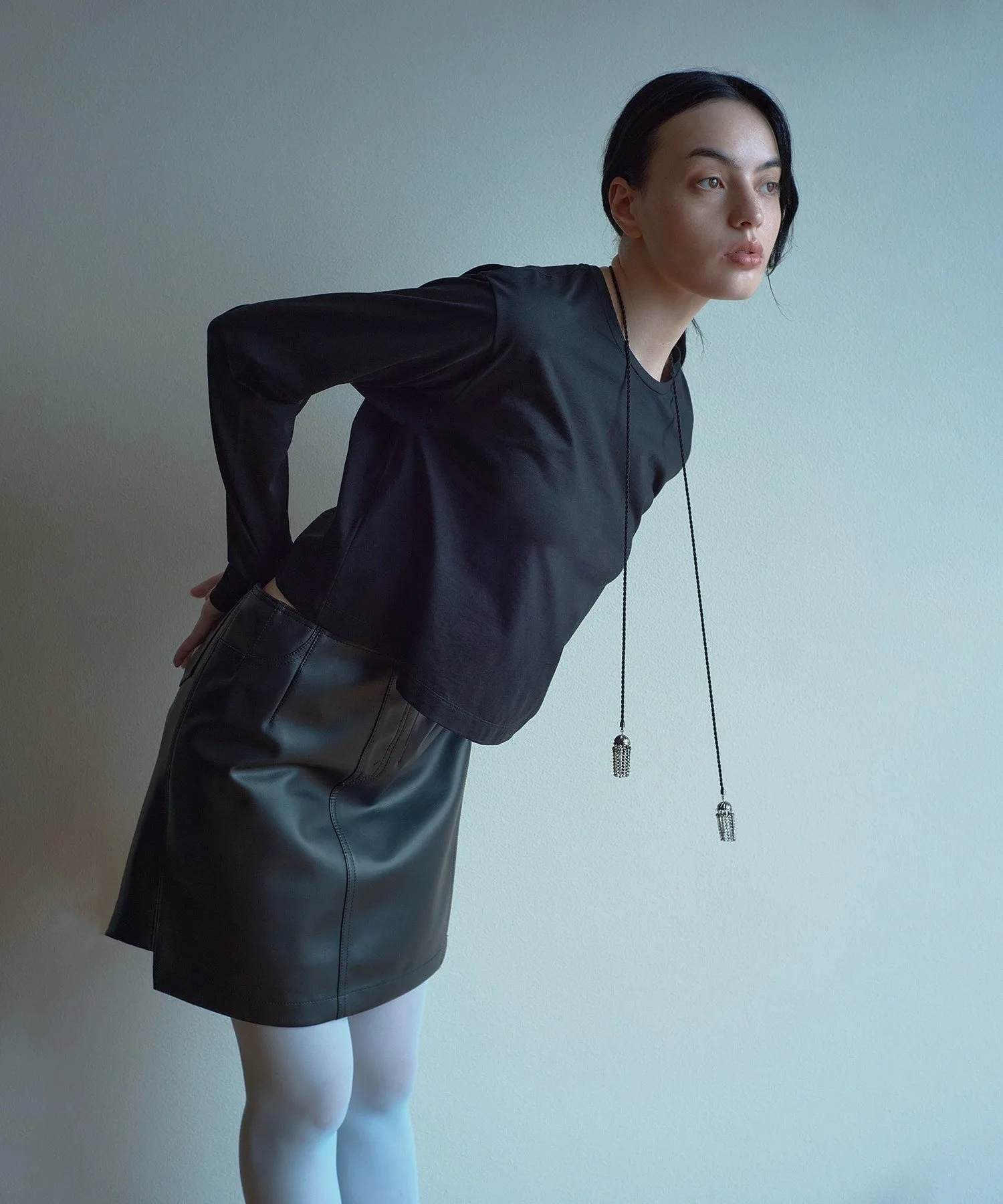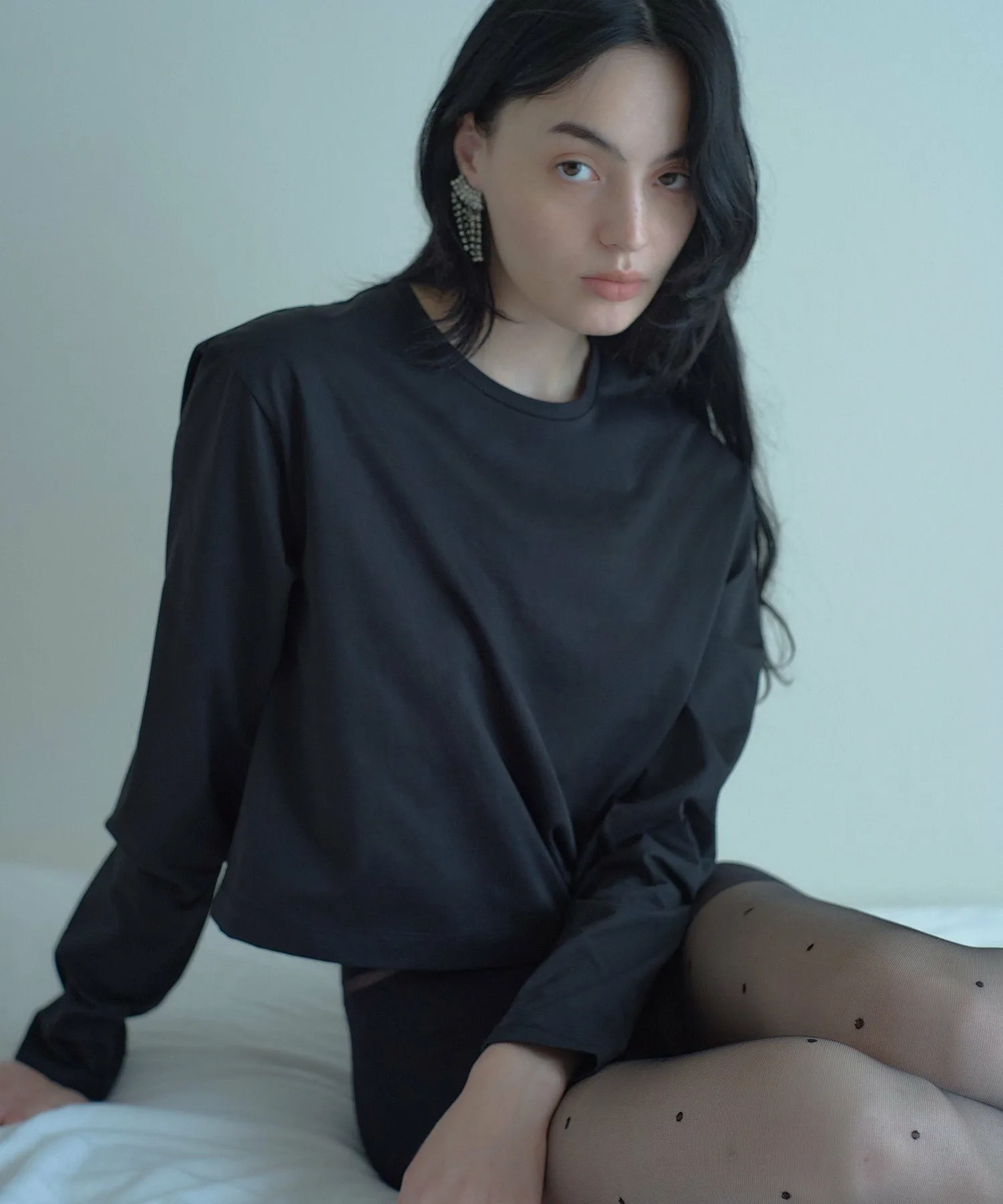 Топ, сшитый по индивидуальному заказу, отличается шелковистой гладкостью и блеском, а также мягкостью и идеальной драпировкой.Связанный высокой плотностью на редкой отечественной вязальной машине, он максимально сохраняет свою эластичность.В сочетании с блеском украшений он придает образу чистоту и изысканность, делая его более городским и утонченным.Несмотря на свободный силуэт, его можно носить с женственным настроением.Короткая длина и слегка удлиненные рукава обеспечивают простой и очень разумный баланс.